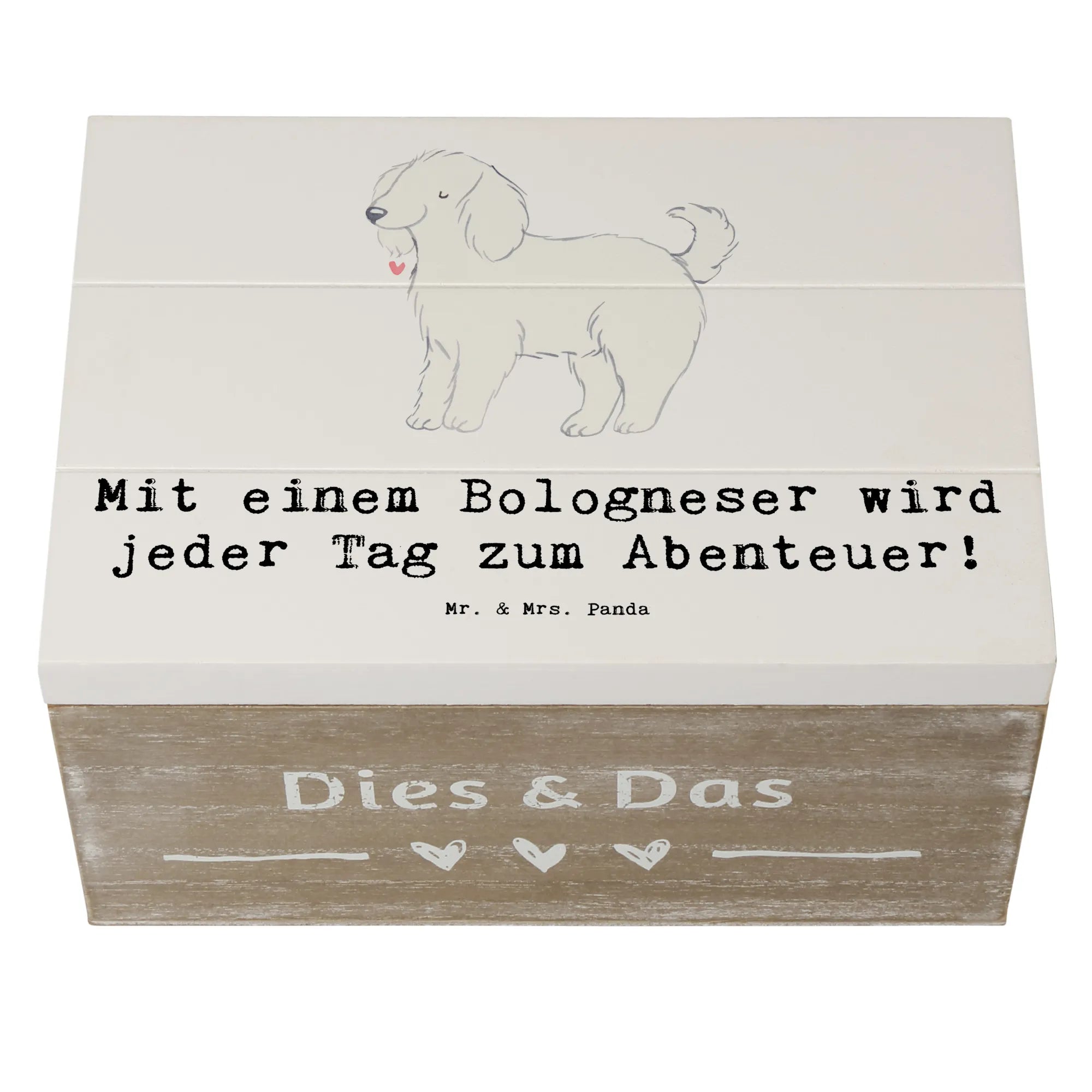Eine Holzkiste von Mr. & Mrs. Panda ist nicht einfach nur ein Aufbewahrungsort, sie ist ein Zuhause für deine wertvollsten Momente. Stell dir vor, du hältst eine wunderschön verarbeitete Schatulle in den Händen, auf deren Deckel ein zauberhafter Bologneser strahlt. Dieser kleine, weiße Wirbelwind steht für Lebensfreude und tägliche Abenteuer. 🐾