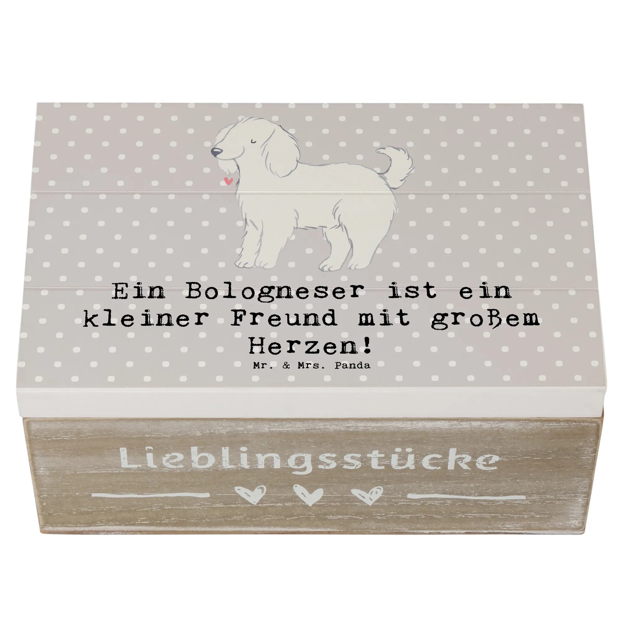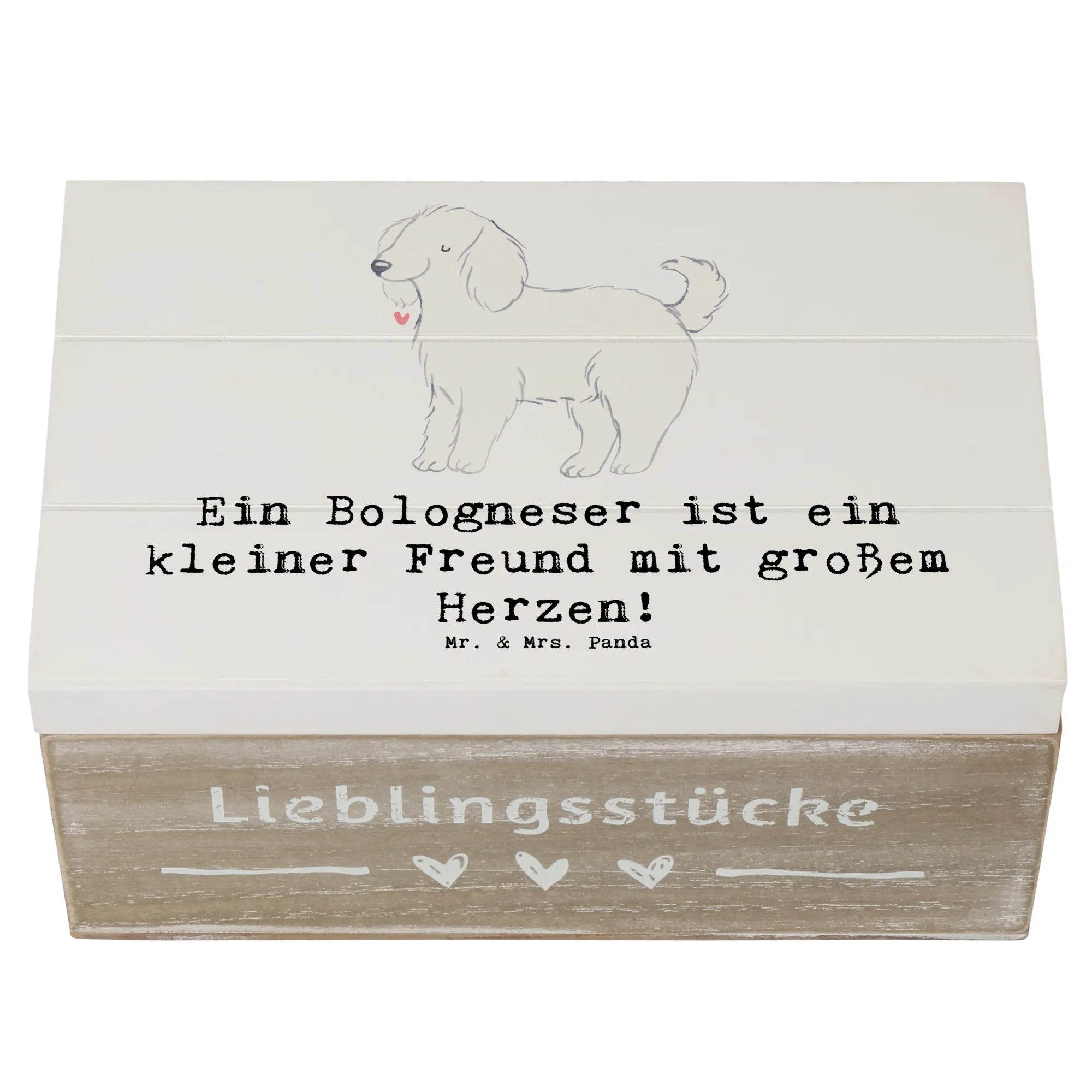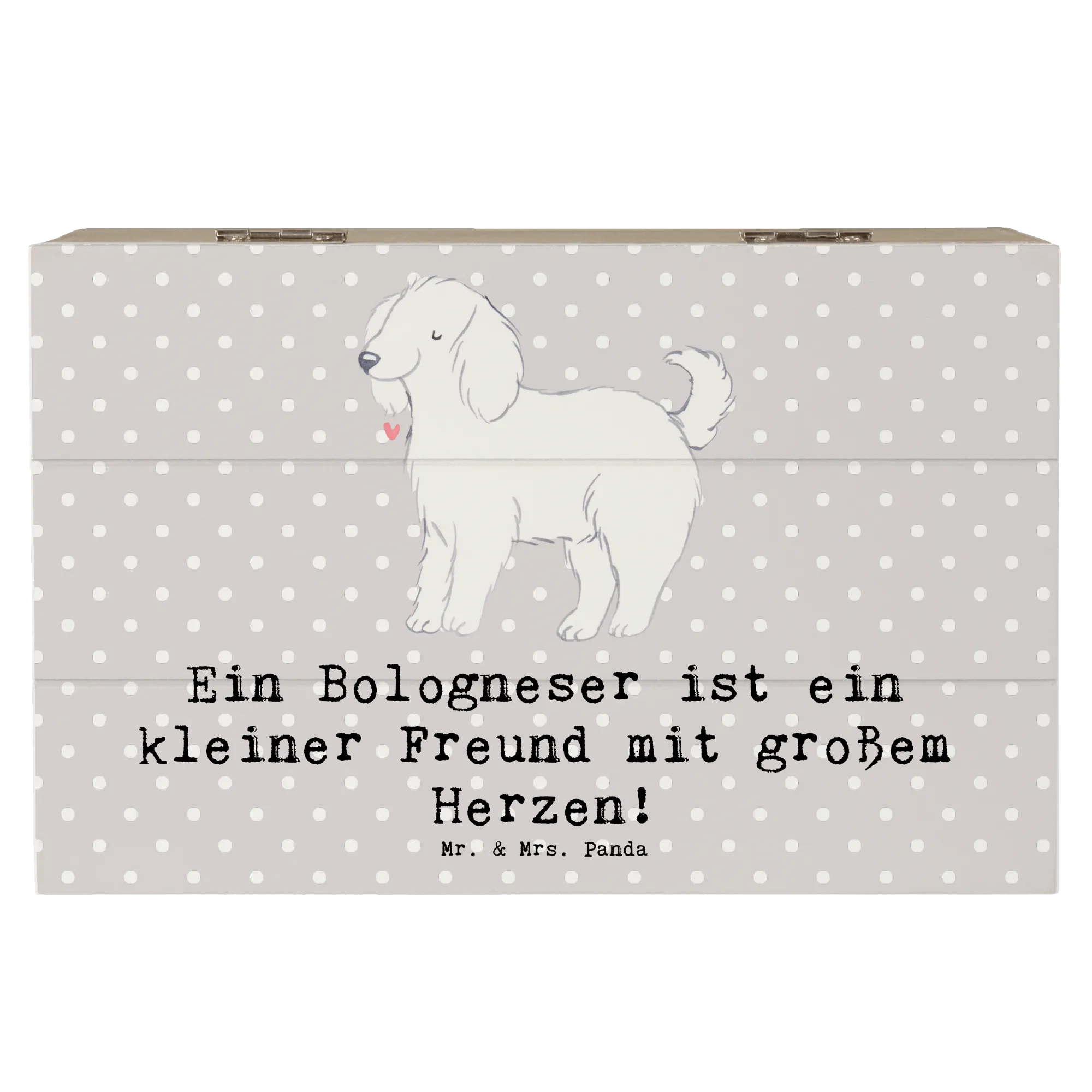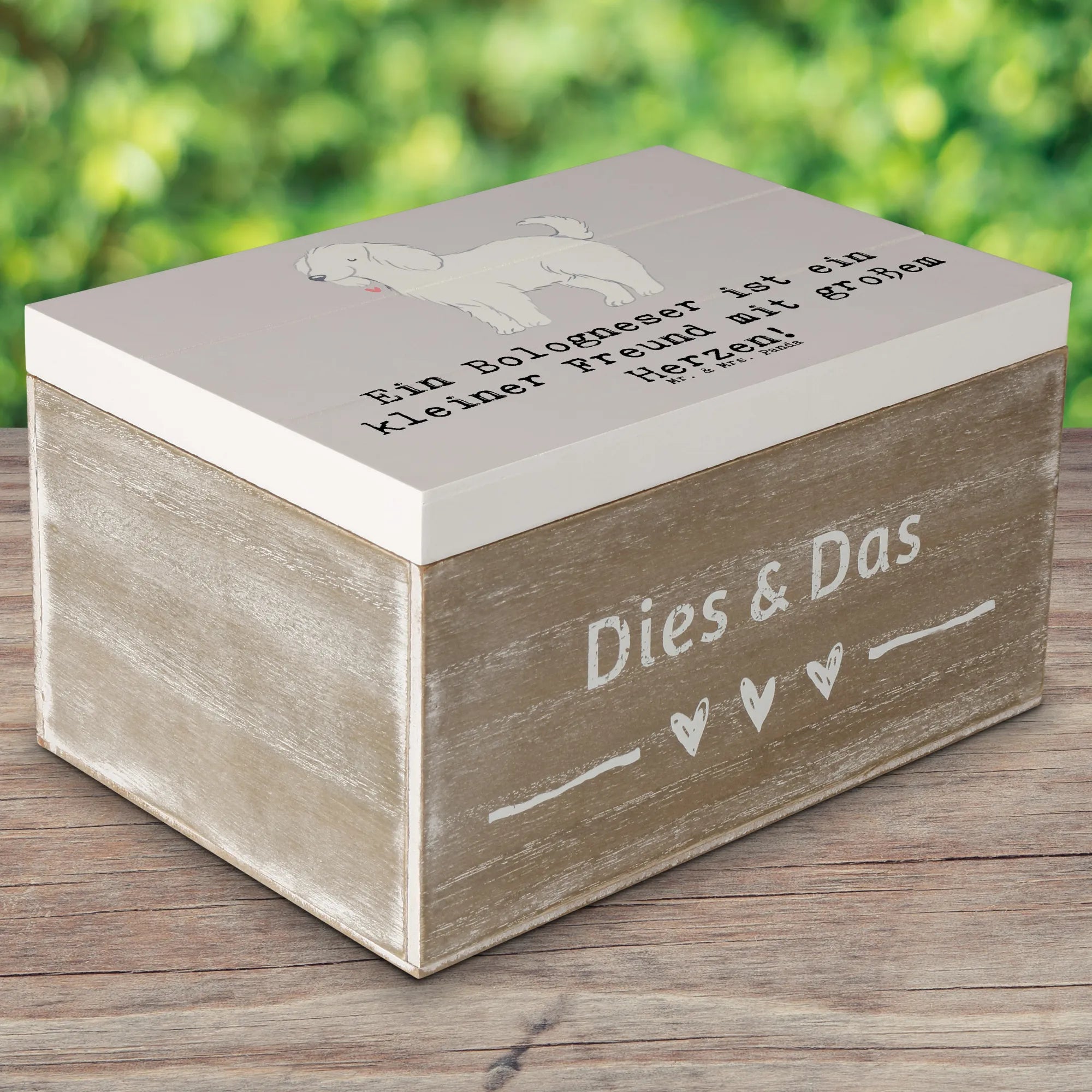 Entdecke die zauberhafte Holzkiste von Mr. & Mrs. Panda, die mit einem liebevollen Bologneser-Motiv und dem Slogan "Ein Bologneser ist ein kleiner Freund mit großem Herzen!" bedruckt ist. Diese wunderschöne Holzkiste ist nicht nur ein Blickfang, sondern auch der perfekte Ort, um all deine wertvollen Erinnerungen aufzubewahren.
