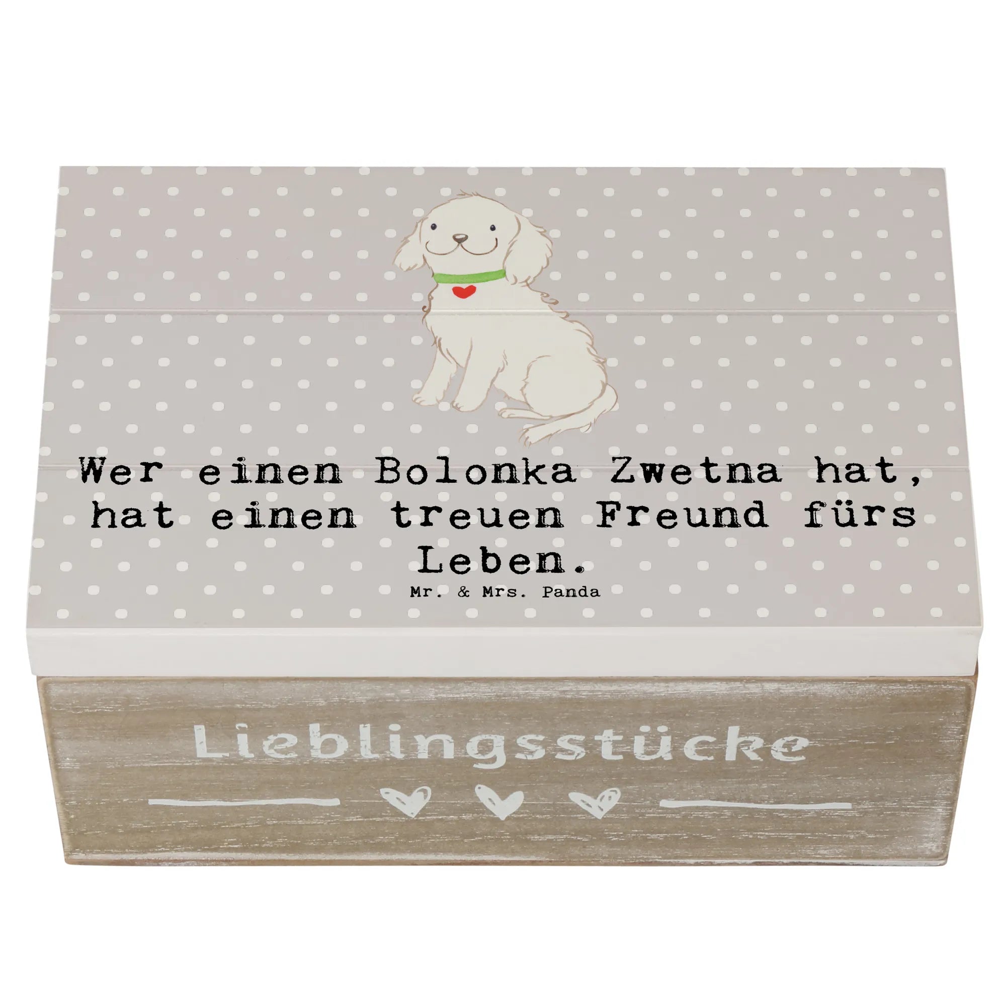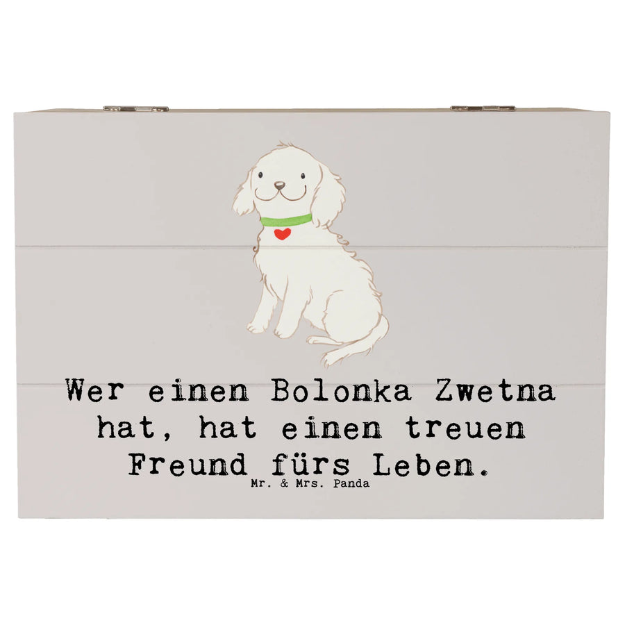Unsere Holzkiste Bolonka Zwetna aus der Hunderassen Kollektion vereint praktischen Nutzen mit warmem Design. Auf dem Deckel steht der liebevolle Spruch „Wer einen Bolonka Zwetna hat, hat einen treuen Freund fürs Leben.“, begleitet von einer zarten, handgezeichneten Aquarell-Illustration von Mrs. Panda. Die dezente Grau-Pastell-Beschichtung macht die Box zu einem eleganten Blickfang in jedem Zuhause.