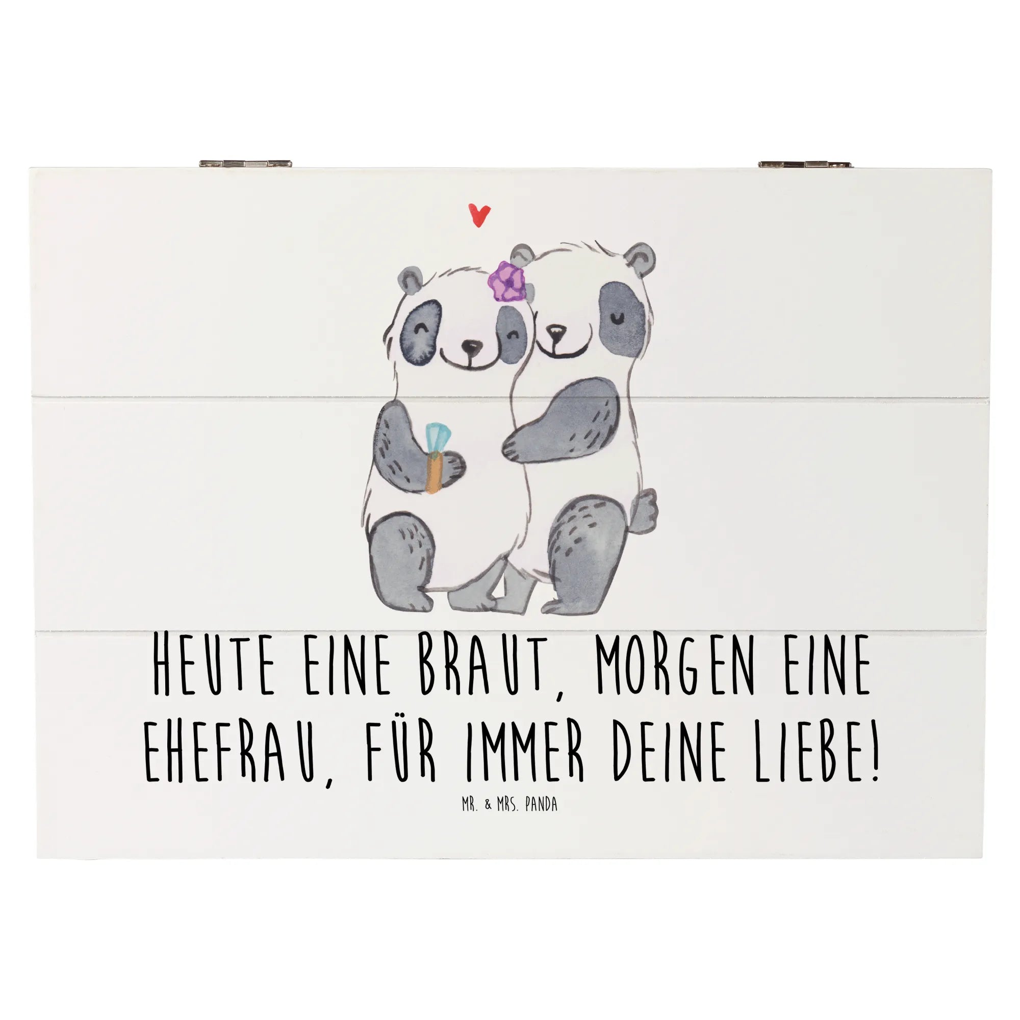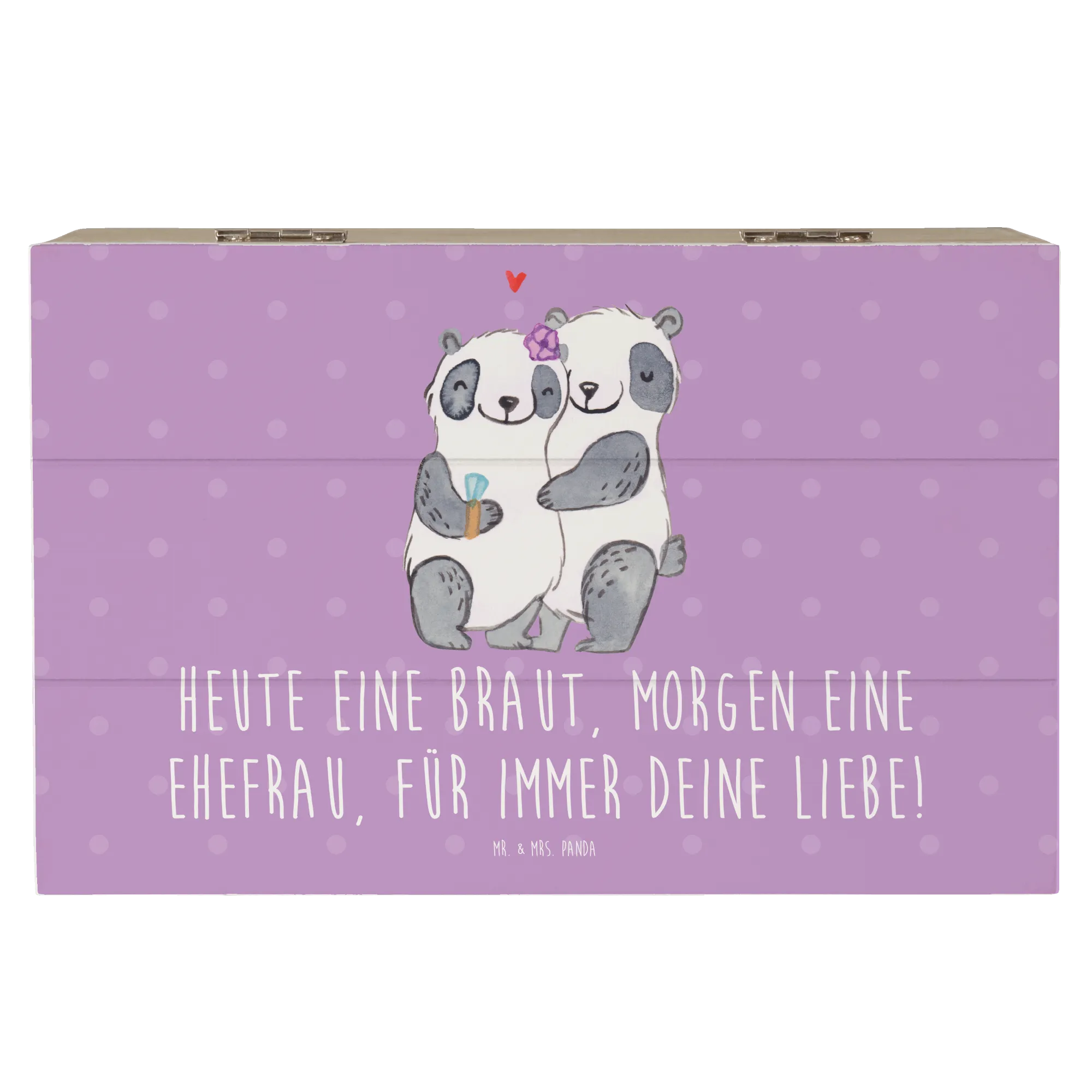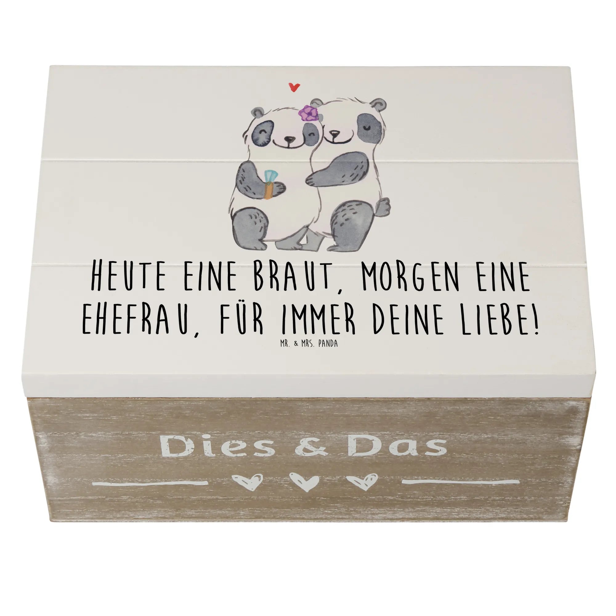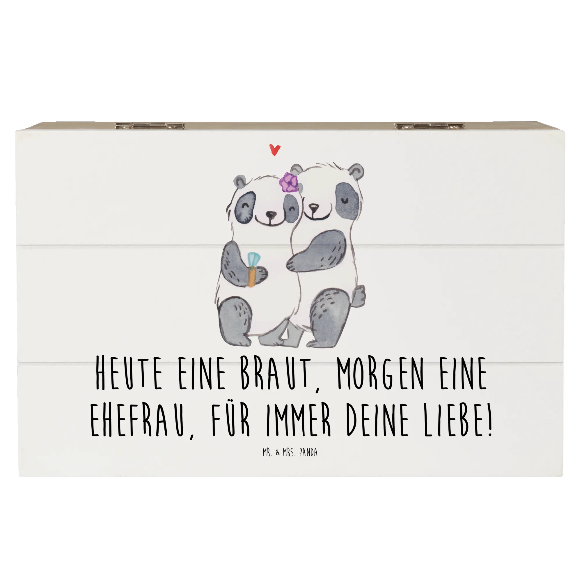 Die perfekte Geschenkidee für alle, die eine Hochzeit feiern! Unsere wunderschöne Holzkiste von Mr. & Mrs. Panda, mit dem spritzigen Motto "Heute eine Braut, morgen eine Ehefrau, für immer deine Liebe!", ist der ideale Aufbewahrungsort für all die kostbaren Erinnerungen an euren besonderen Tag.