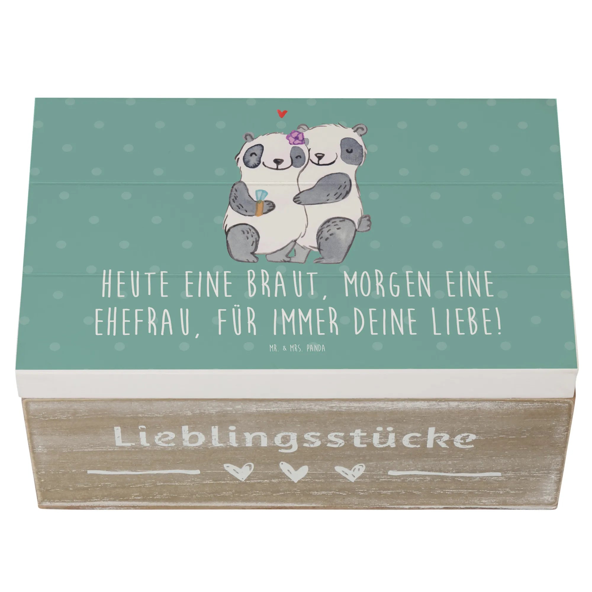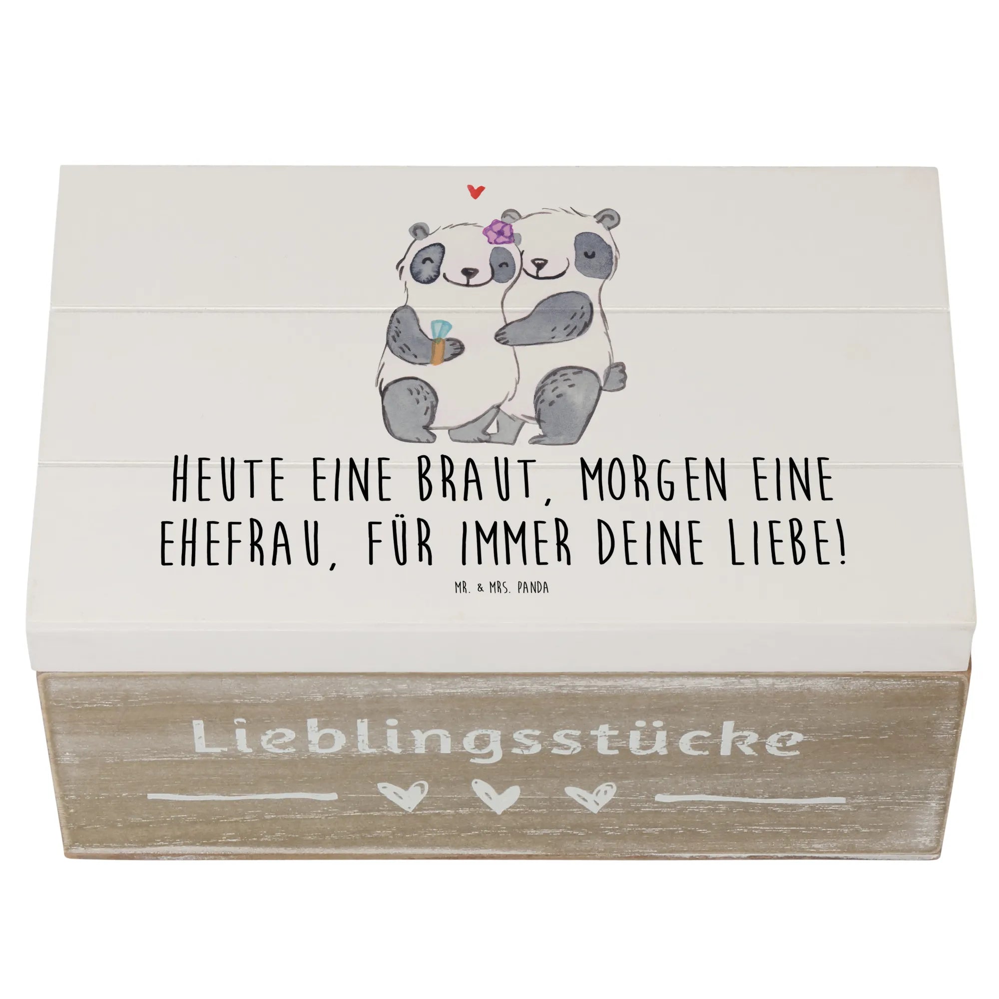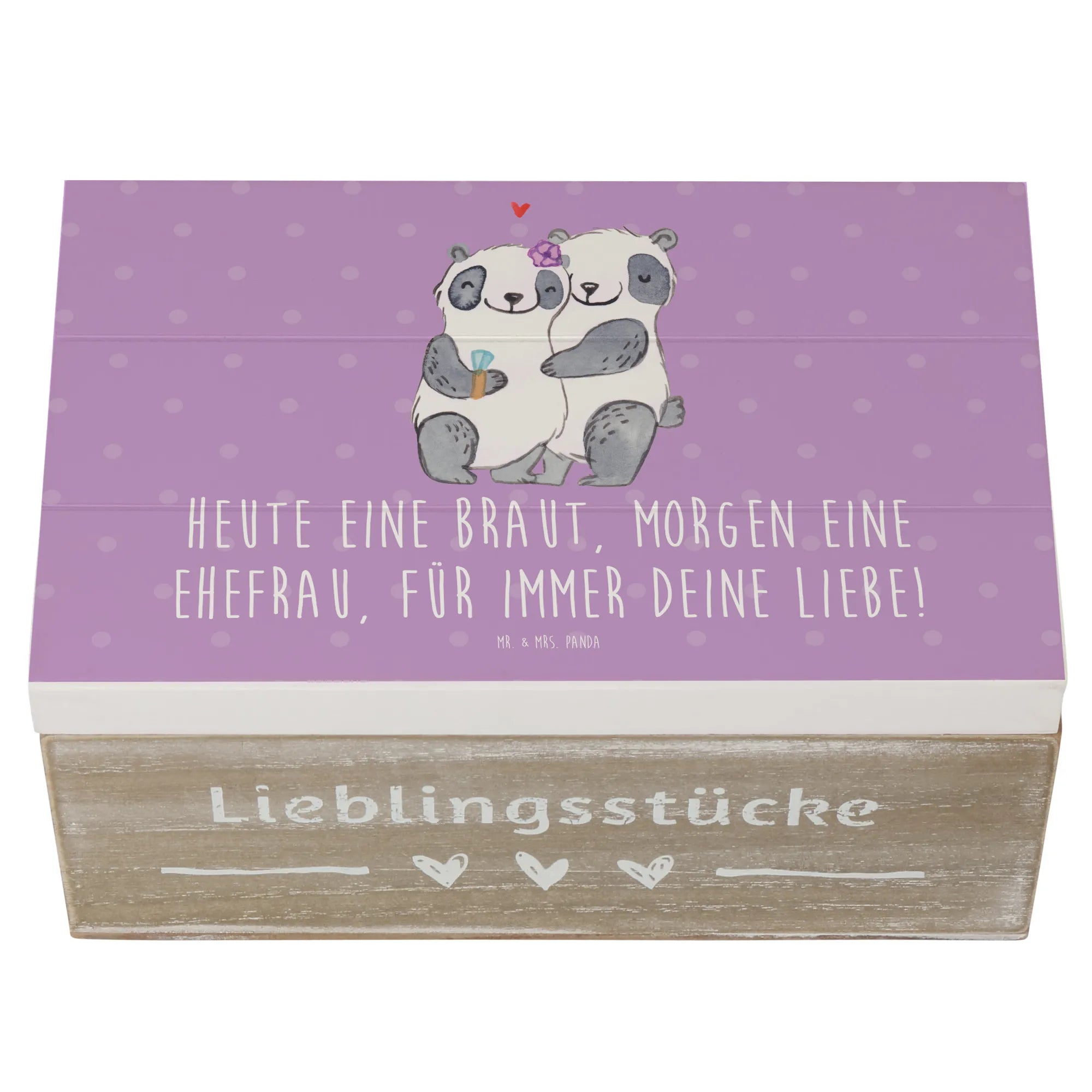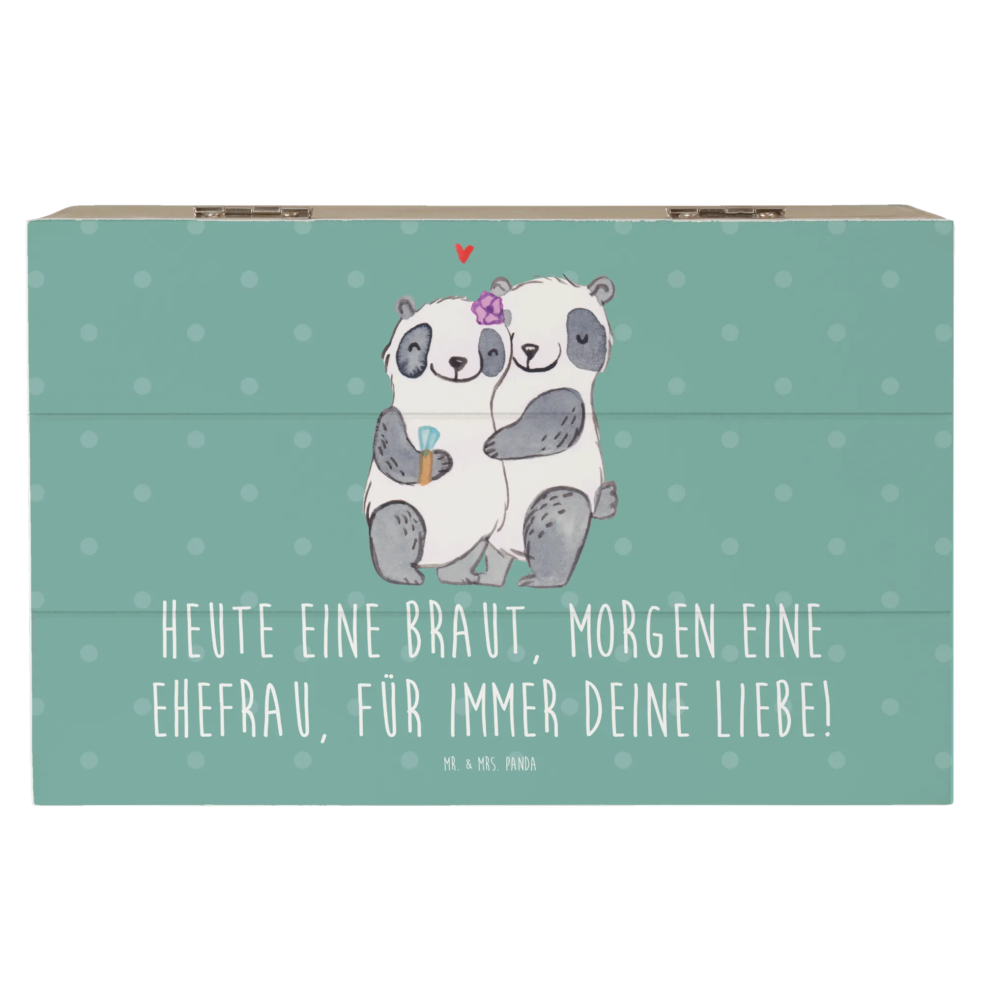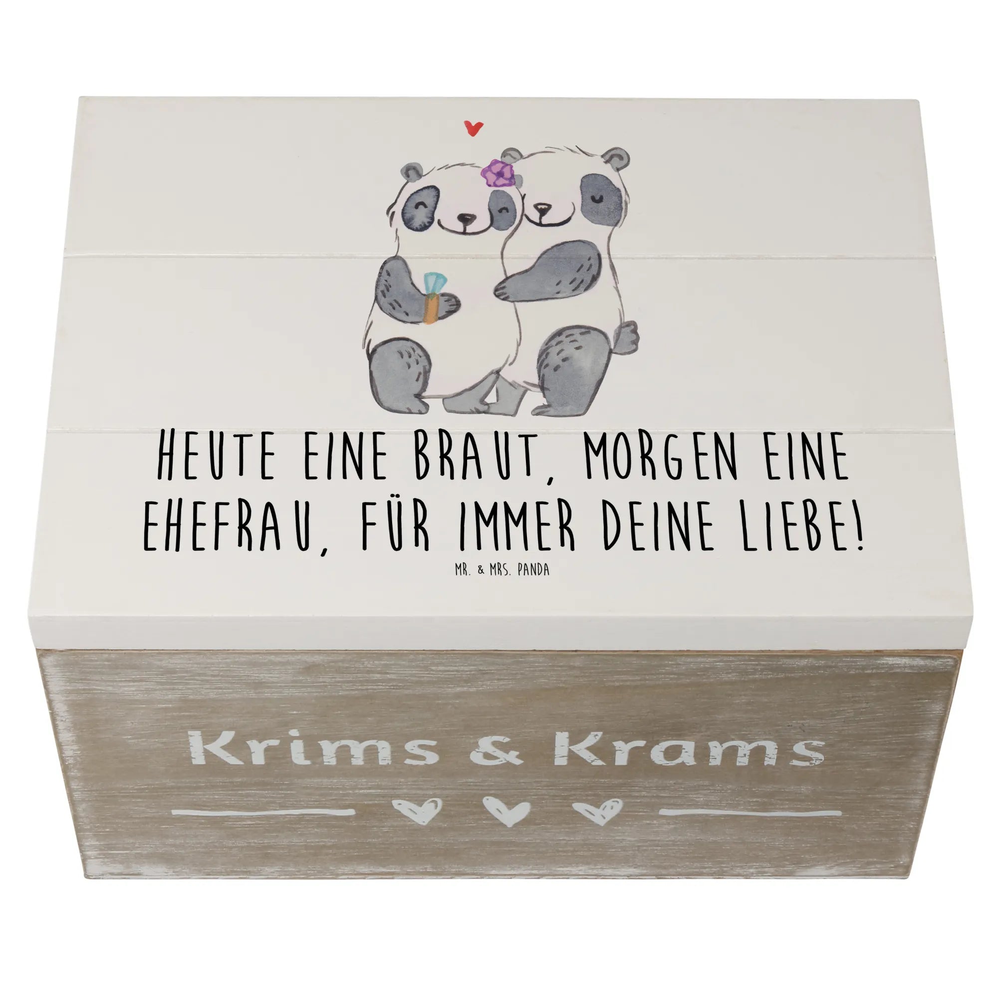 Die perfekte Geschenkidee für alle, die eine Hochzeit feiern! Unsere wunderschöne Holzkiste von Mr. & Mrs. Panda, mit dem spritzigen Motto "Heute eine Braut, morgen eine Ehefrau, für immer deine Liebe!", ist der ideale Aufbewahrungsort für all die kostbaren Erinnerungen an euren besonderen Tag.