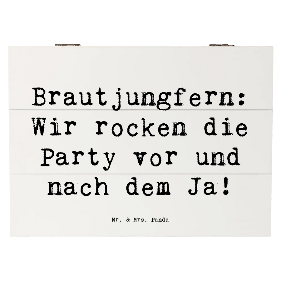 Die wunderschöne Holzkiste mit dem Spruch "Brautjungfern: Wir rocken die Party vor und nach dem Ja!" von Mr. & Mrs. Panda ist das perfekte Geschenk für alle, die an den schönsten Tag des Lebens der Bräute denken. Diese traumhafte Erinnerungskiste aus robuster Premium Hartfaser ist nicht nur eine Augenweide, sondern auch vielseitig einsetzbar!