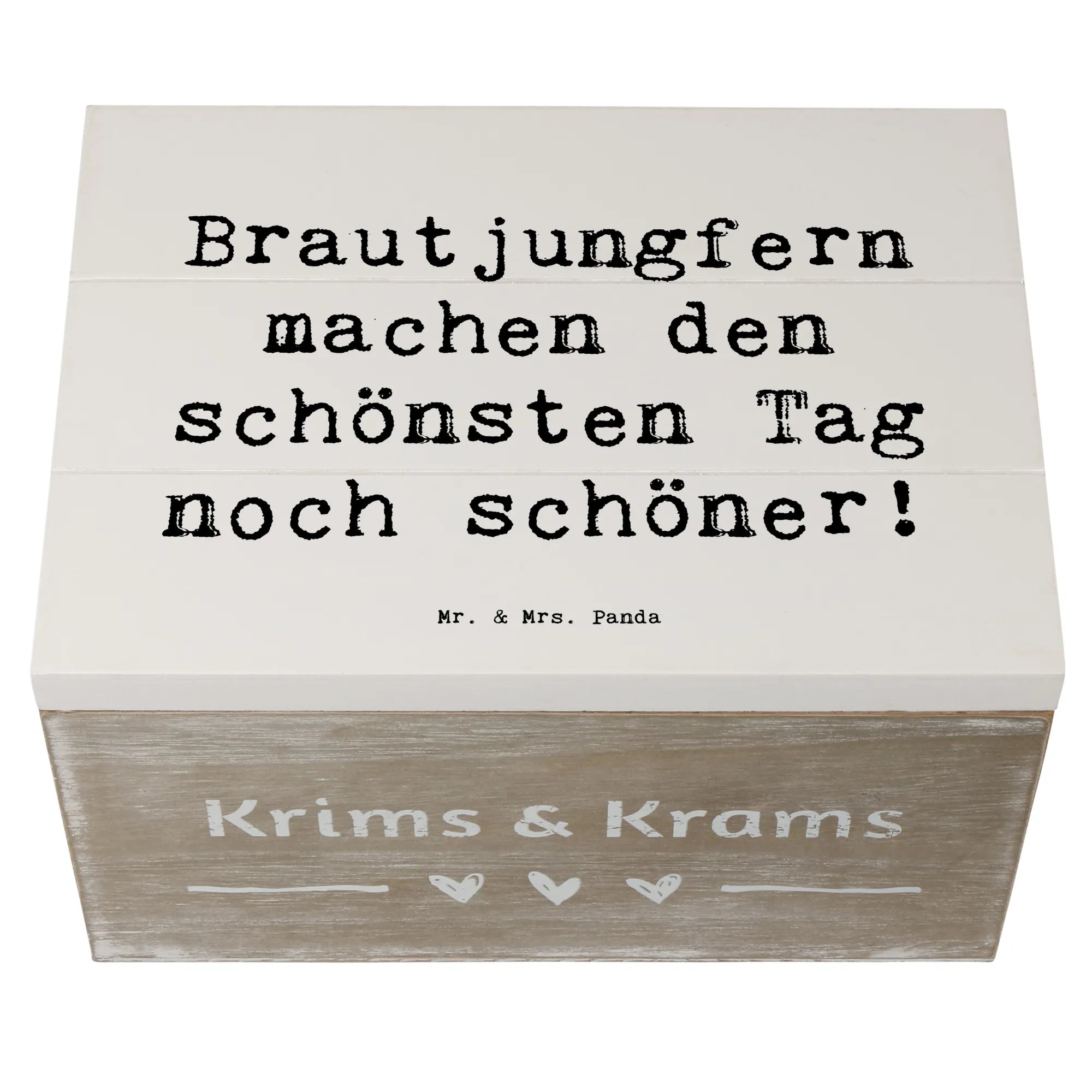 Entdecke die zauberhafte Holzkiste von Mr. & Mrs. Panda, perfekt für all die besonderen Anlässe in deinem Leben! Ob Hochzeit, Geburtstag oder einfach als schlichte Aufbewahrungsbox – diese Erinnerungskiste ist ideal für all deine Schätze. Übrigens, mit dem Slogan 'Brautjungfern machen den schönsten Tag noch schöner!' wird diese Kiste zum idealen Geschenk für deine Trauzeuginnen. Sie ist nicht nur ein wunderschönes Accessoire, sondern auch ein praktischer Ort für Erinnerungen – sei es das Fotoalbum von deinem Hochzeitstag, die ersten Babyschuhe oder ganz einfach als Dekokiste.