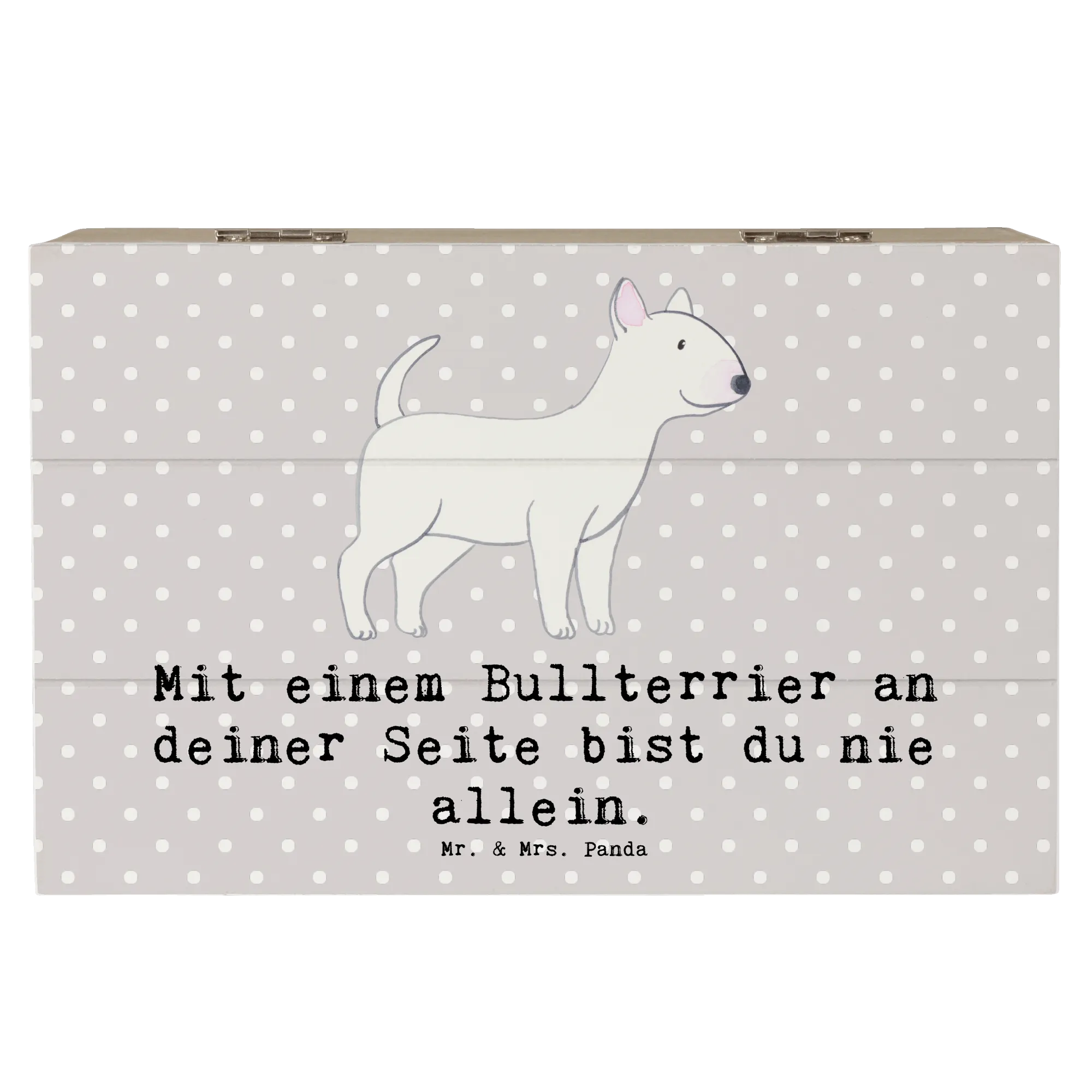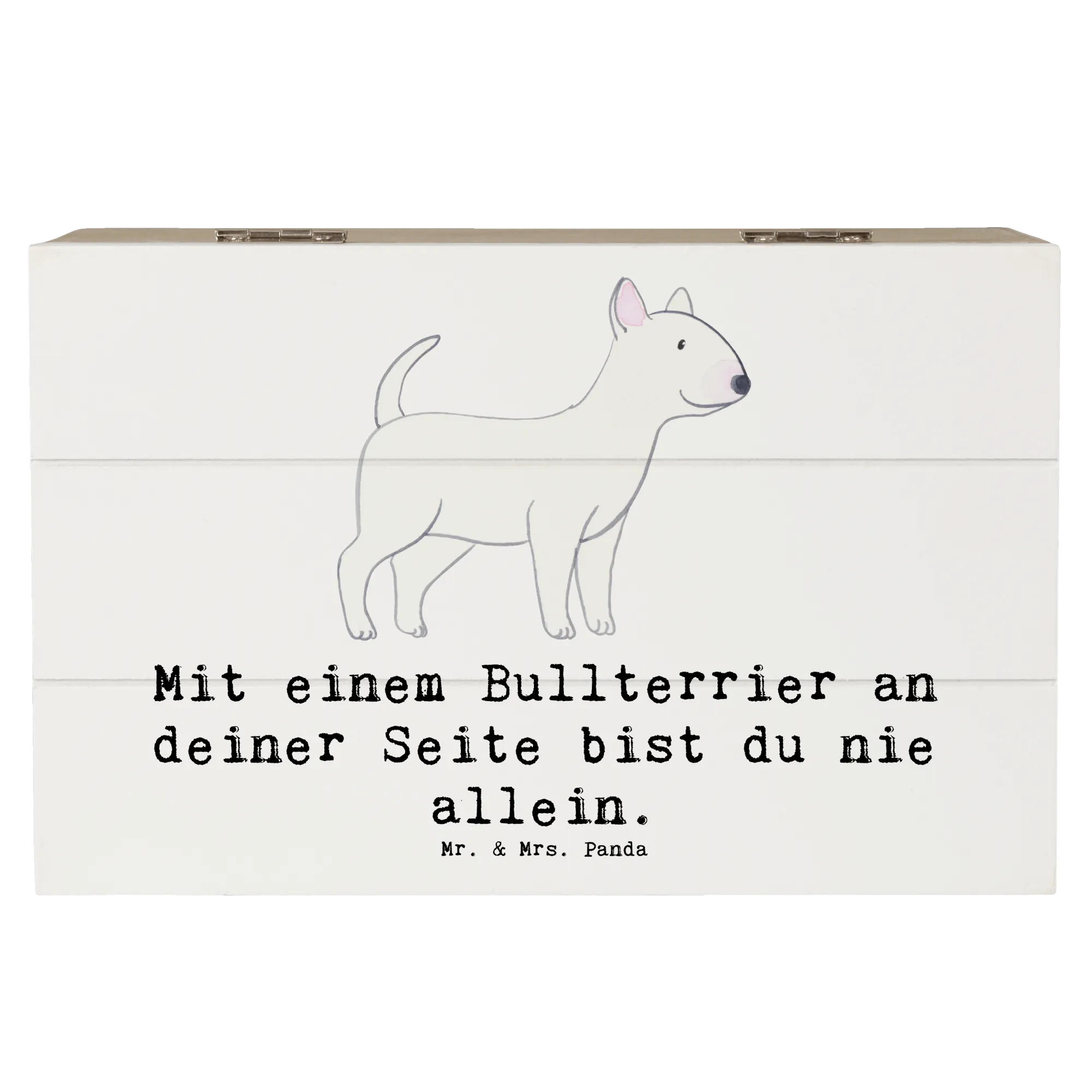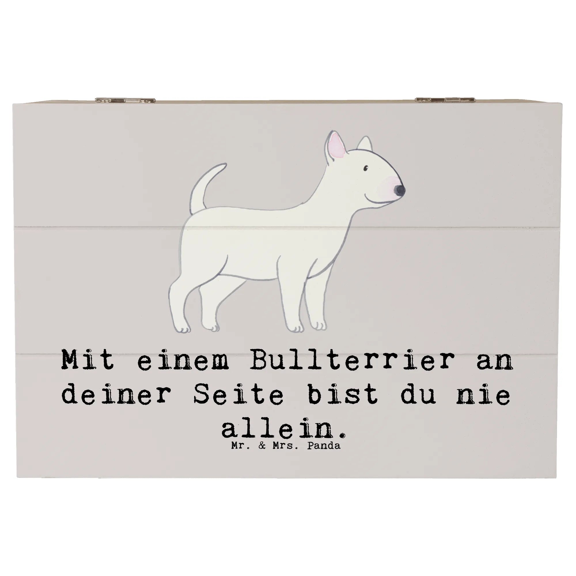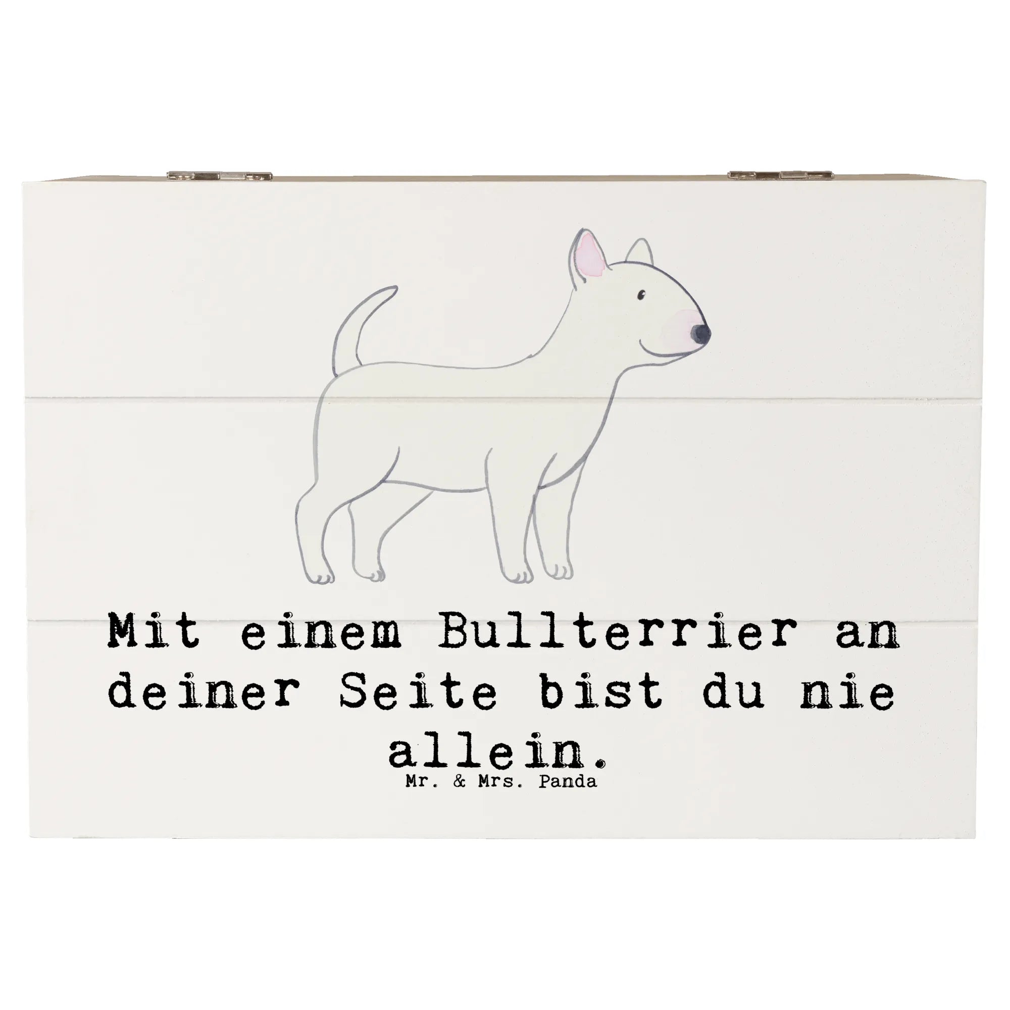 Die wunderschöne Holzkiste von Mr. & Mrs. Panda ist das perfekte Geschenk für alle Hundeliebhaber, besonders für Fans des Bullterriers! Mit dem charmanten Motiv "Mit einem Bullterrier an deiner Seite bist du nie allein." wird jede Kiste zu einem besonderen Aufbewahrungsort für deine liebsten Erinnerungen.