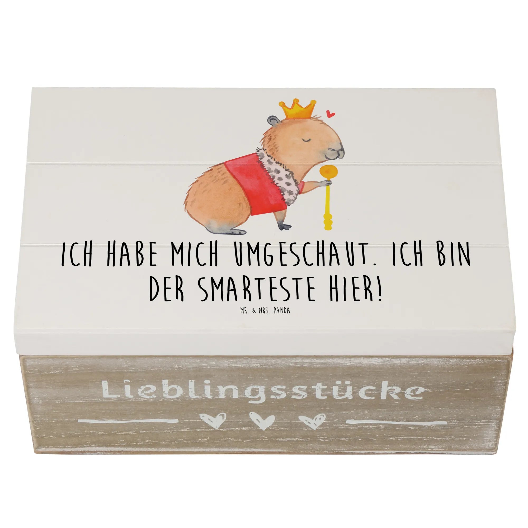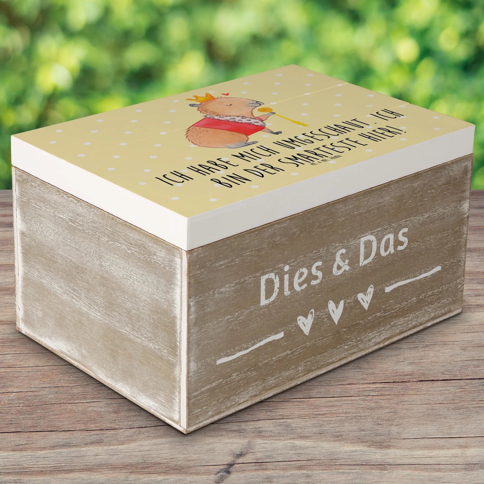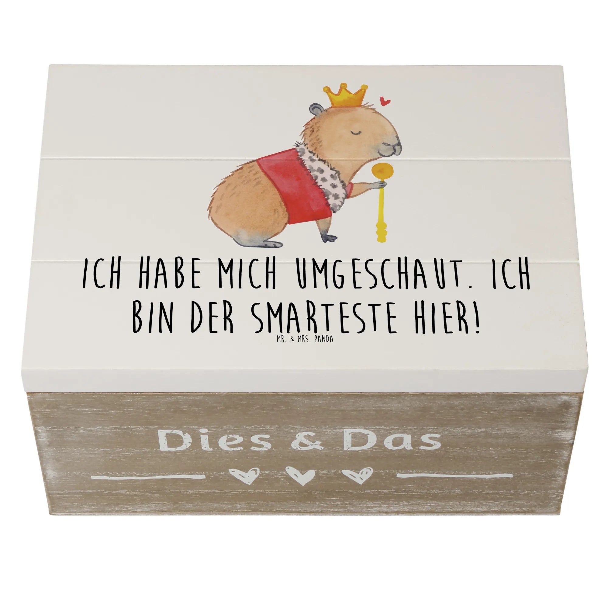 Der Capybara König, der mit seiner goldenen Krone und dem Zepter elegant auf der Kiste prangt, symbolisiert Freundlichkeit und Würde. Die liebevoll handgezeichnete Illustration von Mrs. Panda verbindet die charmante Darstellung des Wasserschweins mit einem Hauch von königlichem Flair. Dank des Slogans "Ich habe mich umgeschaut. Ich bin der Smarteste hier!" bringt die Kiste nicht nur gute Laune, sondern auch einen Schuss Humor in dein Zuhause.