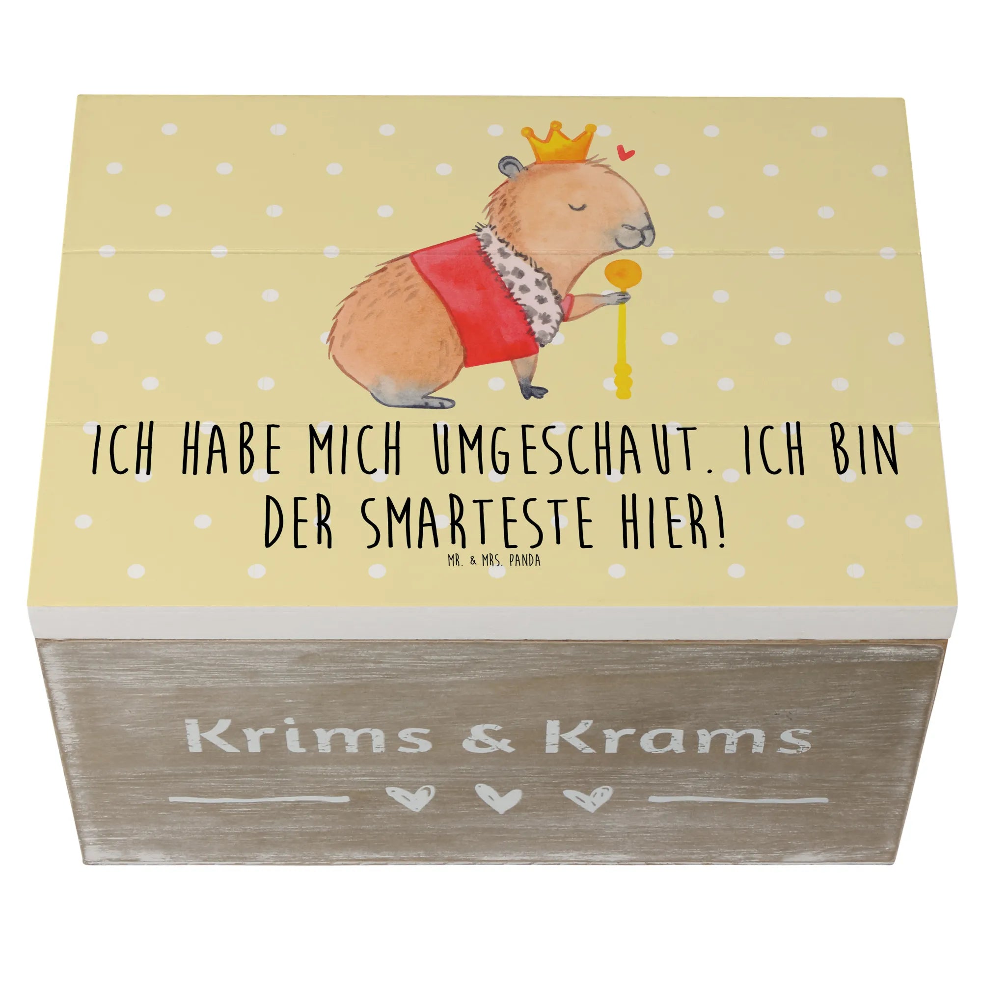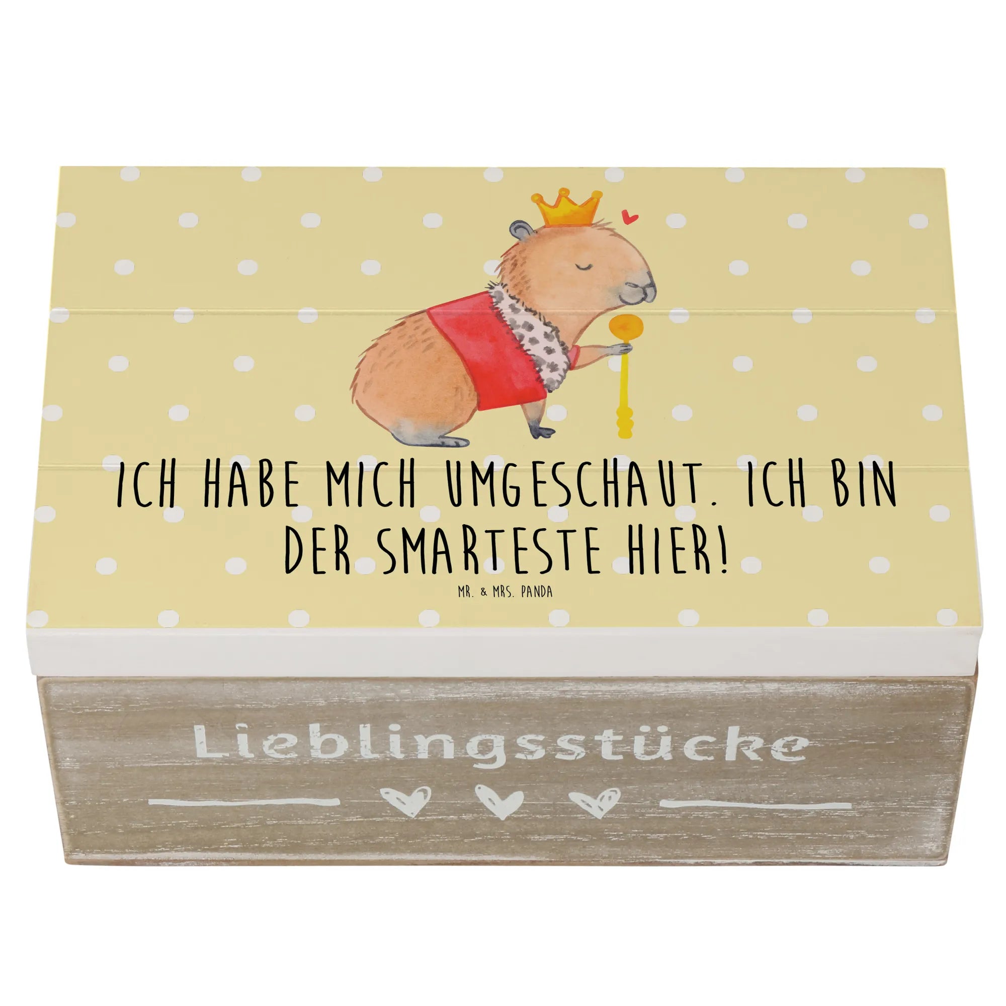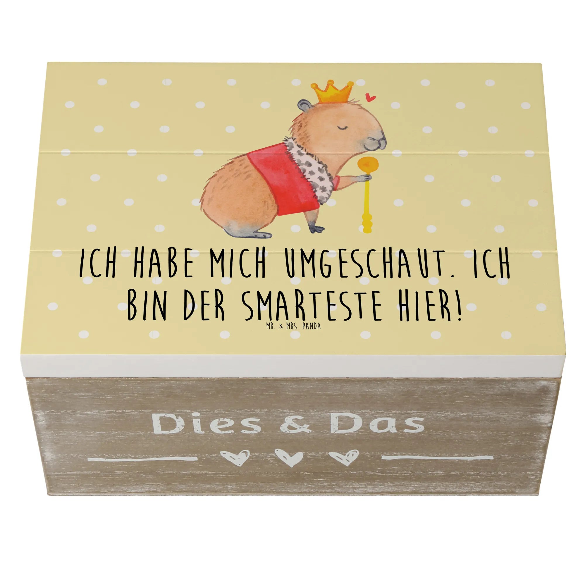 Der Capybara König, der mit seiner goldenen Krone und dem Zepter elegant auf der Kiste prangt, symbolisiert Freundlichkeit und Würde. Die liebevoll handgezeichnete Illustration von Mrs. Panda verbindet die charmante Darstellung des Wasserschweins mit einem Hauch von königlichem Flair. Dank des Slogans "Ich habe mich umgeschaut. Ich bin der Smarteste hier!" bringt die Kiste nicht nur gute Laune, sondern auch einen Schuss Humor in dein Zuhause.