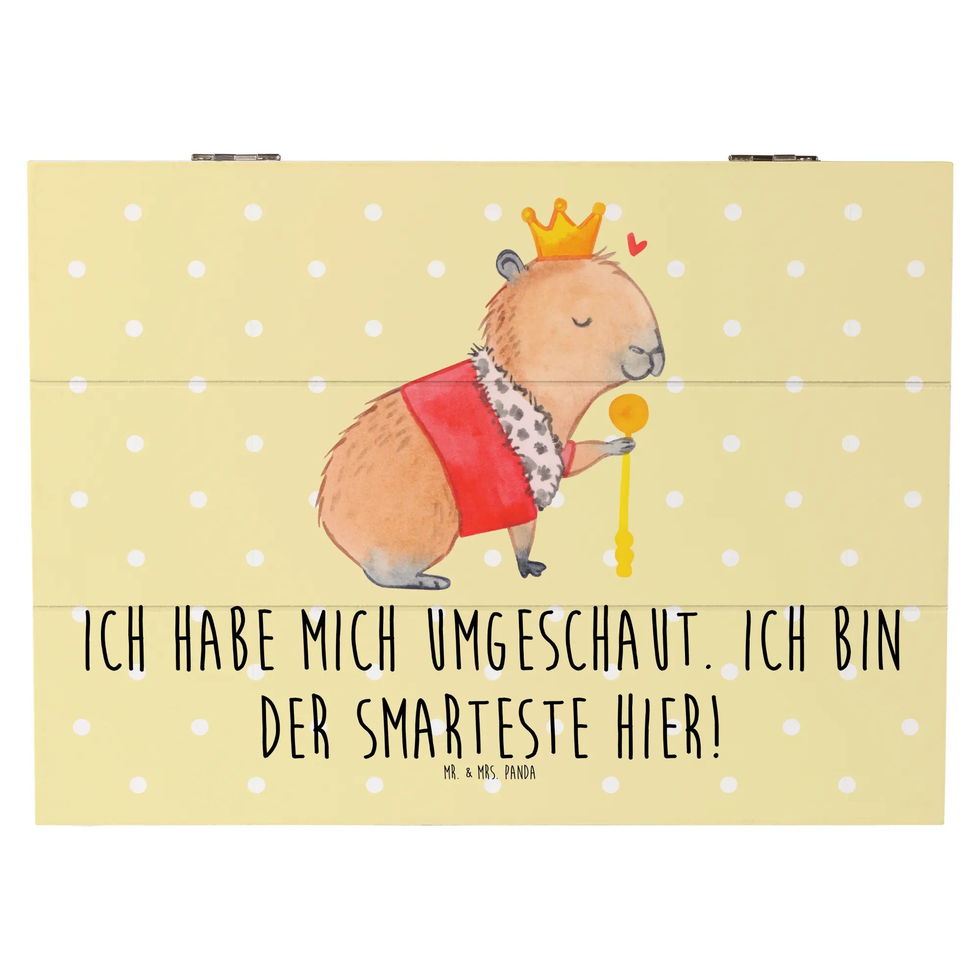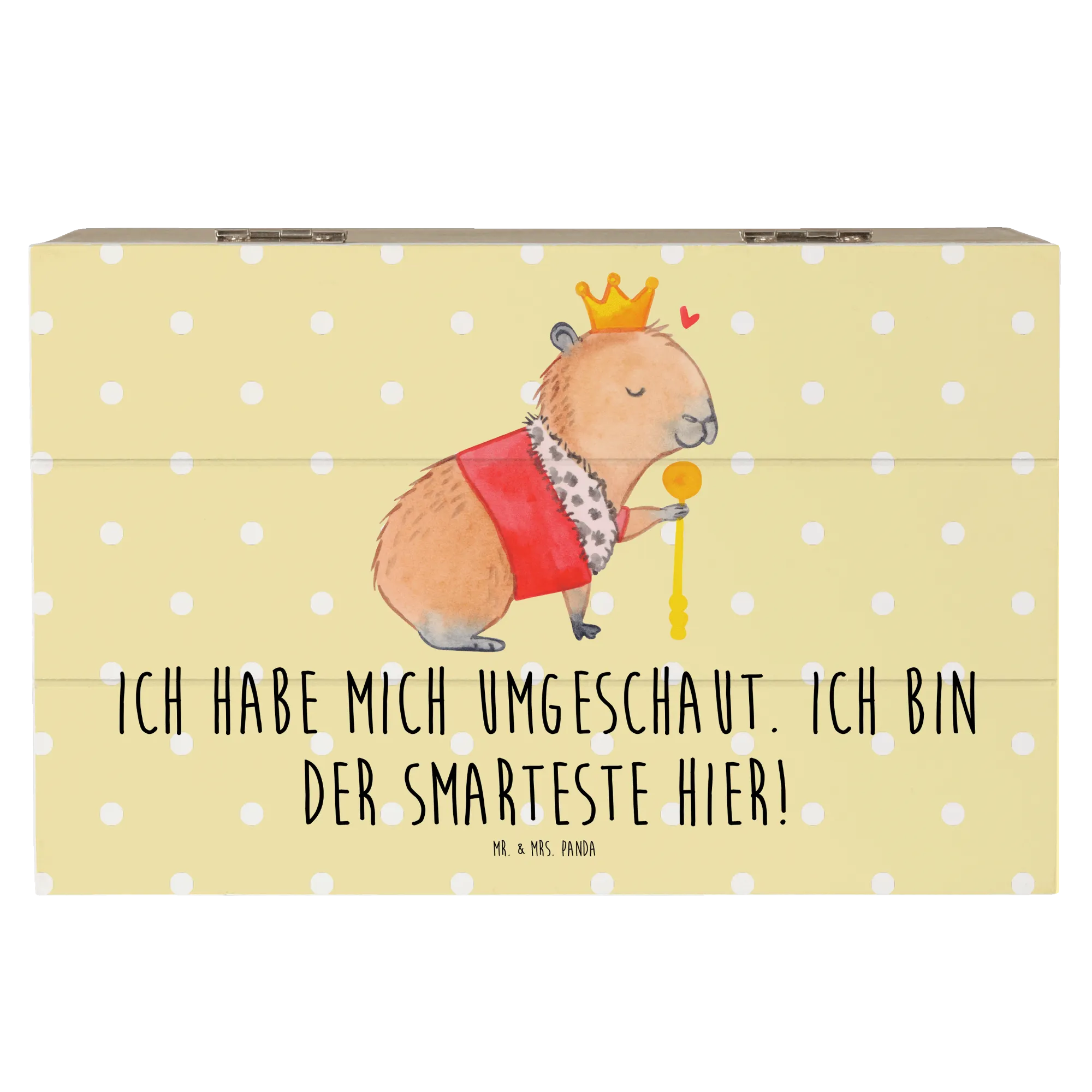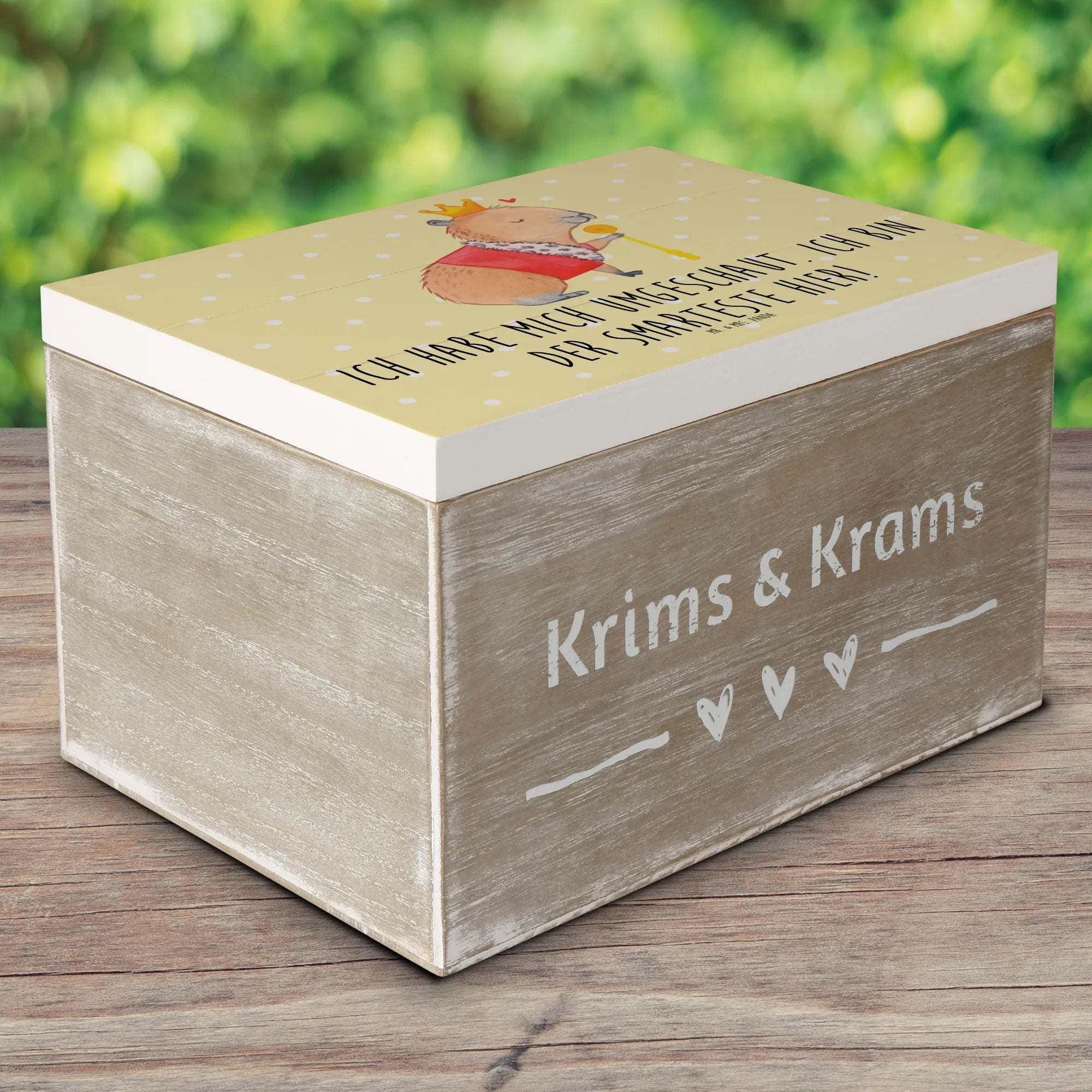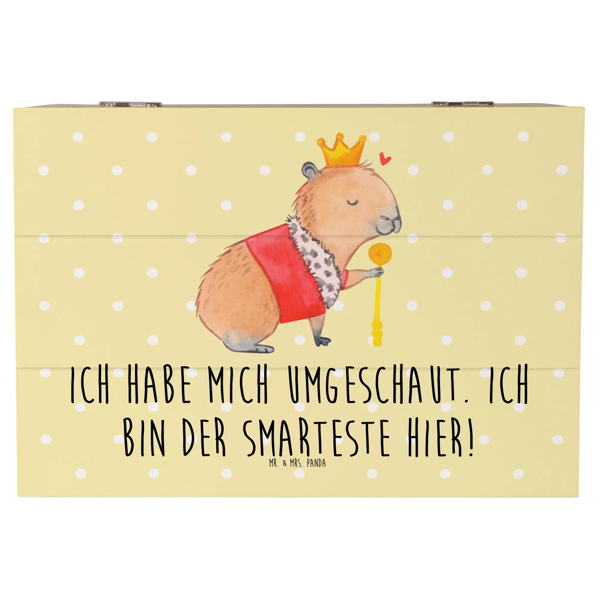 Wenn du auf der Suche nach dem perfekten Geschenk bist, dann ist die Holzkiste mit dem bezaubernden Capybara König-Motiv von Mr. & Mrs. Panda genau das Richtige für dich! Diese wunderschöne Holzkiste ist nicht nur ein praktischer Aufbewahrungsort für all deine Schätze, sondern auch ein entzückendes Deko-Element für jedes Zuhause.
