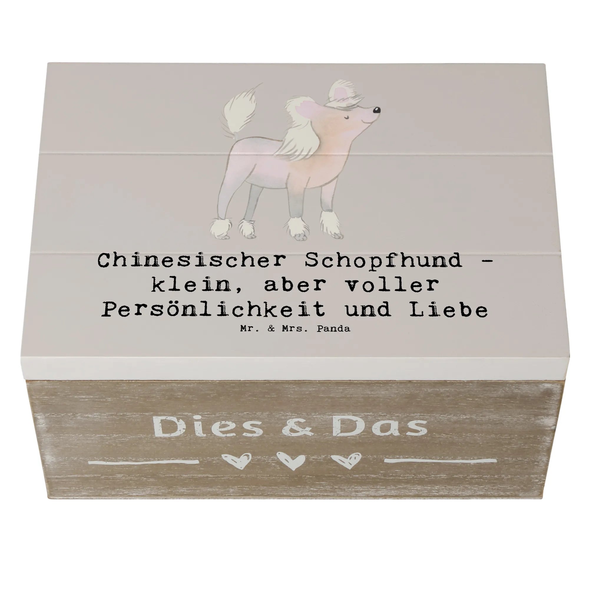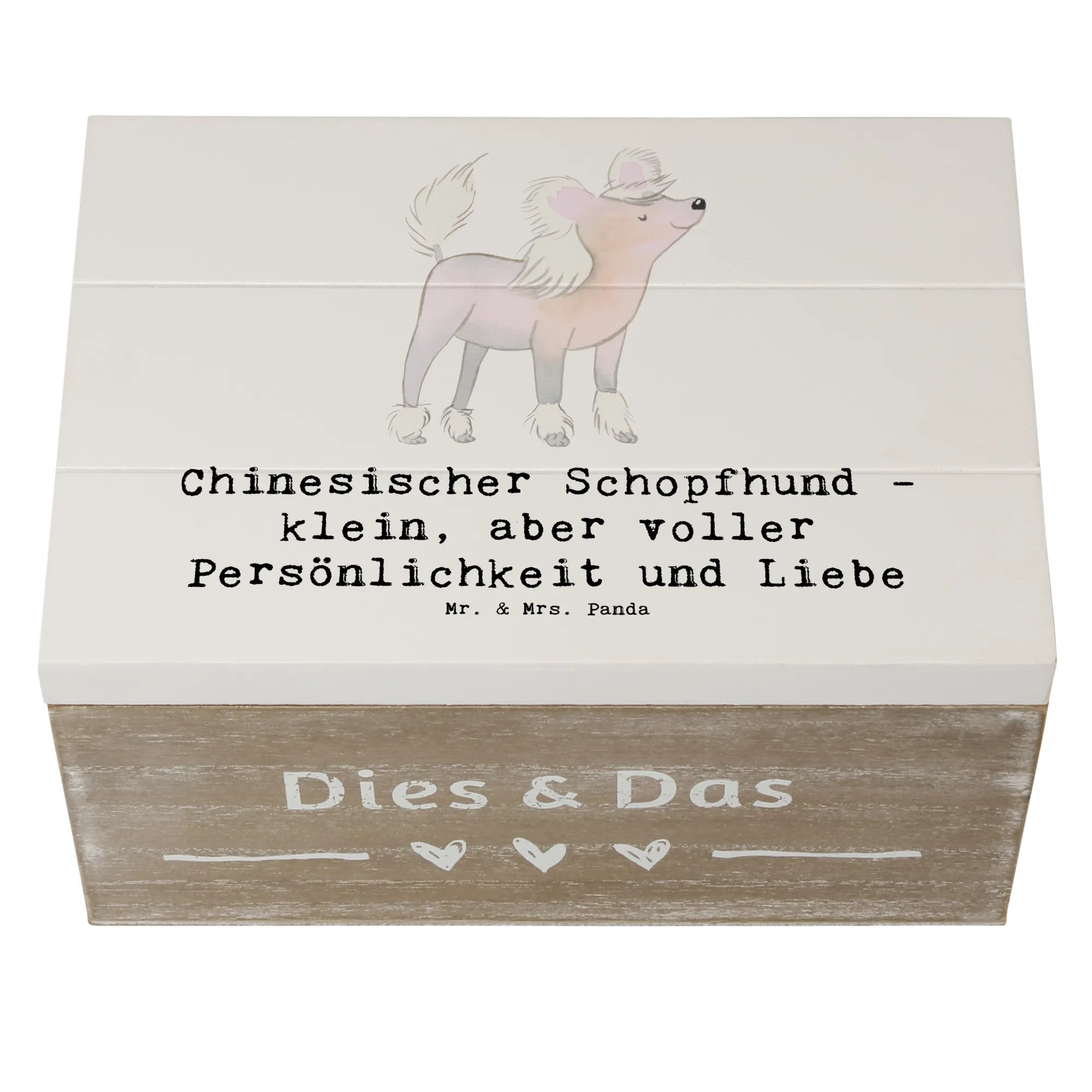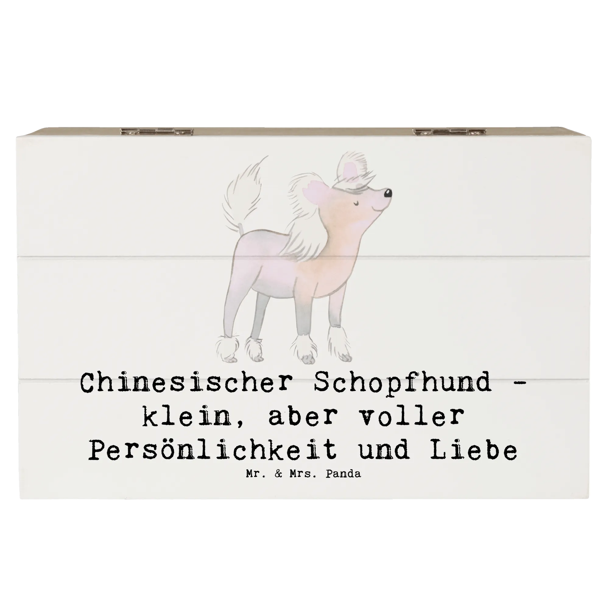 Die Holzkiste hat die Maße von 22 cm x 15 cm und 12 cm Höhe, und besteht aus robuster Premium Hartfaser, die nicht nur stabil, sondern auch wasserabweisend ist. Die Kiste ist mit dem niedlichen Spruch "Chinesischer Schopfhund - klein, aber voller Persönlichkeit und Liebe" bedruckt.