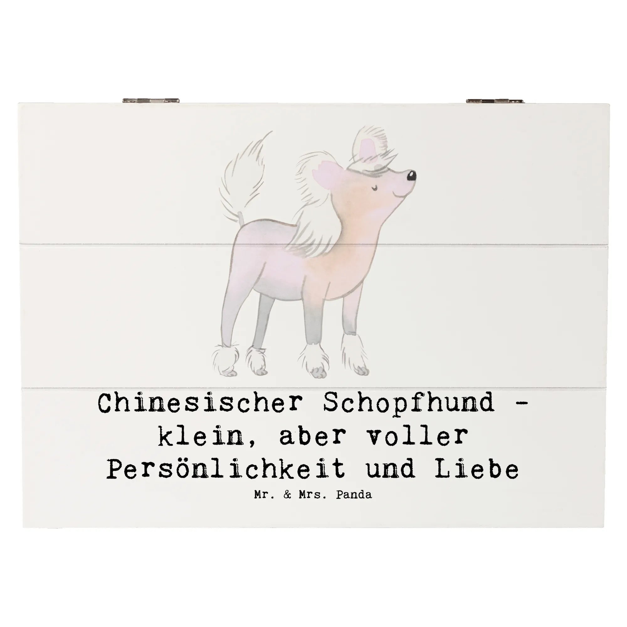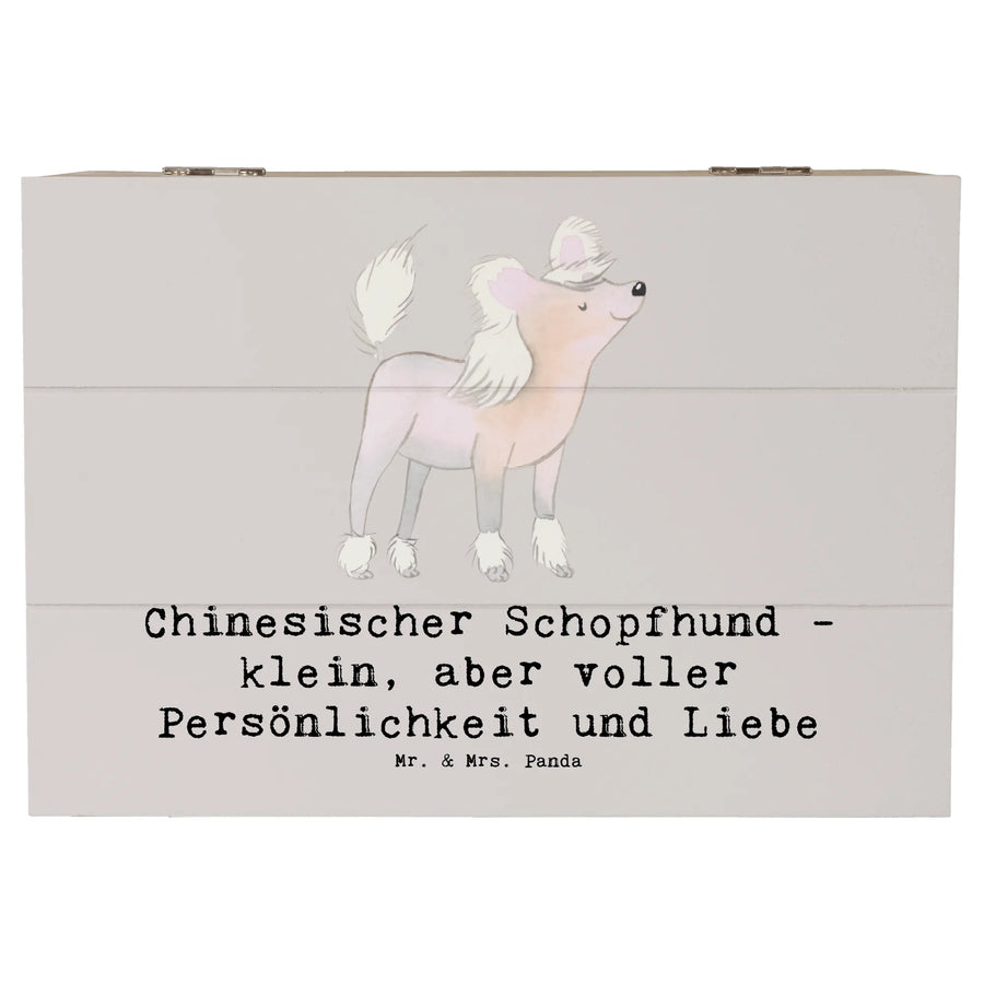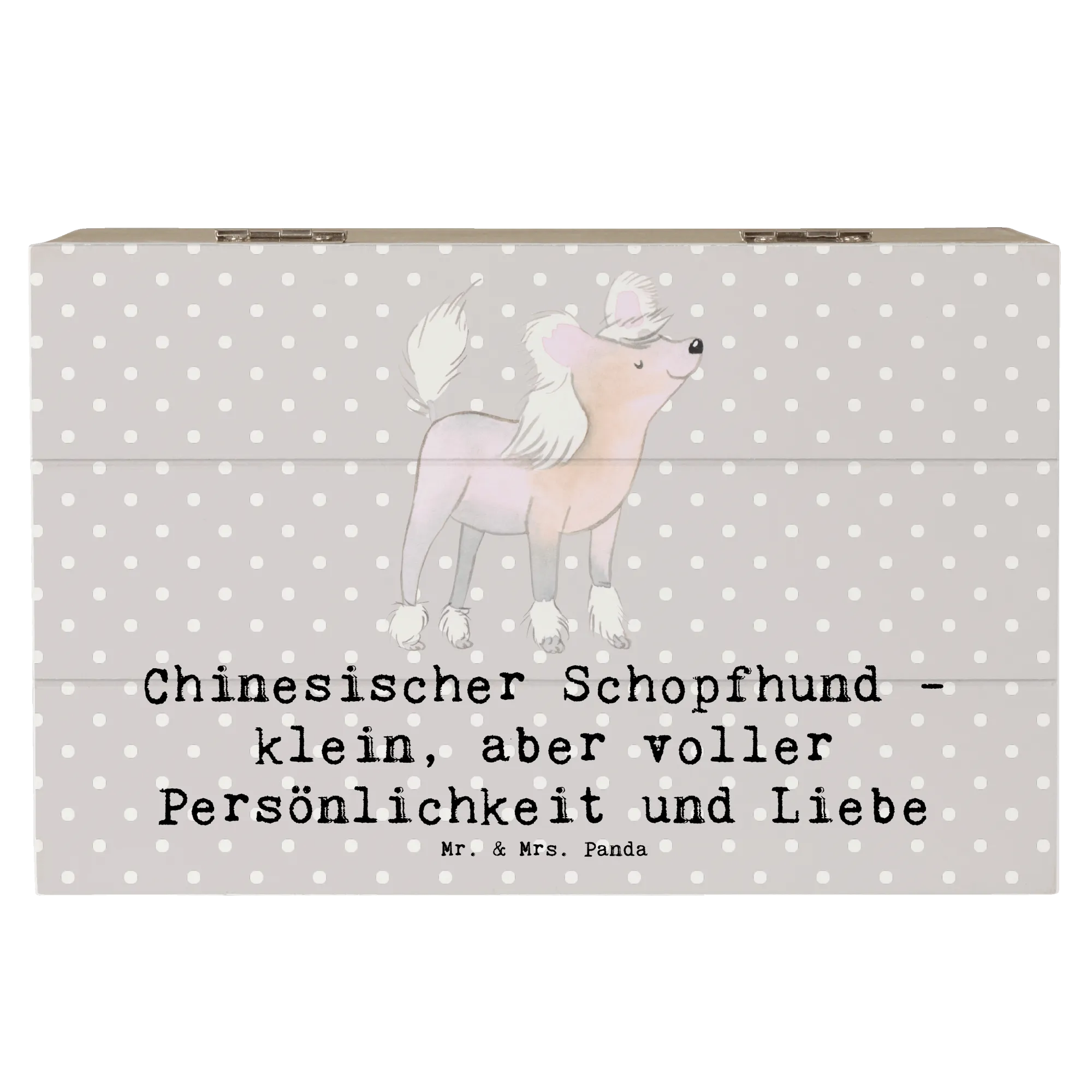 Die Holzkiste hat die Maße von 22 cm x 15 cm und 12 cm Höhe, und besteht aus robuster Premium Hartfaser, die nicht nur stabil, sondern auch wasserabweisend ist. Die Kiste ist mit dem niedlichen Spruch "Chinesischer Schopfhund - klein, aber voller Persönlichkeit und Liebe" bedruckt.
