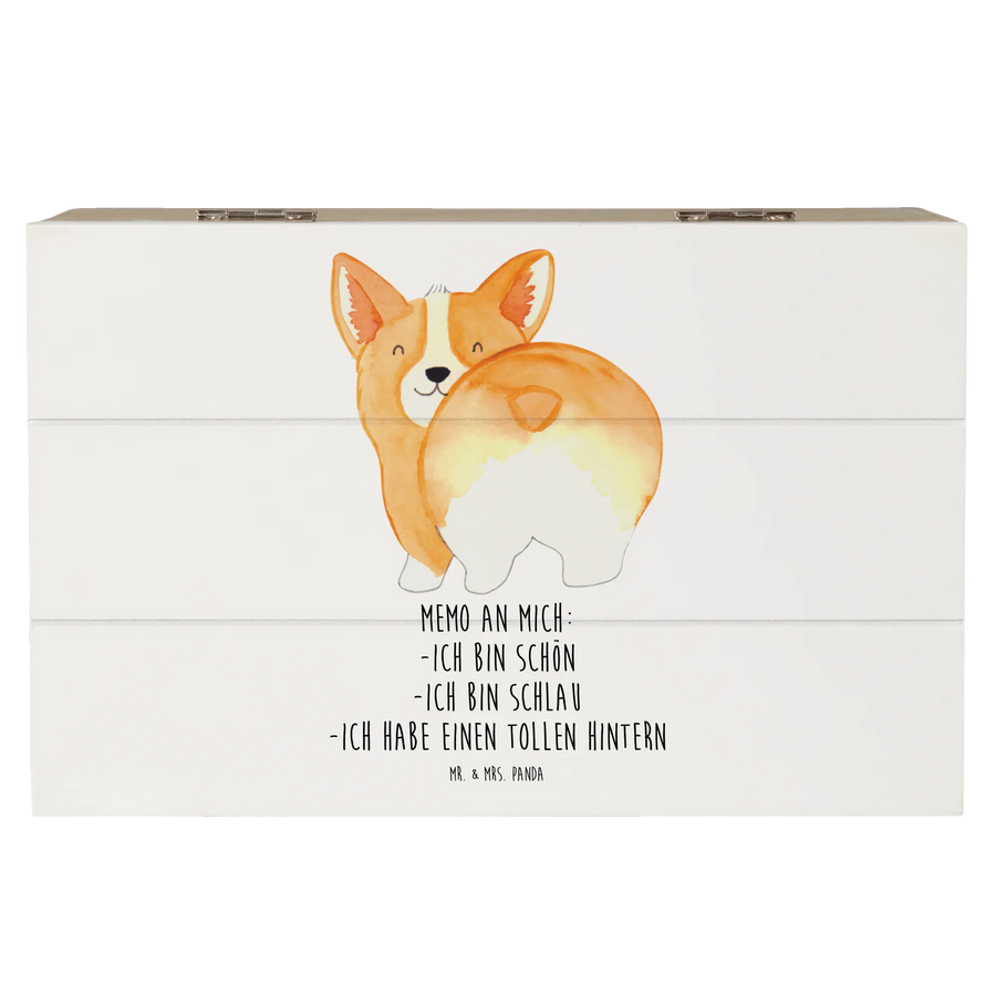 Die robuste Holzfaser sorgt dafür, dass die Kiste lange hält, während die Einschlagscharniere ein einfaches Öffnen und Schließen ermöglichen. Die Kiste zeigt einen fröhlichen Corgi, der begeistert seinen Po in die Kamera hält, und der dazugehörige Spruch "Memo an mich: -ich bin schön -ich bin schlau -ich habe einen tollen Hintern" bringt jeden zum Schmunzeln und ist eine tolle Motivationsbotschaft.