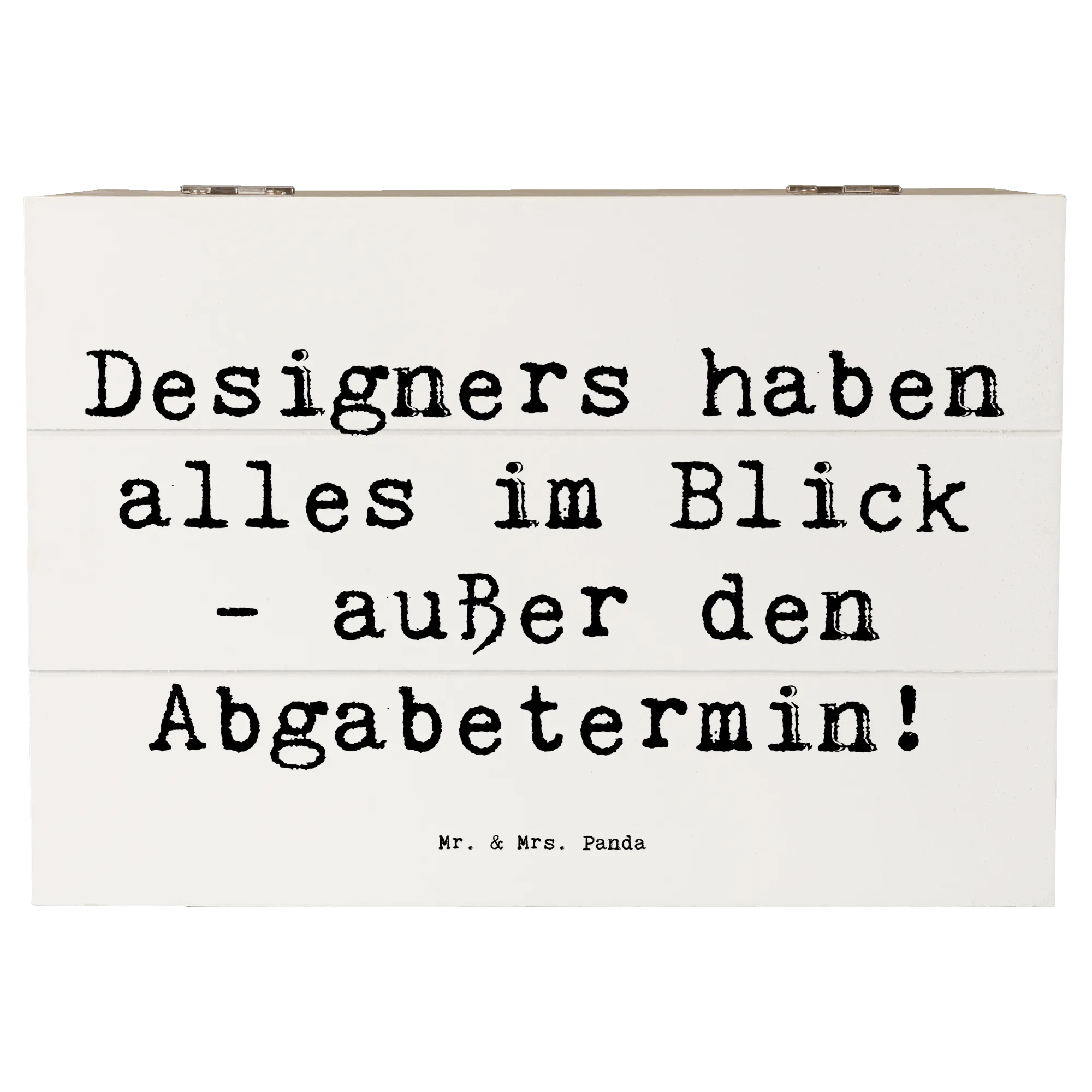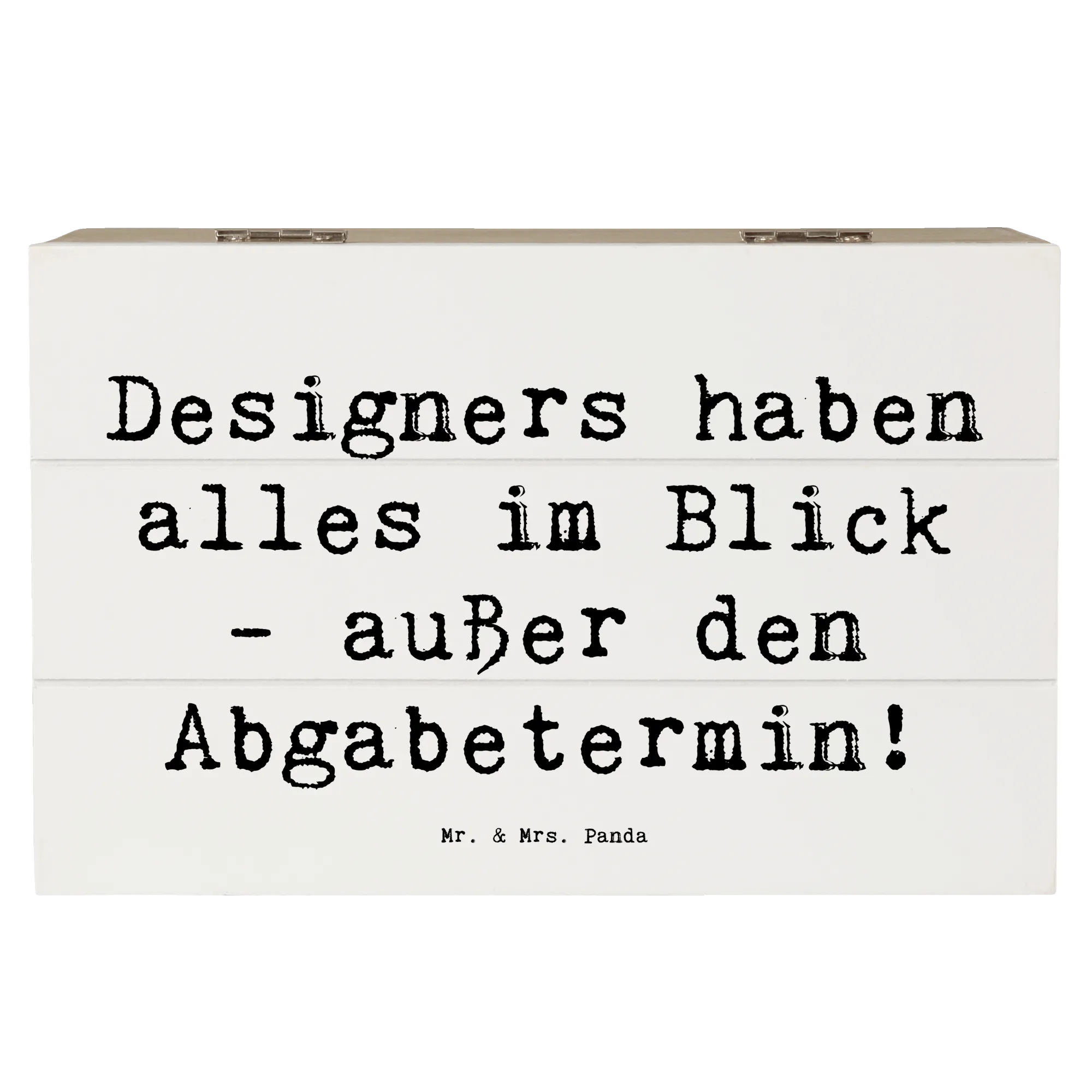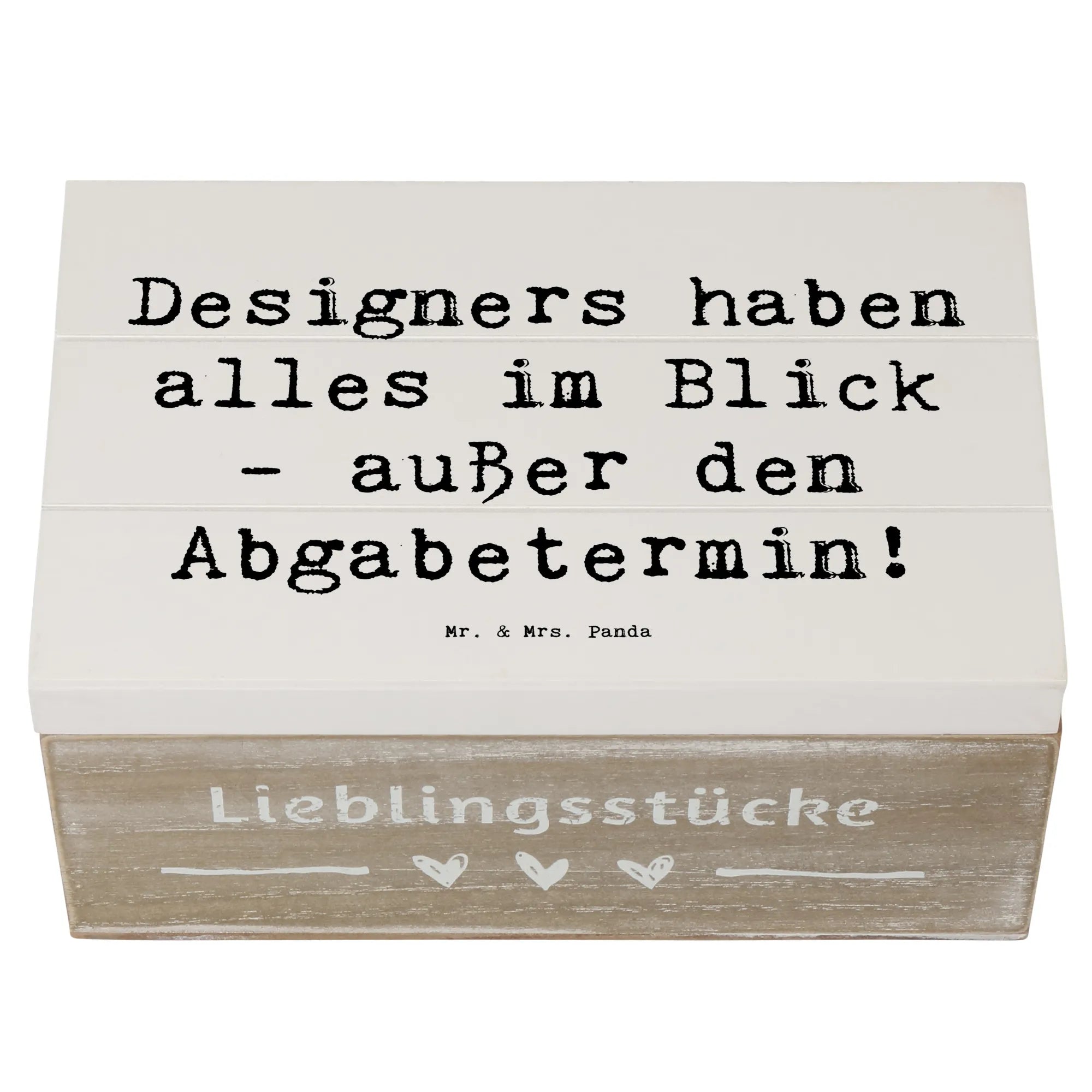 Die wunderschöne Holzkiste von Mr. & Mrs. Panda ist das perfekte Geschenk für alle kreativen Köpfe unter den Designern. Mit einem liebevollen Motiv, das den Spruch "Designers haben alles im Blick - außer den Abgabetermin!" enthält, ist diese Kiste ein absoluter Hingucker und eine praktische Aufbewahrungsoption zugleich.