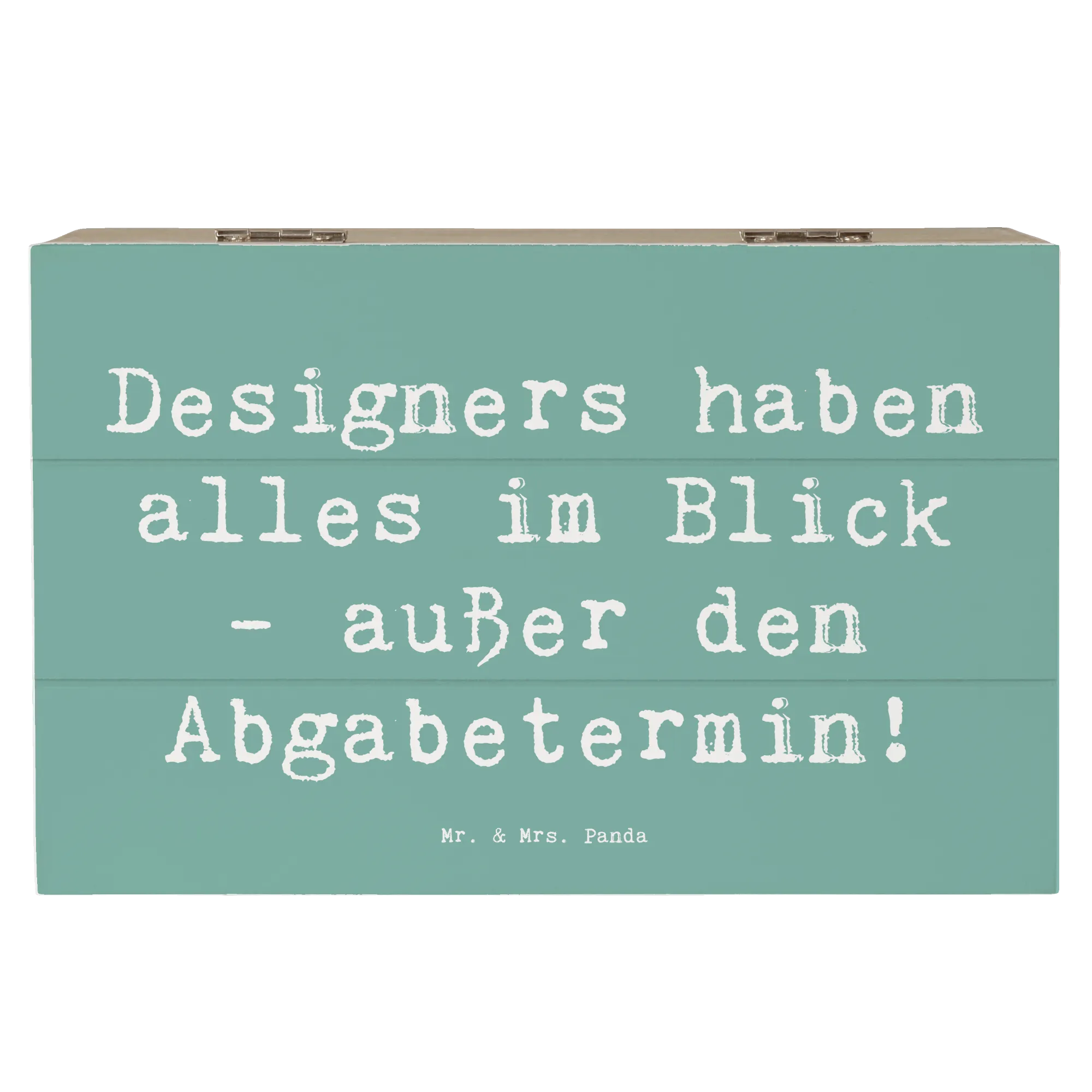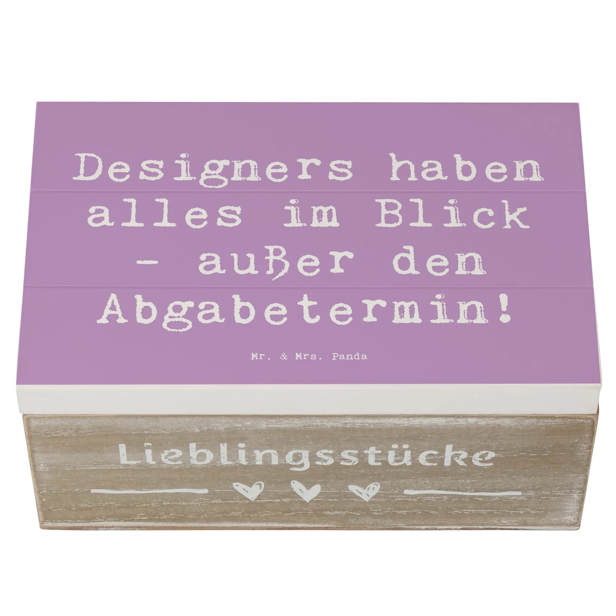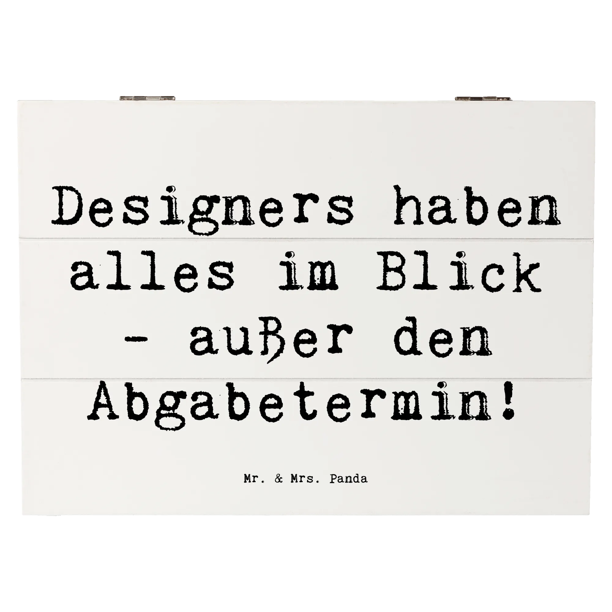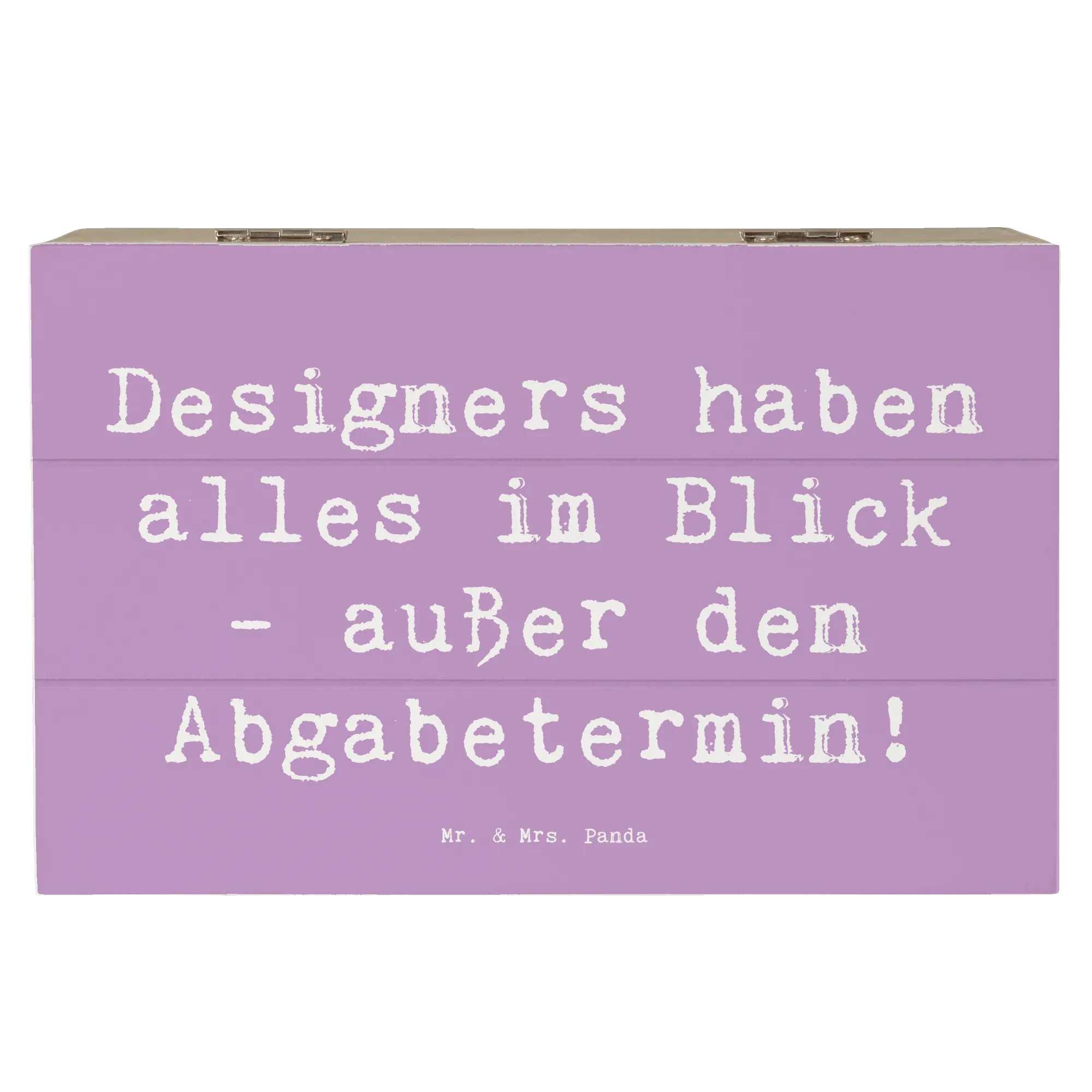 Die wunderschöne Holzkiste von Mr. & Mrs. Panda ist das perfekte Geschenk für alle kreativen Köpfe unter den Designern. Mit einem liebevollen Motiv, das den Spruch "Designers haben alles im Blick - außer den Abgabetermin!" enthält, ist diese Kiste ein absoluter Hingucker und eine praktische Aufbewahrungsoption zugleich.