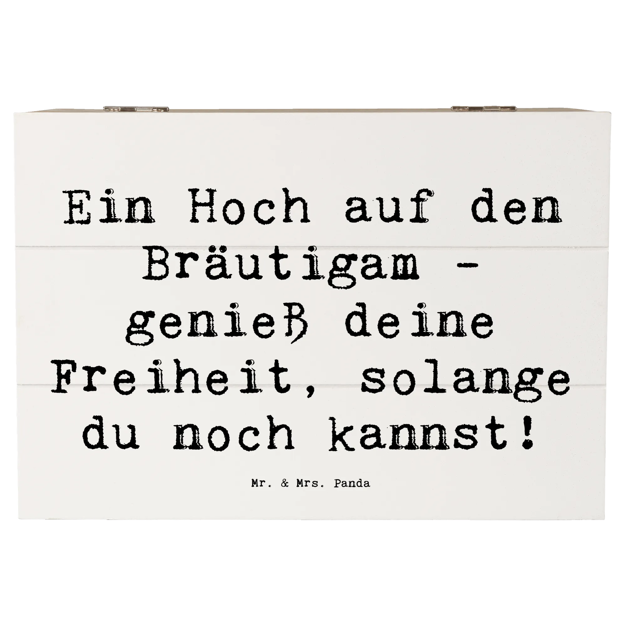Die Junggesellenabschied Holzkiste von Mr. & Mrs. Panda ist das perfekte Geschenk für jeden Bräutigam und seine Freunde, die diesen besonderen Anlass gebührend feiern möchten! Mit dem liebevollen Spruch "Ein Hoch auf den Bräutigam - genieß deine Freiheit, solange du noch kannst!" ist diese Kiste nicht nur ein bezauberndes Deko-Element, sondern auch eine praktische Aufbewahrungsbox für all die Erinnerungen, die während des Junggesellenabschieds gesammelt werden.