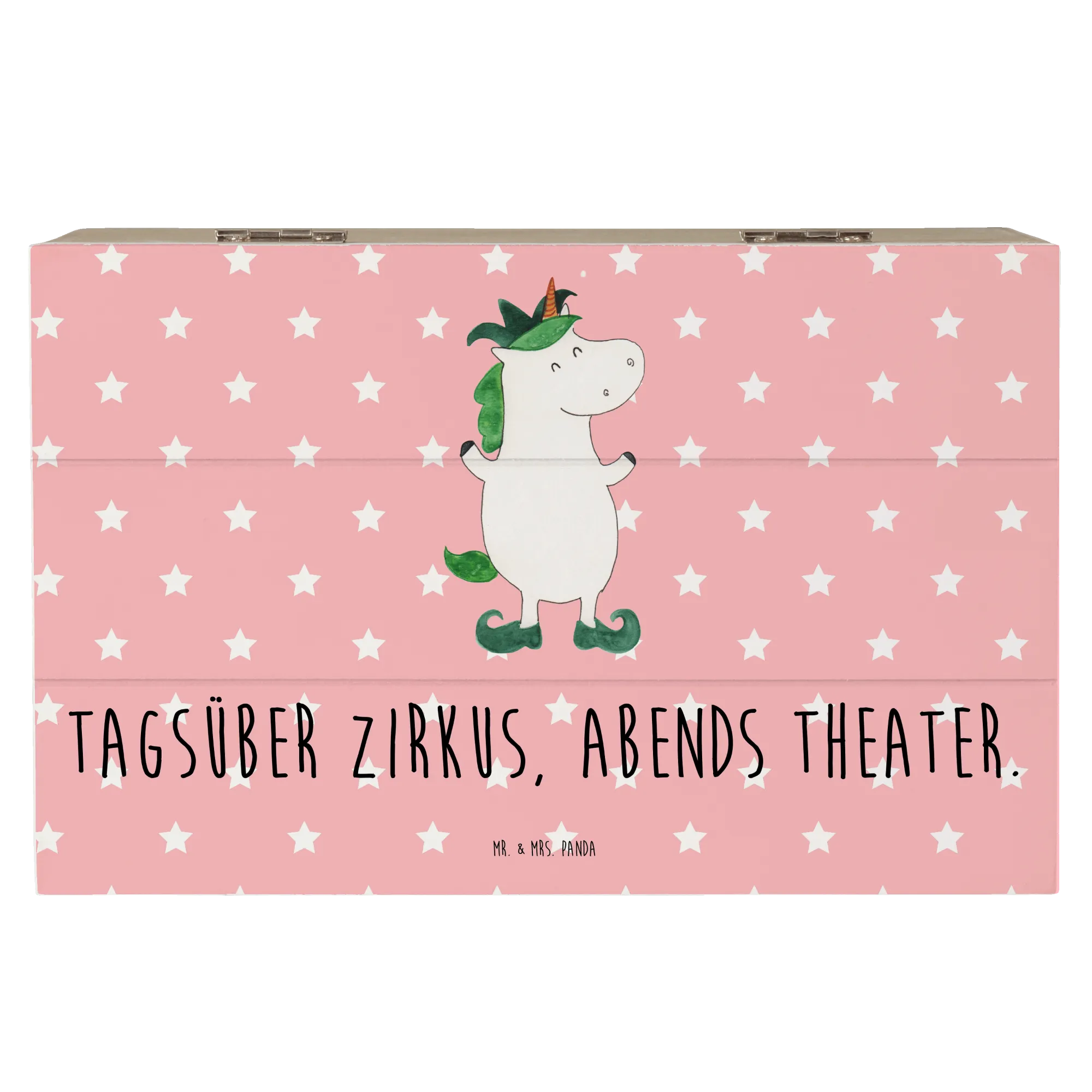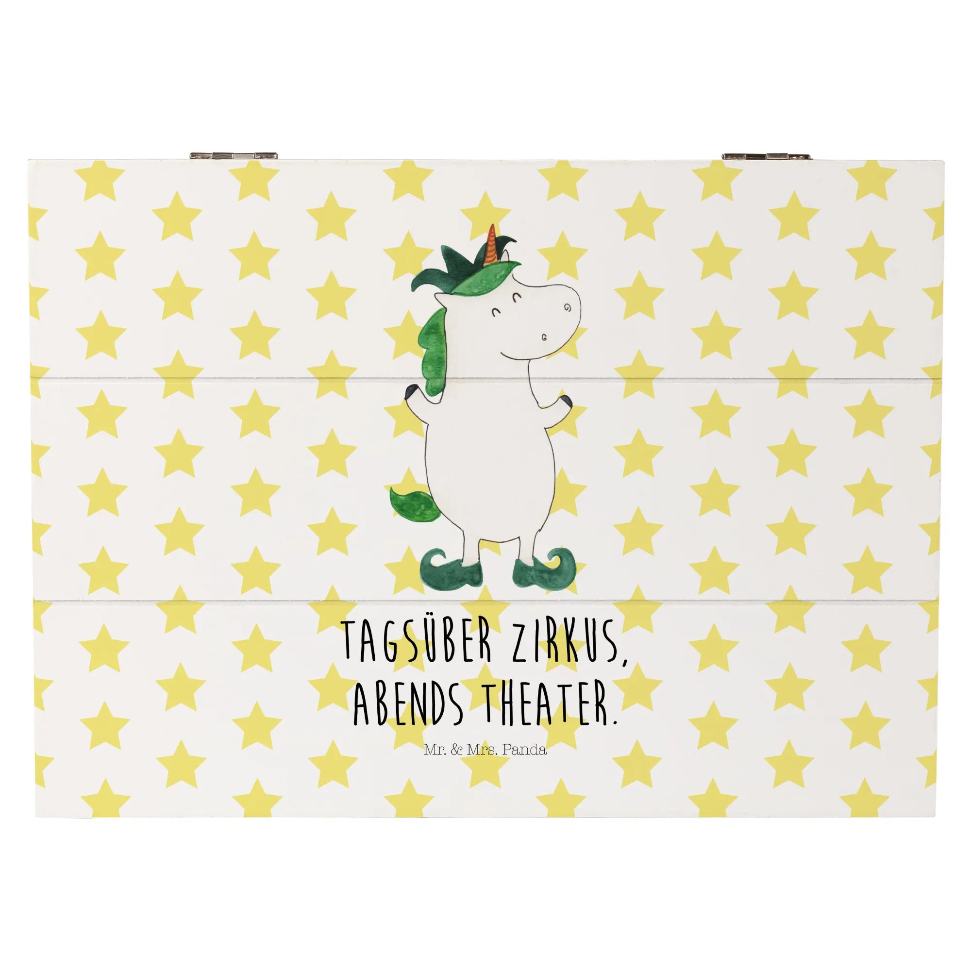 Die wunderschöne Holzkiste Einhorn Joker von Mr. & Mrs. Panda ist das perfekte Geschenk für alle kleinen Einhorn-Fans und jeden, der die zauberhafte Welt der Einhörner liebt. Diese besondere Kiste gehört zur Einhorn - Kollektion und begeistert mit einem handgezeichneten Motiv eines niedlichen Einhorns, das sich als fröhlicher Gaukler präsentiert. 'Tagsüber Zirkus, abends Theater' - so lautet unser Slogan, der die lebensfrohe Ausstrahlung dieser Kiste perfekt unterstreicht.