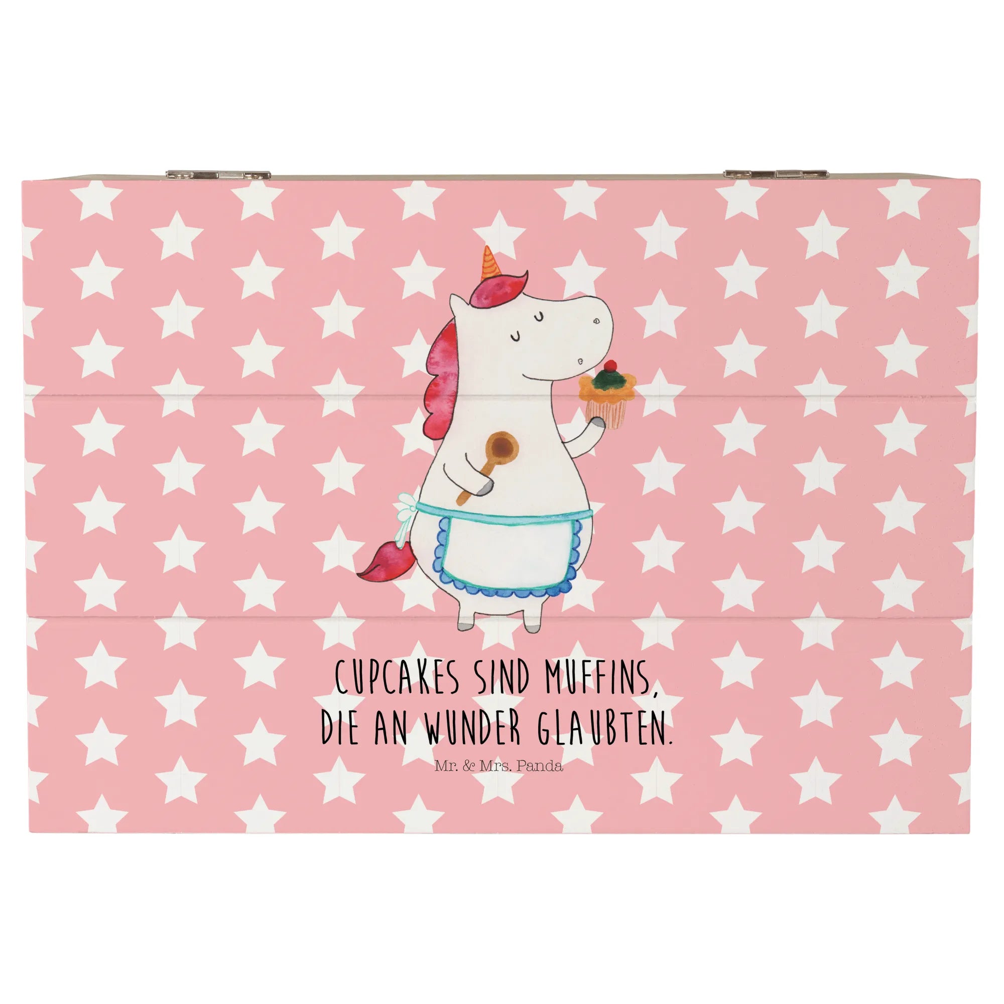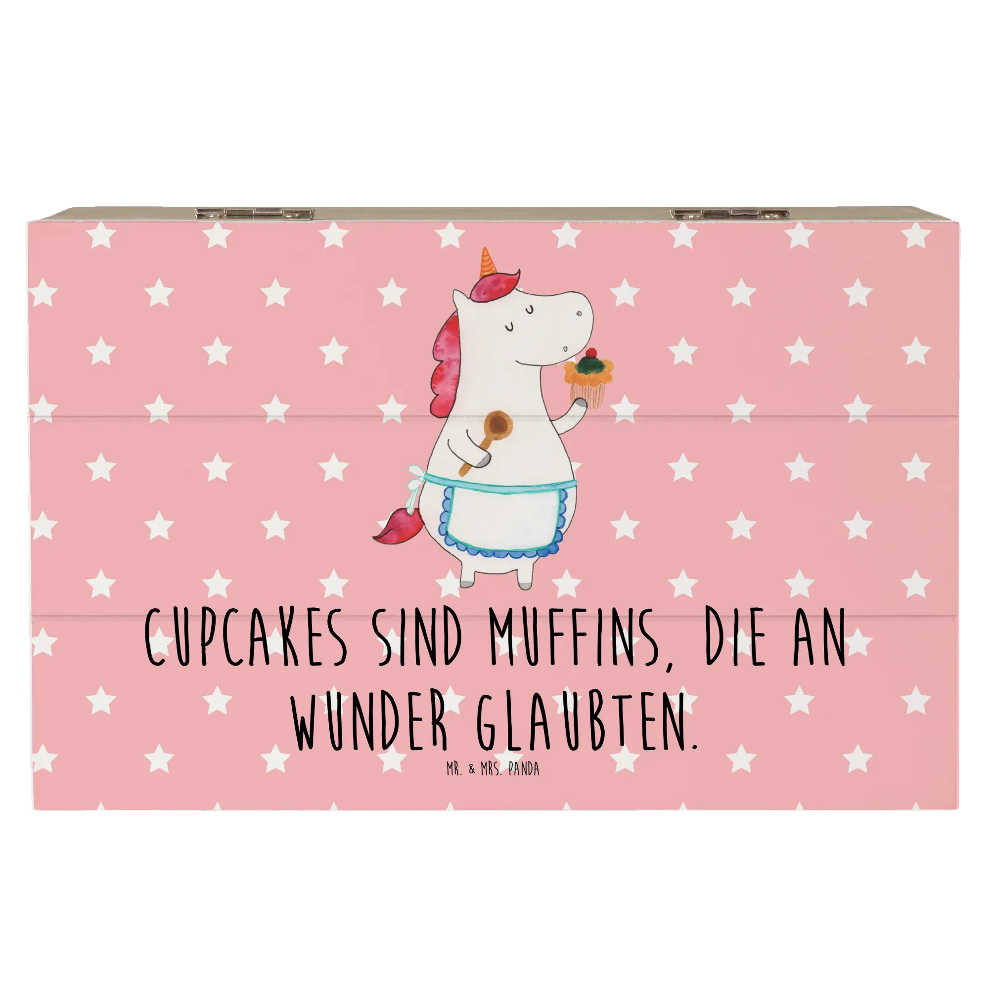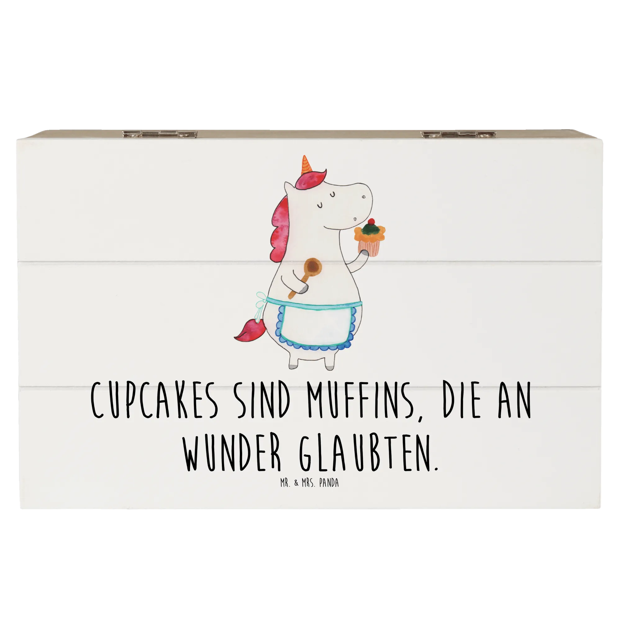 Die wunderschöne Holzkiste "Einhorn Küchenfee" von Mr. & Mrs. Panda ist der perfekte Begleiter für all deine wertvollen Erinnerungen. Mit ihrem charmanten Einhorn-Motiv und dem liebevollen Spruch "Cupcakes sind Muffins, die an Wunder glaubten" bezaubert sie kleine und große Einhorn-Fans gleichermaßen.