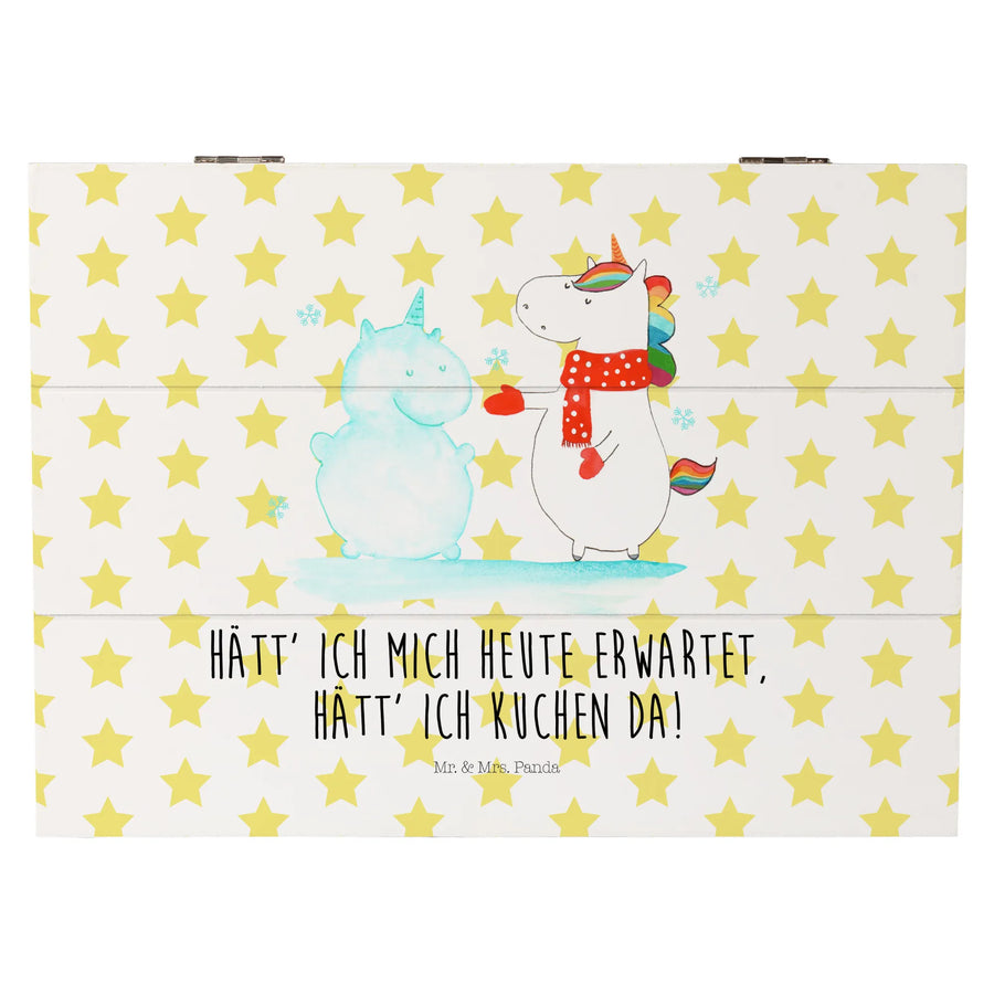 Unsere Holzkiste aus der Einhorn - Kollektion von Mr. & Mrs. Panda vereint liebevolles Design und praktischen Nutzen. Das von Mrs. Panda handgezeichnete Aquarell zeigt ein süßes Einhorn beim Schneemannbauen – ein Motiv, das sofort gute Laune macht. Der freche Spruch „Hätt‘ ich mich heute erwartet, hätt‘ ich Kuchen da!“ sorgt zusätzlich für Schmunzeln und passt perfekt zur winterlichen Stimmung.