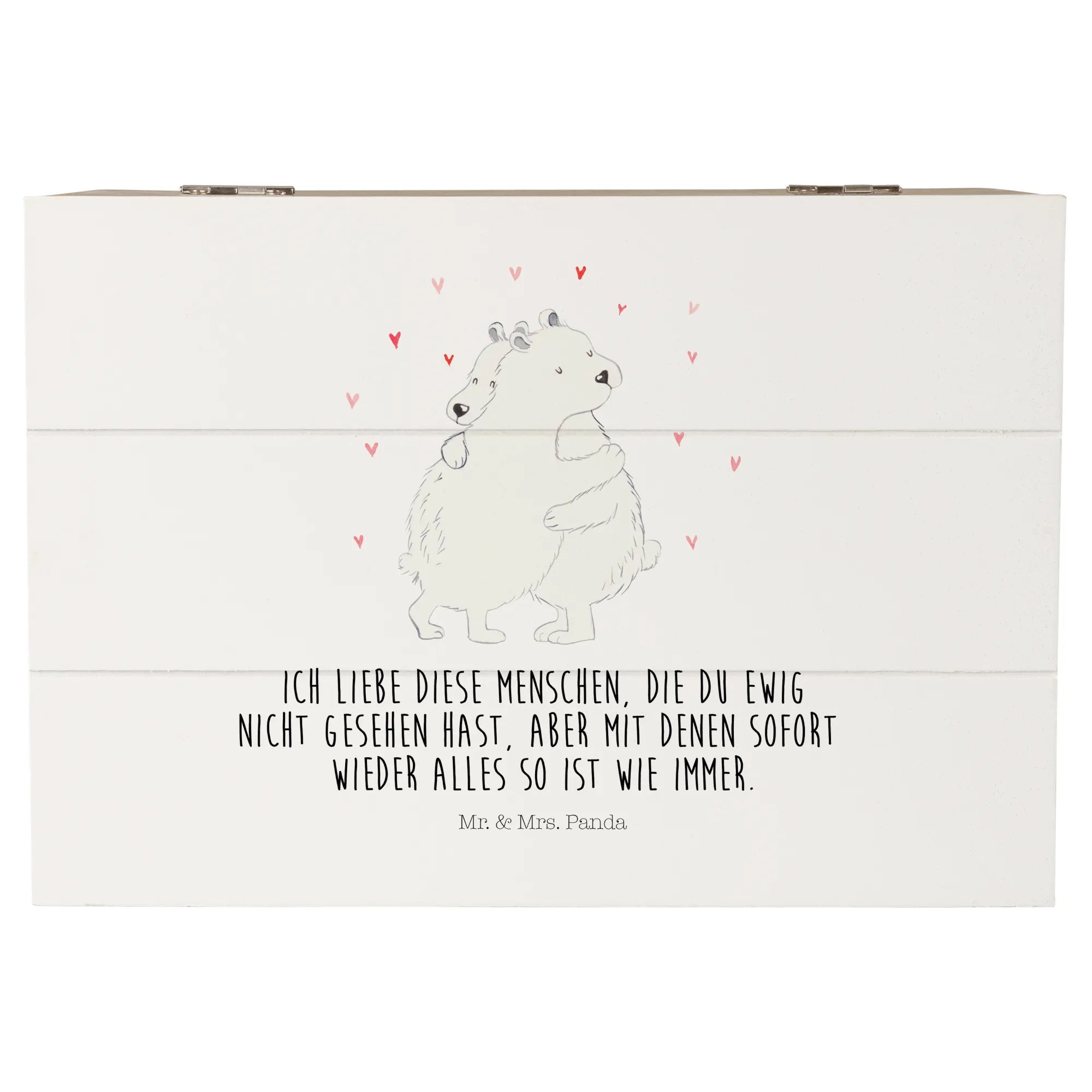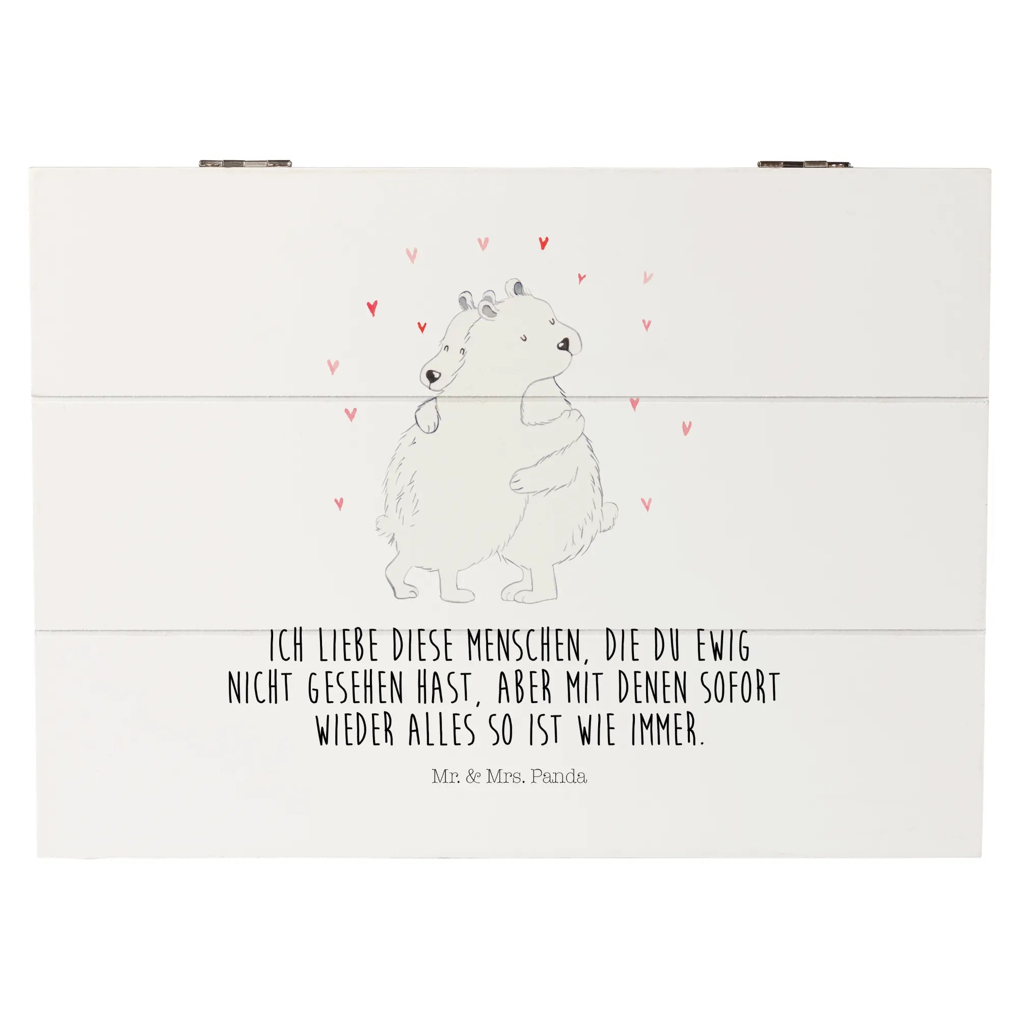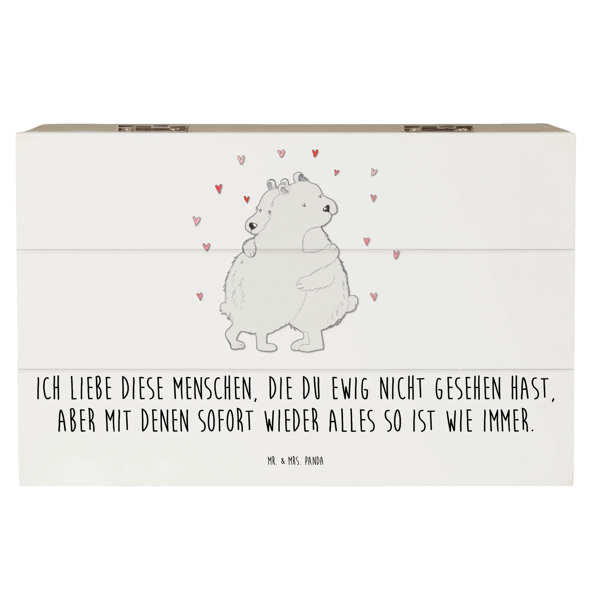 Auch der in vielen Teilen von Mr. & Mrs. Panda oft gebrauchte Spruch „Ich liebe diese Menschen, die du ewig nicht gesehen hast, aber mit denen sofort wieder alles so ist wie immer“ lässt sich perfekt in Verbindung mit dieser tollen Kiste bringen. Verschenke ein Stück Erinnerung und zum Strahlen gebrachten Glück mit der Holzkiste "Eisbär Umarmen" und lass die Menschen um dich herum wissen, wie wichtig sie dir sind!