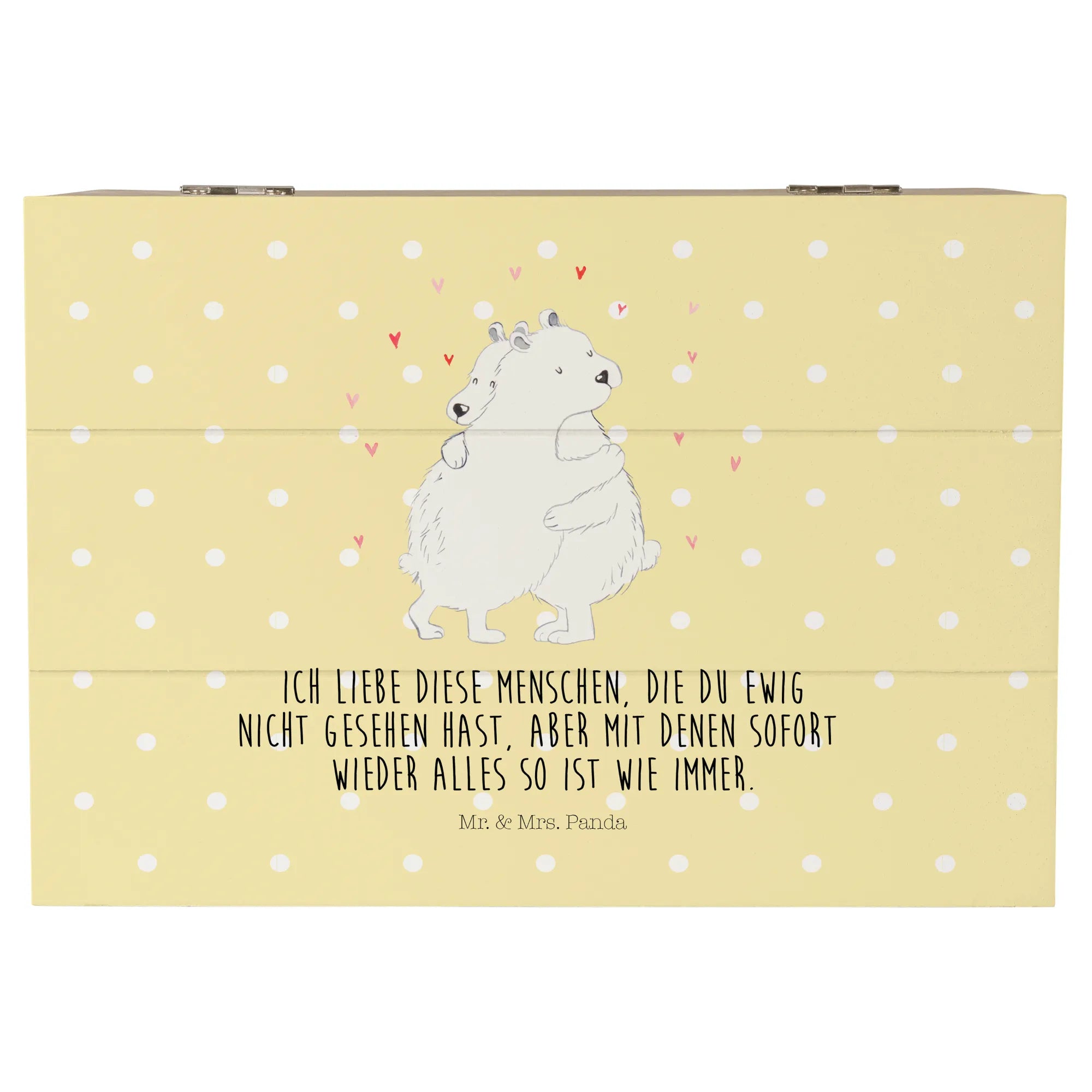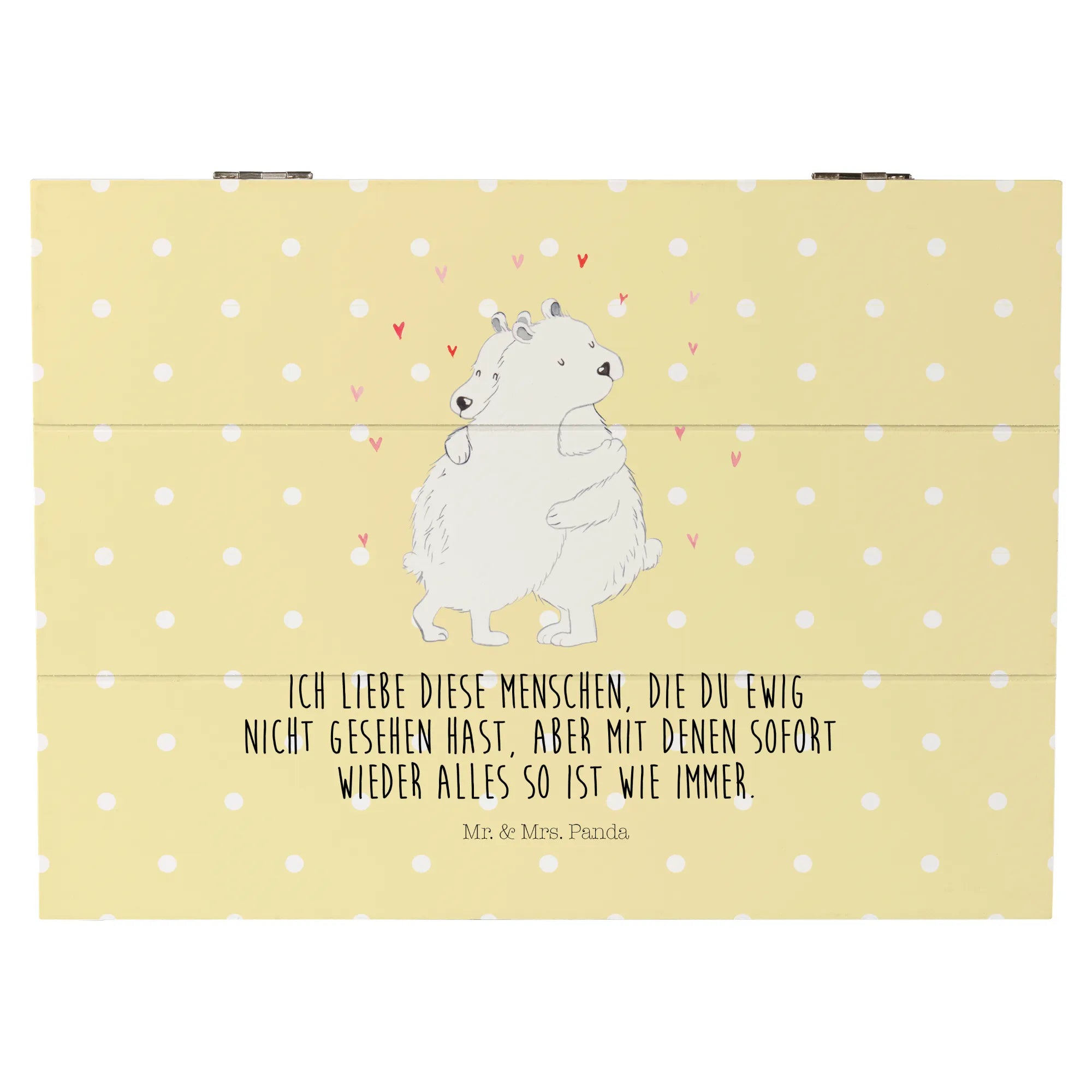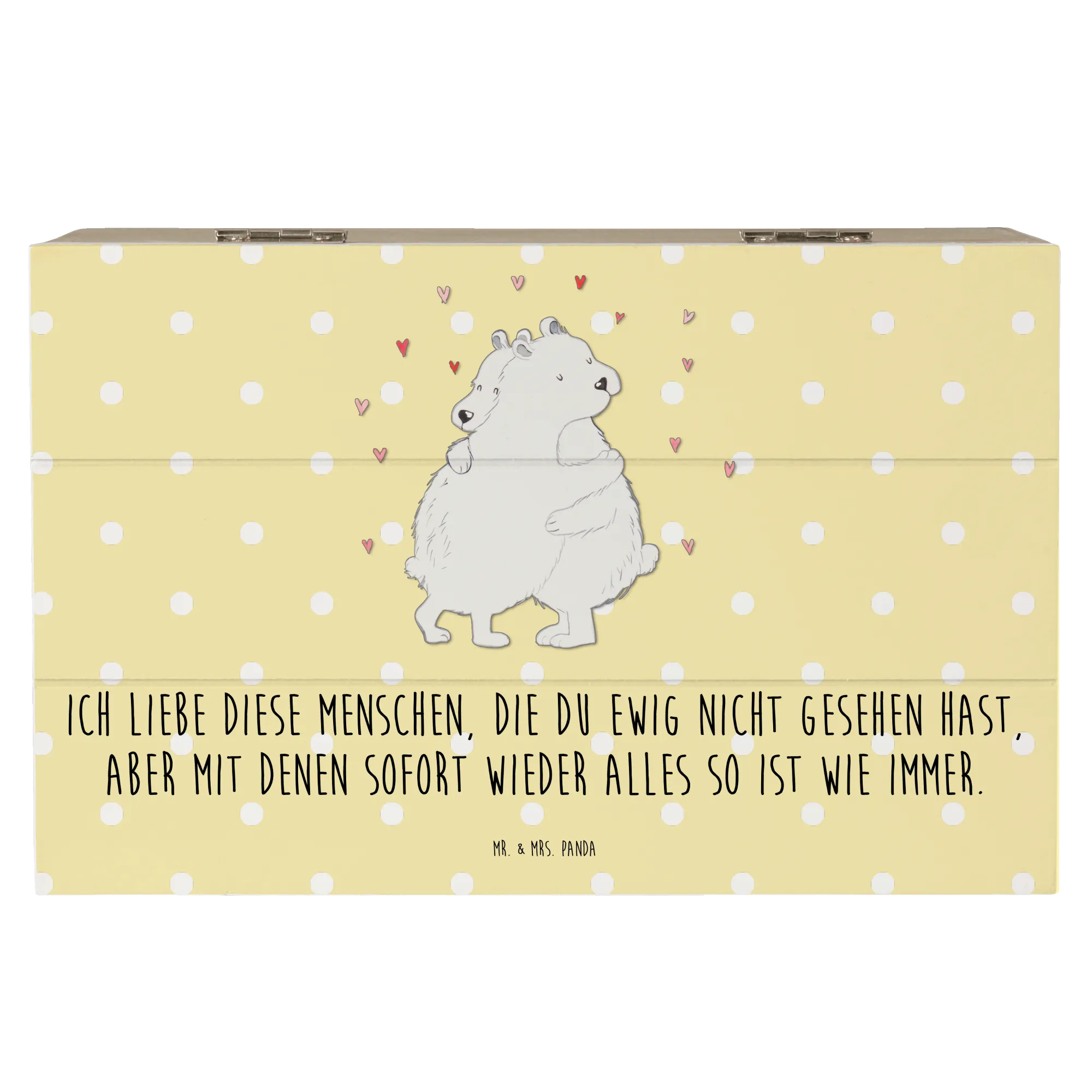 Auch der in vielen Teilen von Mr. & Mrs. Panda oft gebrauchte Spruch „Ich liebe diese Menschen, die du ewig nicht gesehen hast, aber mit denen sofort wieder alles so ist wie immer“ lässt sich perfekt in Verbindung mit dieser tollen Kiste bringen. Verschenke ein Stück Erinnerung und zum Strahlen gebrachten Glück mit der Holzkiste "Eisbär Umarmen" und lass die Menschen um dich herum wissen, wie wichtig sie dir sind!