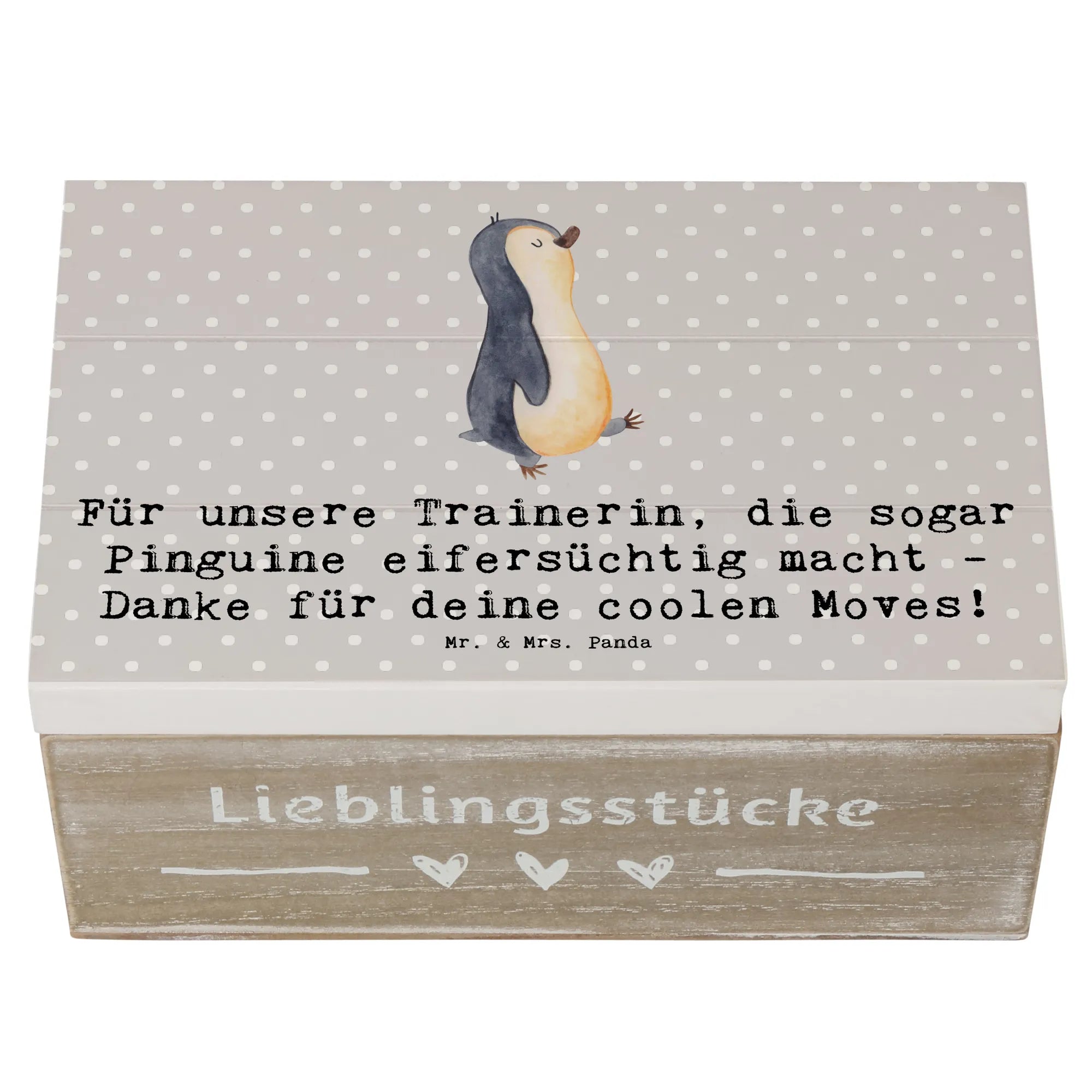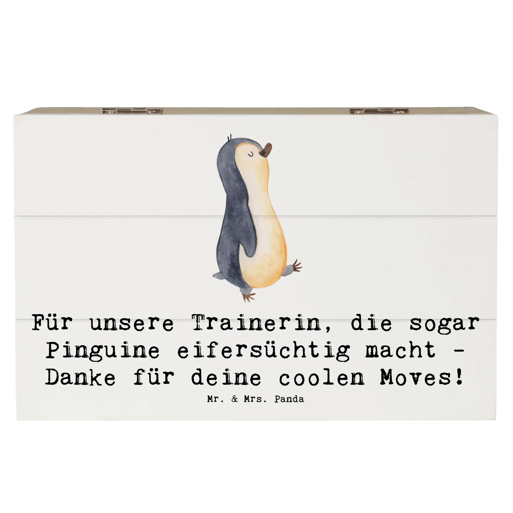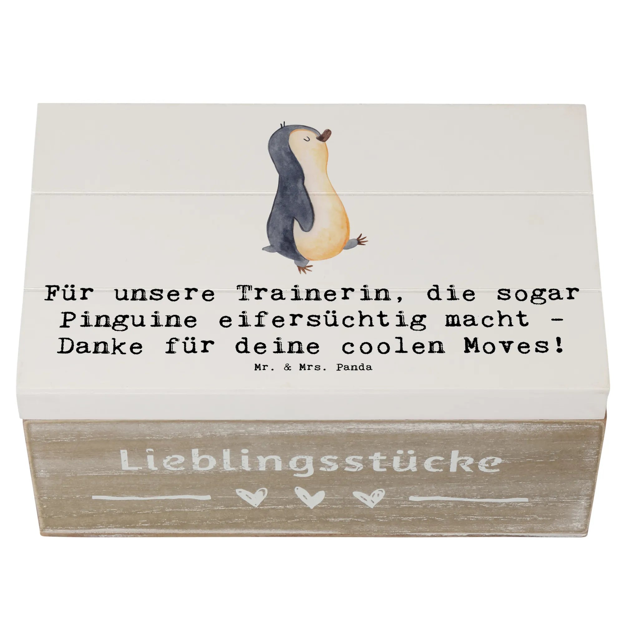 Mit dem süßen Spruch "Für unsere Trainerin, die sogar Pinguine eifersüchtig macht - Danke für deine coolen Moves!" wird jede Trainerin sich besonders wertgeschätzt fühlen. Die Holzkiste hat die Maße 220 mm x 150 mm x 120 mm und das Gewicht von 540 g macht sie nicht nur stabil, sondern auch ideal für eine Vielzahl von Verwendungsmöglichkeiten.