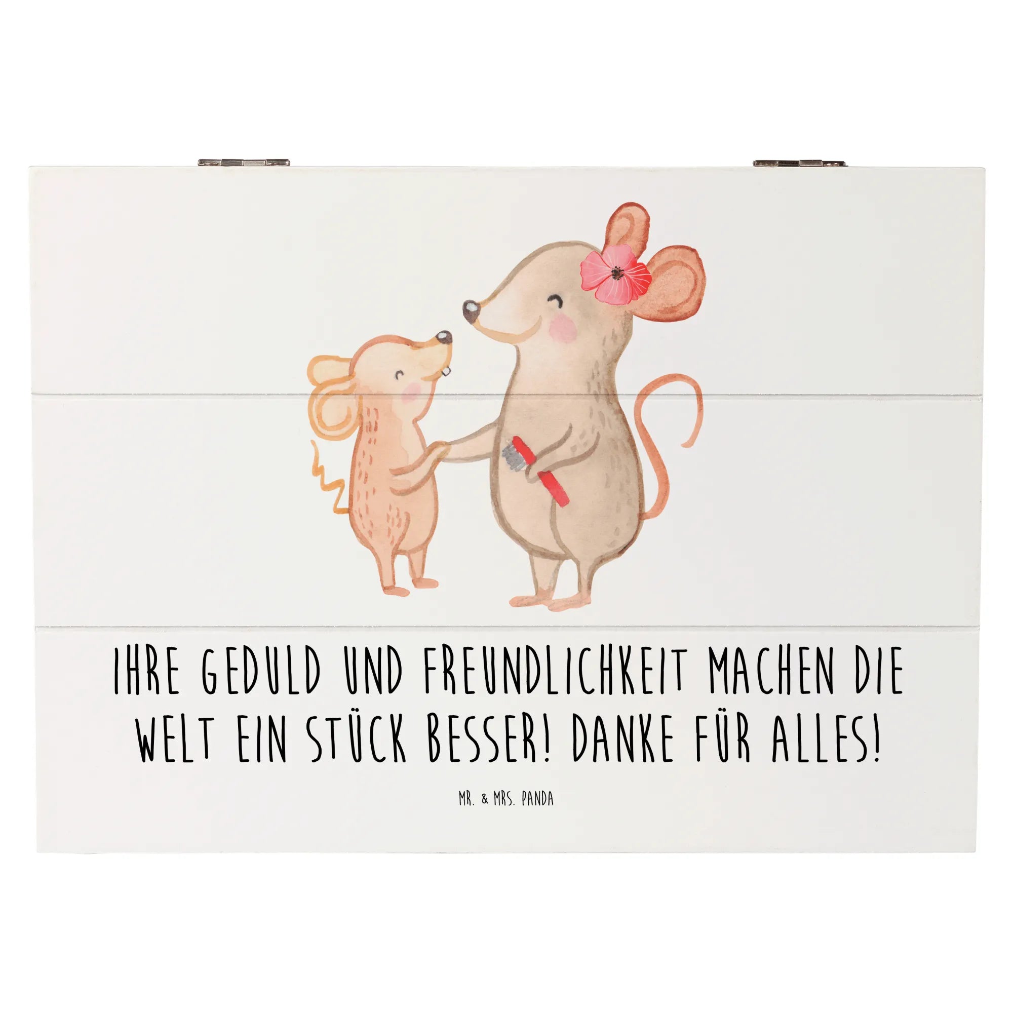 Die besonderen Einschlagscharniere ermöglichen ein einfaches Öffnen und Schließen, während die wunderschöne Schrift 'Ihre Geduld und Freundlichkeit machen die Welt ein Stück besser! Danke für alles!' genau das ausdrückt, was Du fühlen möchtest. Diese Kiste aus der dankbaren Kollektion von Mr. & Mrs. Panda ist ideal, um mit einem liebevollen Geschenk einfach mal "Danke" zu sagen.