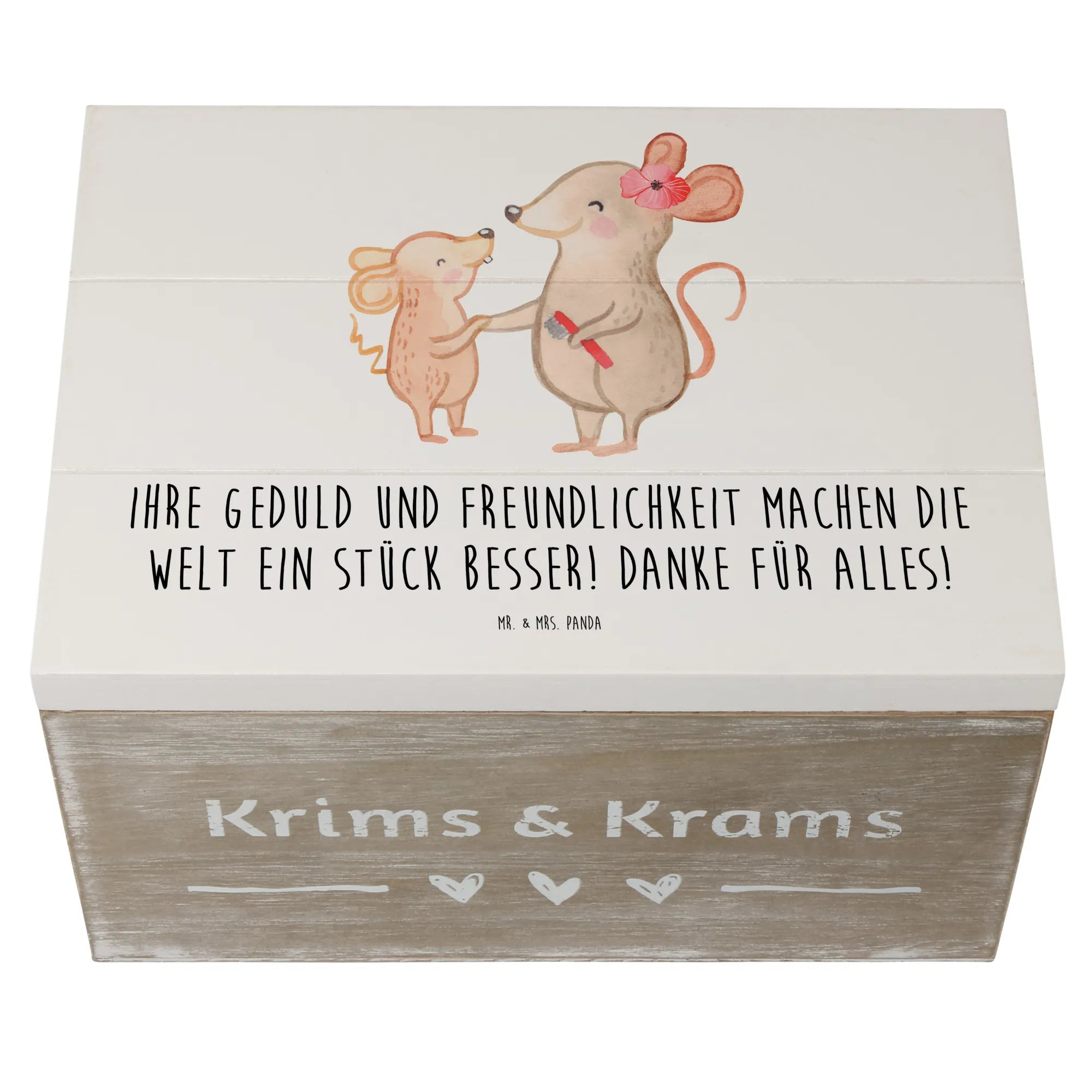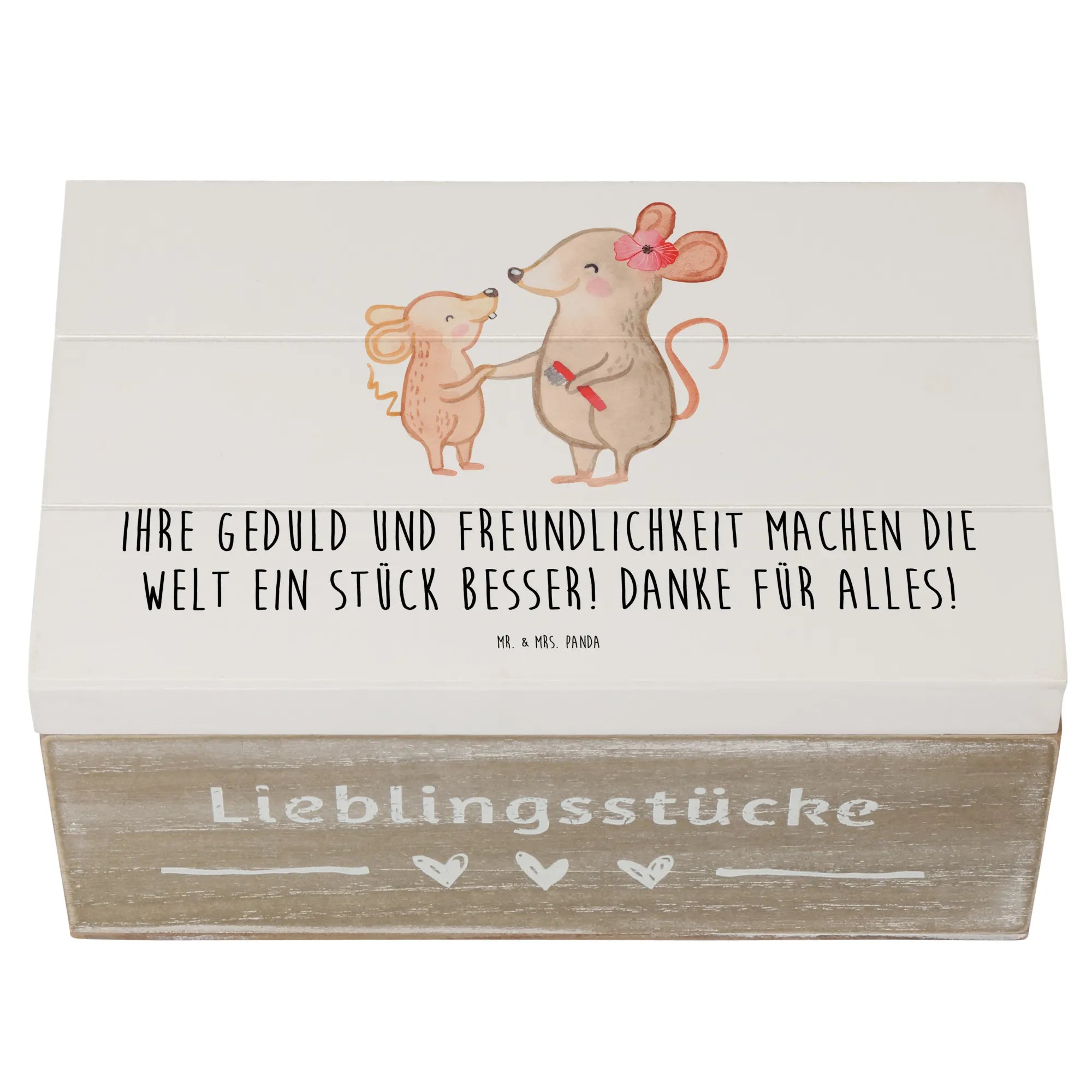 Diese wunderschöne Holzkiste von Mr. & Mrs. Panda ist das perfekte Geschenk für Erzieher, um ihnen für ihre Geduld und Freundlichkeit zu danken. Die Kiste ist mit dem herzlichen Spruch "Ihre Geduld und Freundlichkeit machen die Welt ein Stück besser! Danke für alles!" bedruckt, was sie zu einem ganz besonderen Erinnerungsgeschenk macht. Ob zum Ende des Schuljahres, zu besonderen Anlässen oder einfach als kleine Aufmerksamkeit – diese Holzkiste ist ideal, um wertvolle Erinnerungen, Geschenke oder kleine Schätze aufzubewahren.