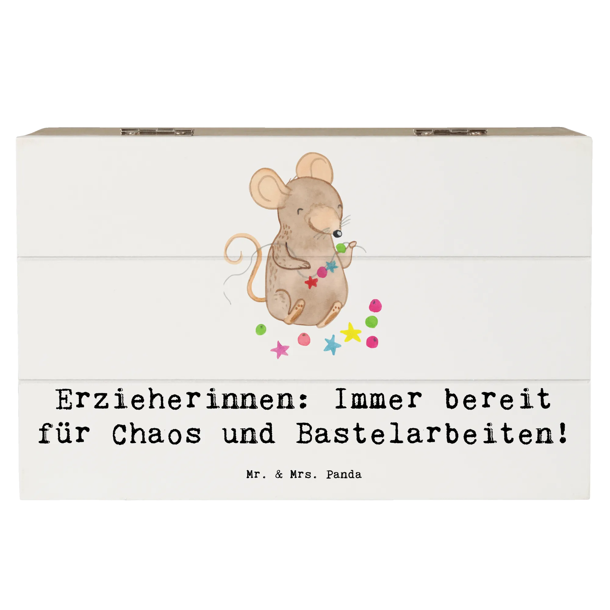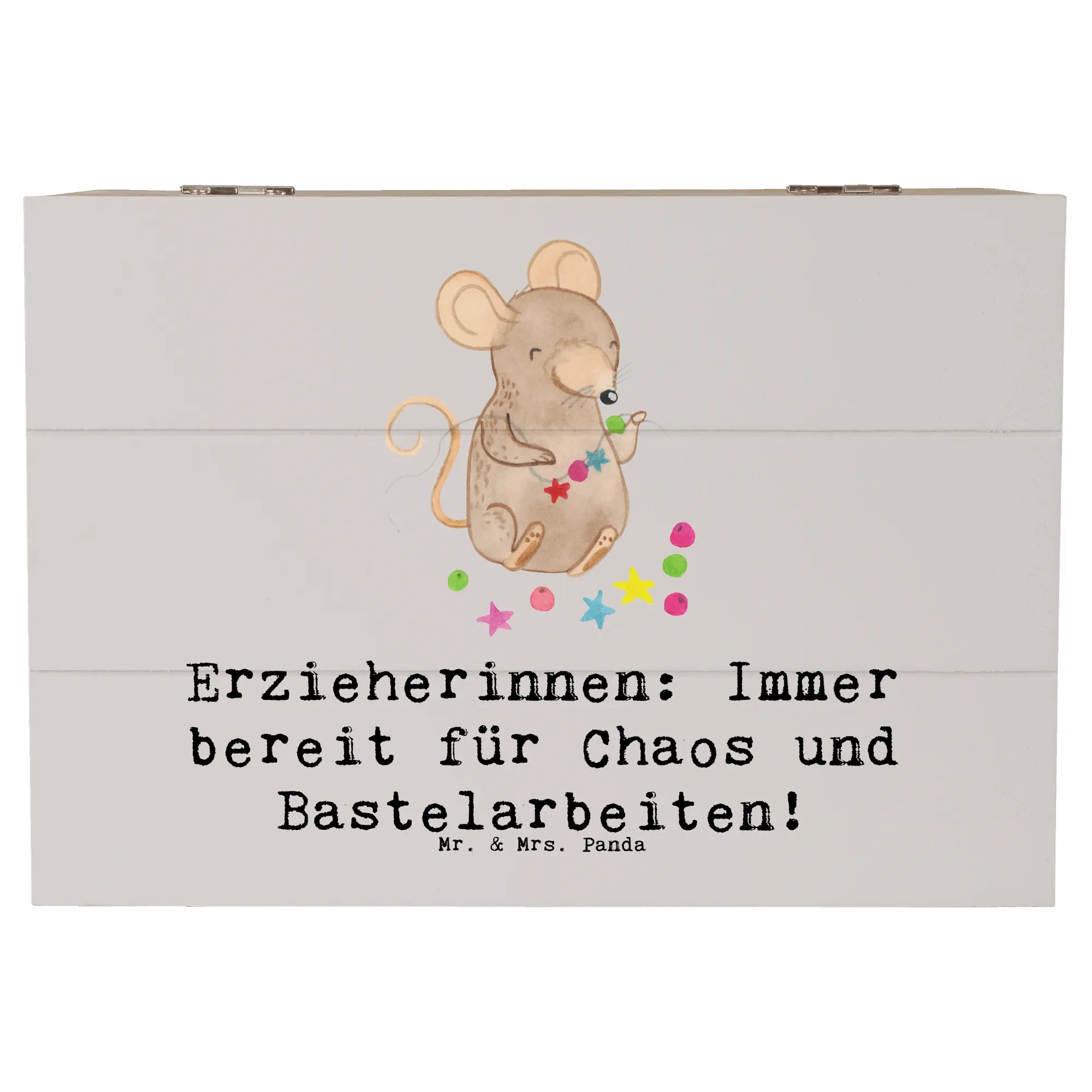 Die wunderschöne Holzkiste von Mr. & Mrs. Panda ist das perfekte Geschenk für Erzieherinnen! Mit dem liebevollen Slogan "Erzieherinnen: Immer bereit für Chaos und Bastelarbeiten!" bringt diese Kiste nicht nur ein Lächeln ins Gesicht, sondern bietet auch einen praktischen Aufbewahrungsort für all die schönen Erinnerungen, Kreativprojekte und die kleinen Schätze des Alltags.