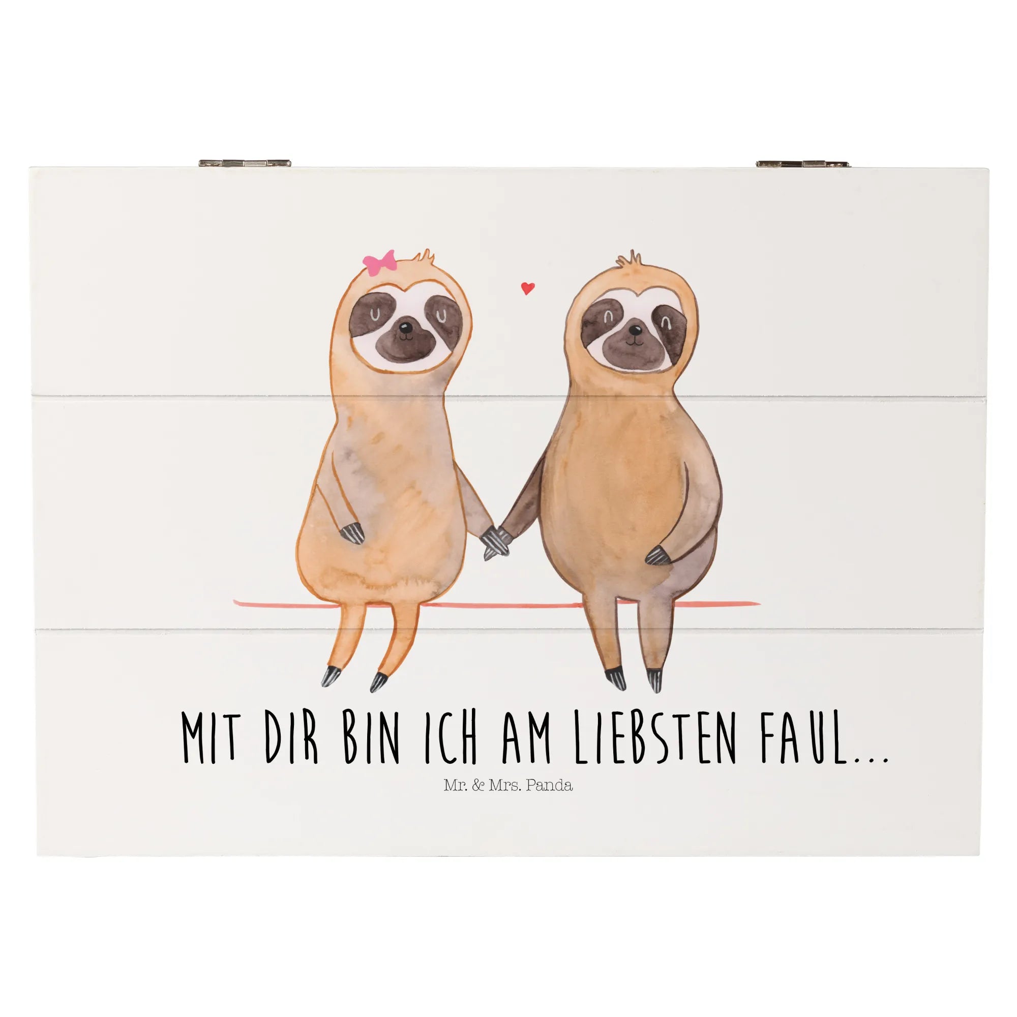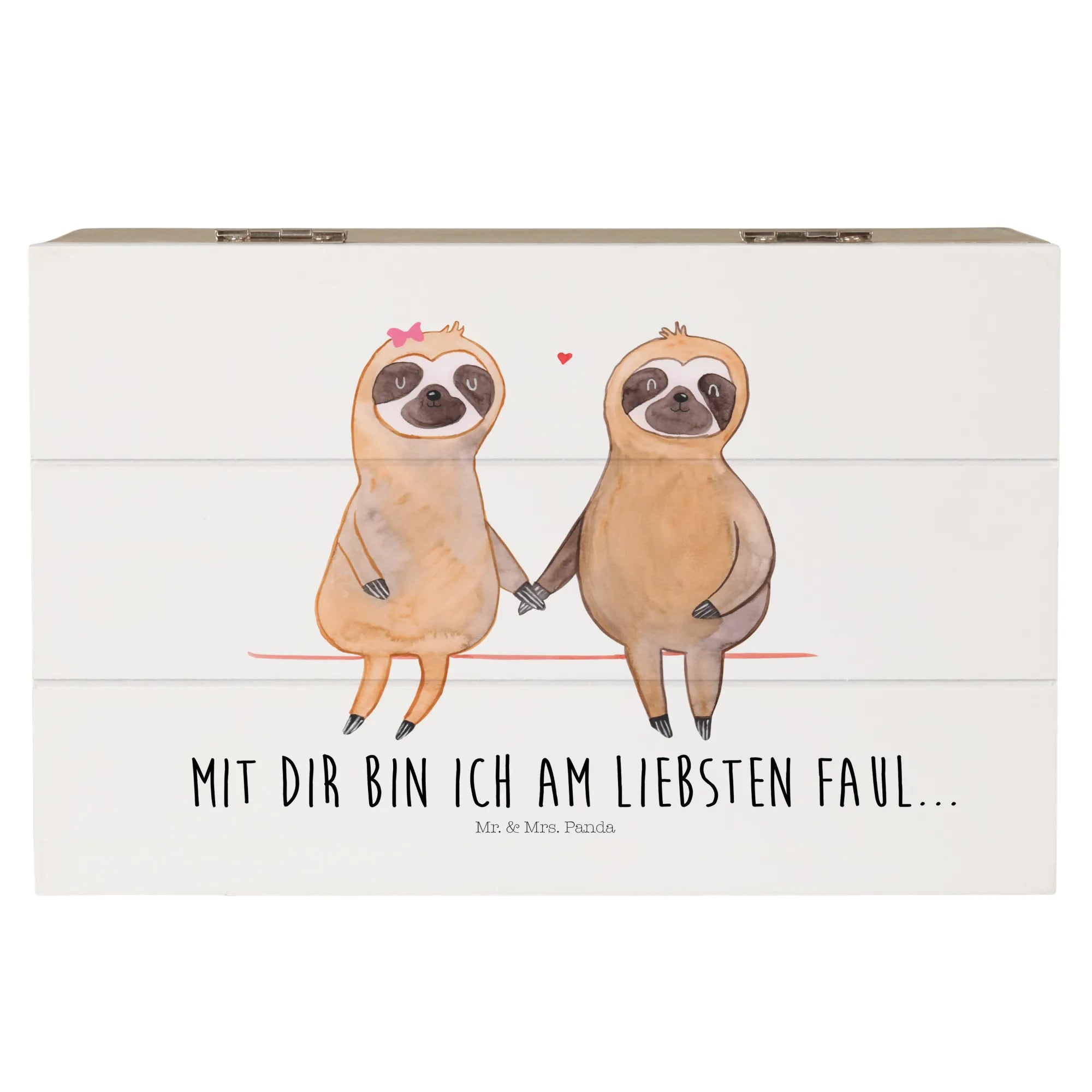 Entdecke die perfekte Holzkiste für Paare mit einem Sinn für Romantik und einem besonderen Platz für gemeinsame Erinnerungen! Diese wunderschöne Holzkiste von Mr. & Mrs. Panda ist mit einem handgezeichneten Aquarell-Motiv eines süßen Faultierpärchens verziert, das sich an den Händen hält. Erlebe die liebevolle Botschaft: 'Mit dir bin ich am Liebsten faul...' in Deinem Zuhause.