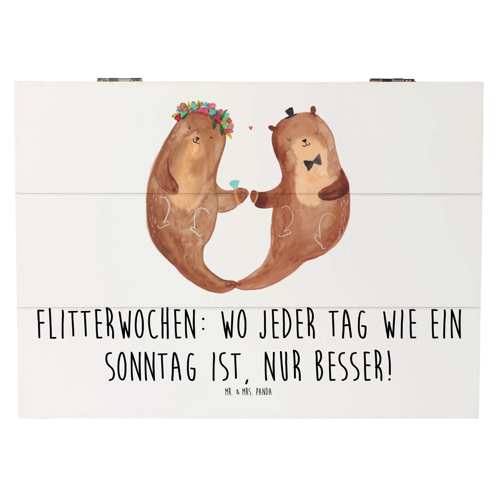 Entdecke die wunderschöne Holzkiste "Flitterwochen" von Mr. & Mrs. Panda - der perfekte Begleiter für Eure gemeinsamen Erinnerungen! Diese zauberhafte Erinnerungskiste ist nicht nur ein Aufbewahrungsort für all die Schätze, die Ihr während Eurer Hochzeitsreise sammeln werdet, sondern auch eine stilvolle Dekokiste, die jeden Raum mit ihrem charmanten Design verschönert. Mit einem liebevollen Spruch, "Flitterwochen: Wo jeder Tag wie ein Sonntag ist, nur besser!", erinnert sie Euch jeden Tag an die schönen Momente Eurer gemeinsamen Zeit.