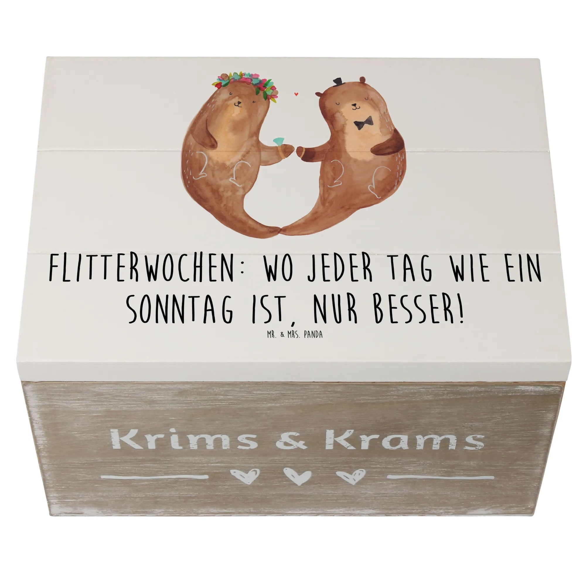 Der charmante Spruch "Flitterwochen: Wo jeder Tag wie ein Sonntag ist, nur besser!" verleiht der Kiste eine romantische Note, die das Herz eines jeden frisch vermählten Paares höherschlagen lässt.