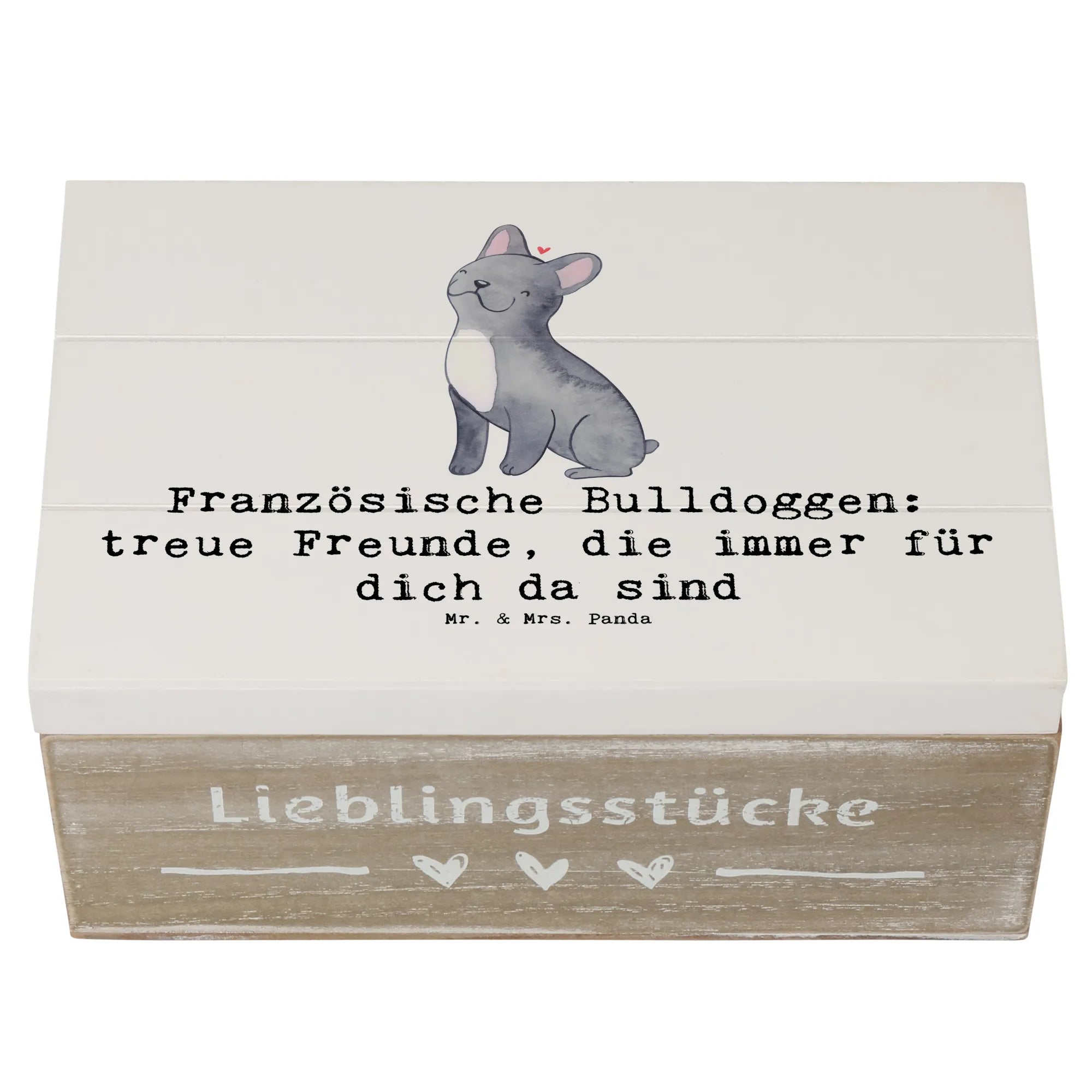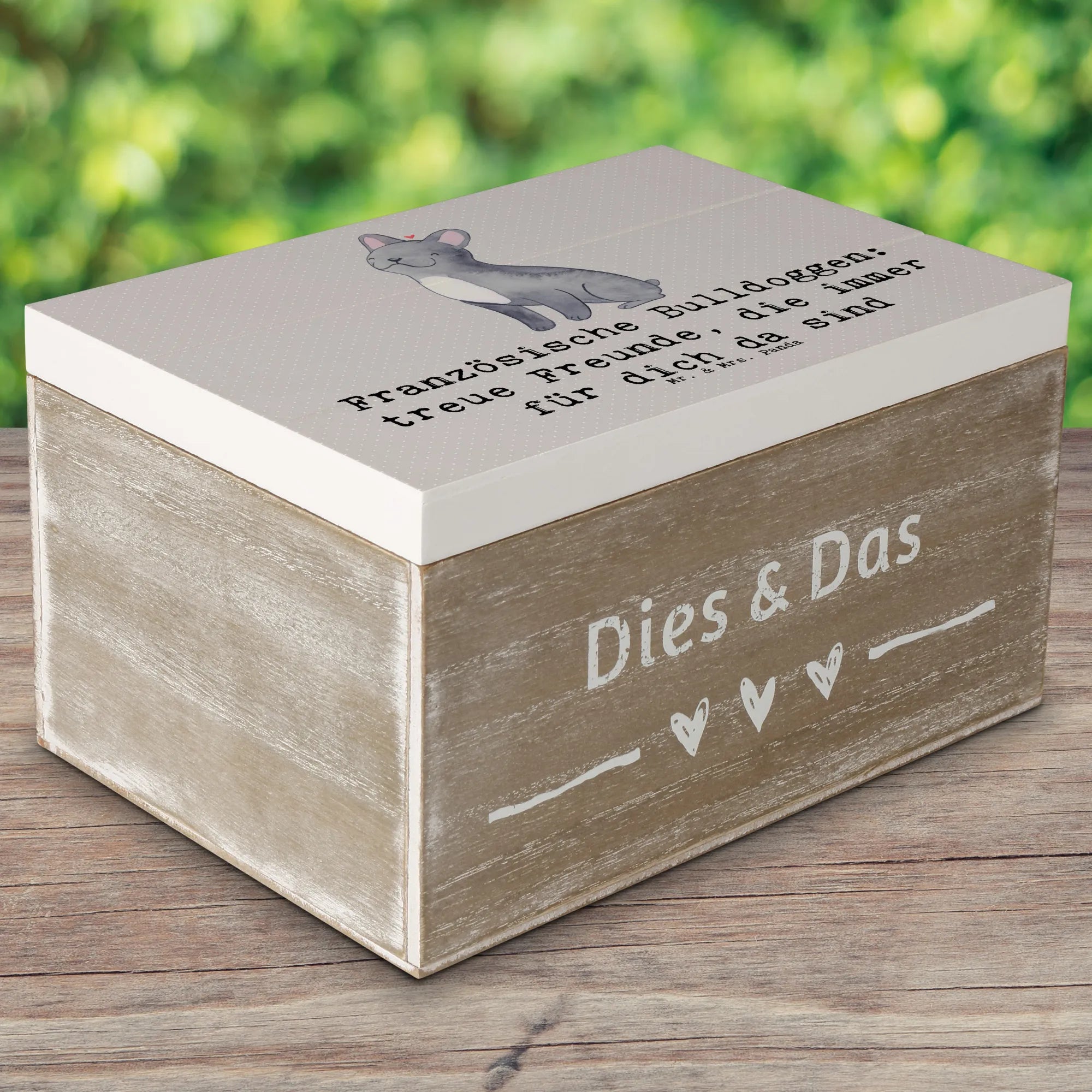 Entdecke die zauberhafte Holzkiste mit dem süßen Motiv der Französischen Bulldogge von Mr. & Mrs. Panda! Diese wunderschöne und robuste Kiste ist nicht nur ein echter Blickfang, sondern auch der perfekte Aufbewahrungsort für all deine wertvollen Schätze. Ob du Erinnerungen an besondere Anlässe, Fotos von unvergesslichen Momenten oder kleine Geschenke sicher aufbewahren möchtest, diese Erinnerungskiste ist dafür ideal geeignet. Mit dem Slogan "Französische Bulldoggen: treue Freunde, die immer für dich da sind" bringt sie einen liebevollen Touch in dein Zuhause.