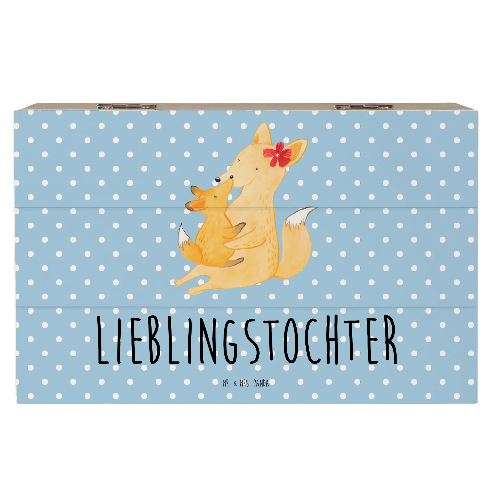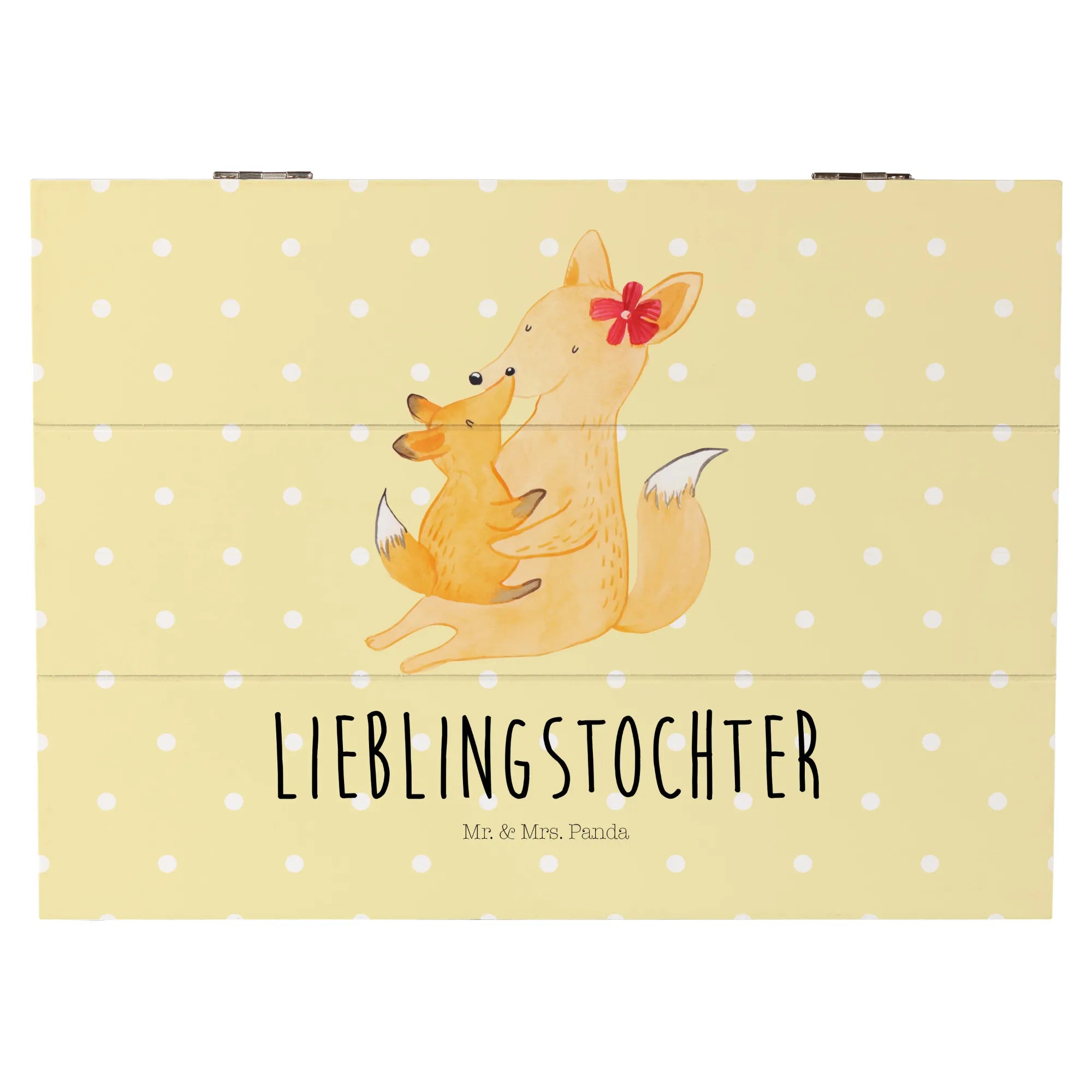 Das zauberhafte Motiv zeigt die Füchsin mit ihrem kleinen Fuchs, die zusammen eine herzliche Umarmung teilen. Diese liebevolle Darstellung strahlt Geborgenheit und familiäre Zuneigung aus und wird nicht nur Kinder, sondern auch Eltern und Großeltern verzaubern. Der Text 'Lieblingstochter' verleiht der Kiste eine besondere Note, perfekt für die beste Tochter der Welt.