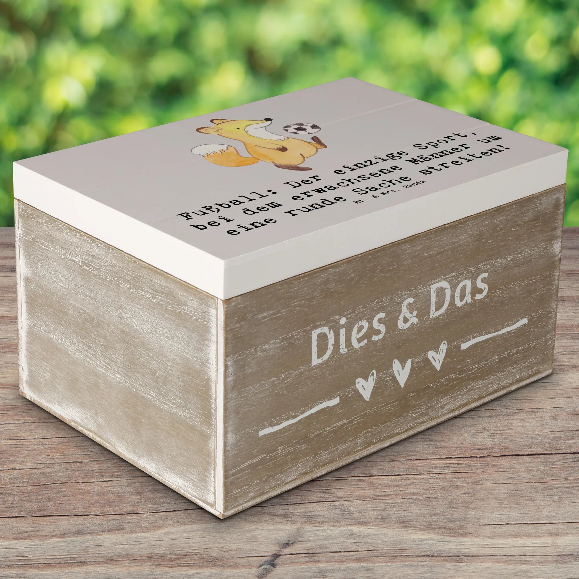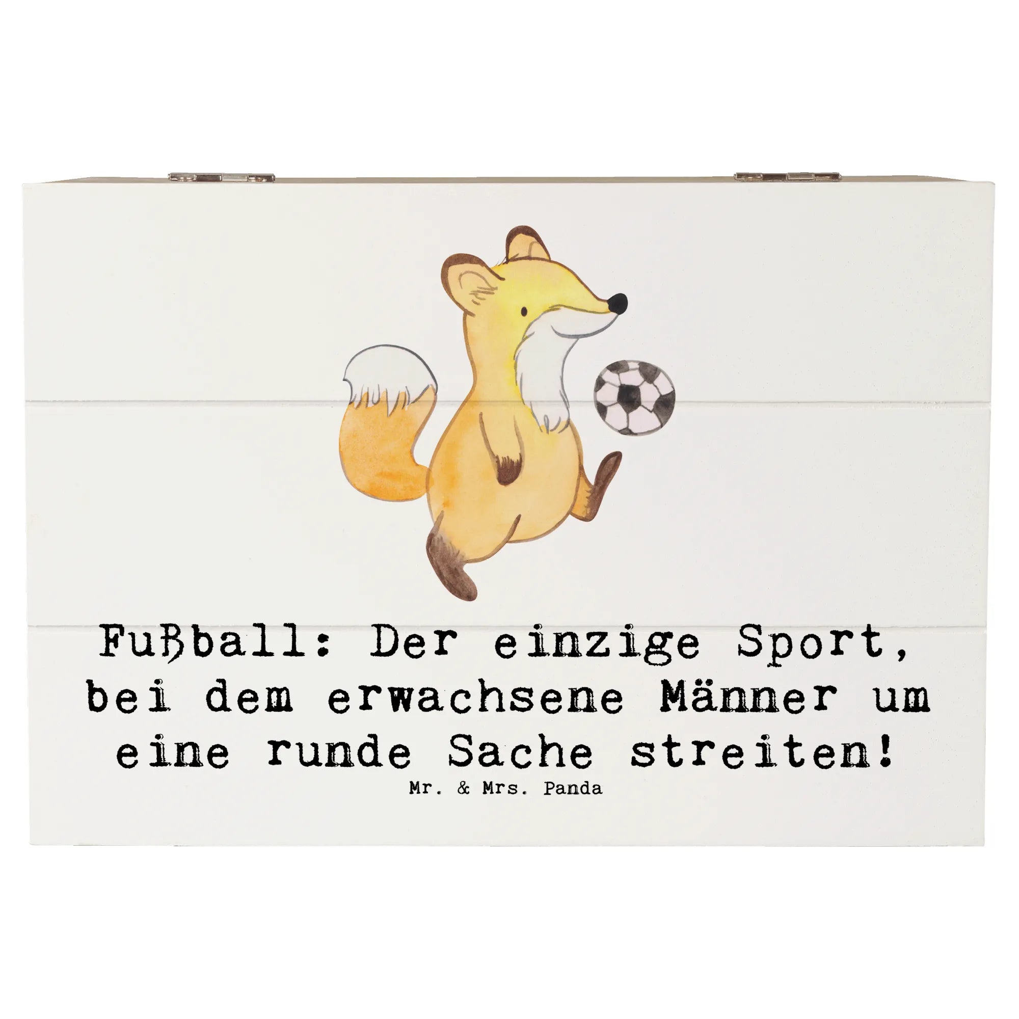 Mr. & Mrs. Panda Holzkiste „Fußball“ – die perfekte Kombination aus Charme, Funktion und sportlicher Leidenschaft. Gedruckt mit dem witzigen Spruch „Fußball: Der einzige Sport, bei dem erwachsene Männer um eine runde Sache streiten!“, ist diese Erinnerungskiste ein liebevolles Geschenk für Spieler, Trainer und Fans.