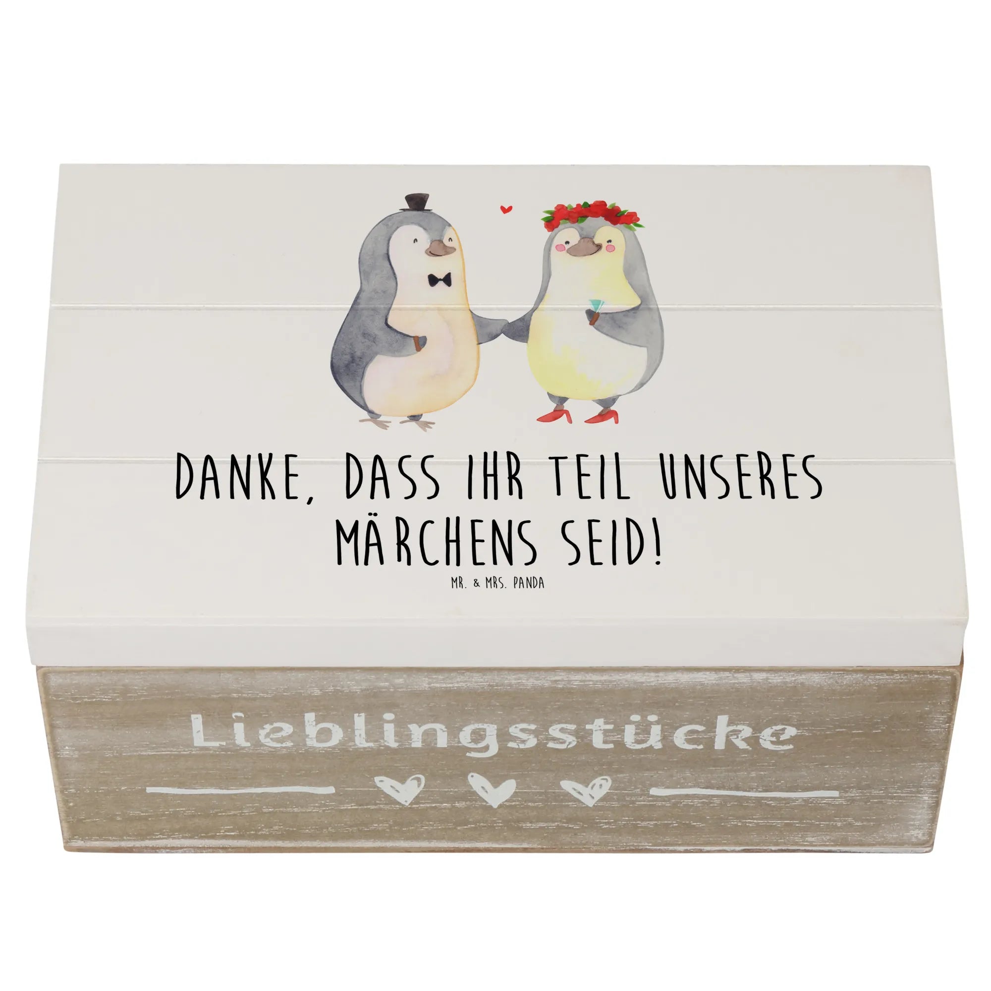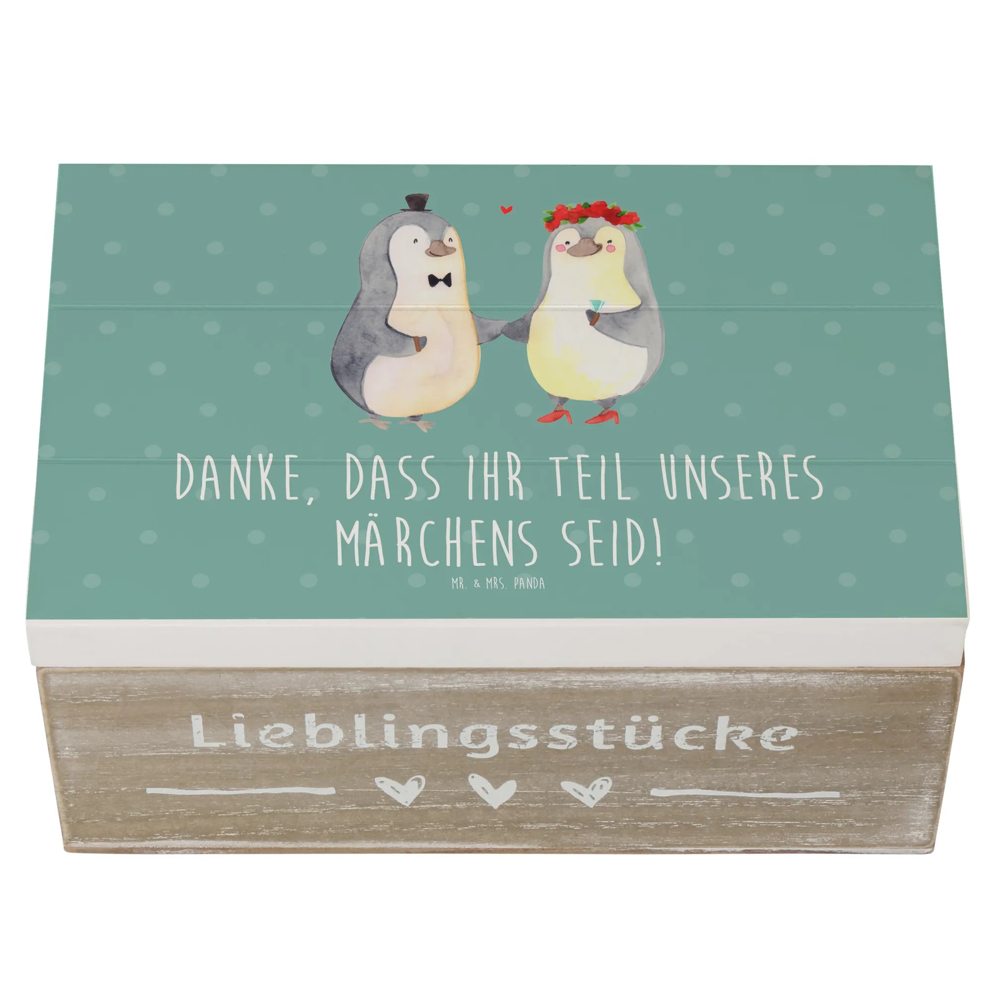 Entdecke unsere wunderschöne Holzkiste mit dem bezaubernden Motiv "Gastgeschenke" aus der einzigartigen Hochzeitskollektion von Mr. & Mrs. Panda! Diese Erinnerungskiste ist nicht nur ein praktischer Aufbewahrungsort für all die wundervollen Schätze, die du an deinem besonderen Tag sammeln möchtest, sondern auch ein perfekt durchdachtes Geschenk für deine Hochzeitsgäste. Mit dem liebevollen Spruch "Danke, dass ihr Teil unseres Märchens seid!" vermittelt diese Kiste Dankbarkeit und Freude, die man mit seinen Liebsten teilen möchte.