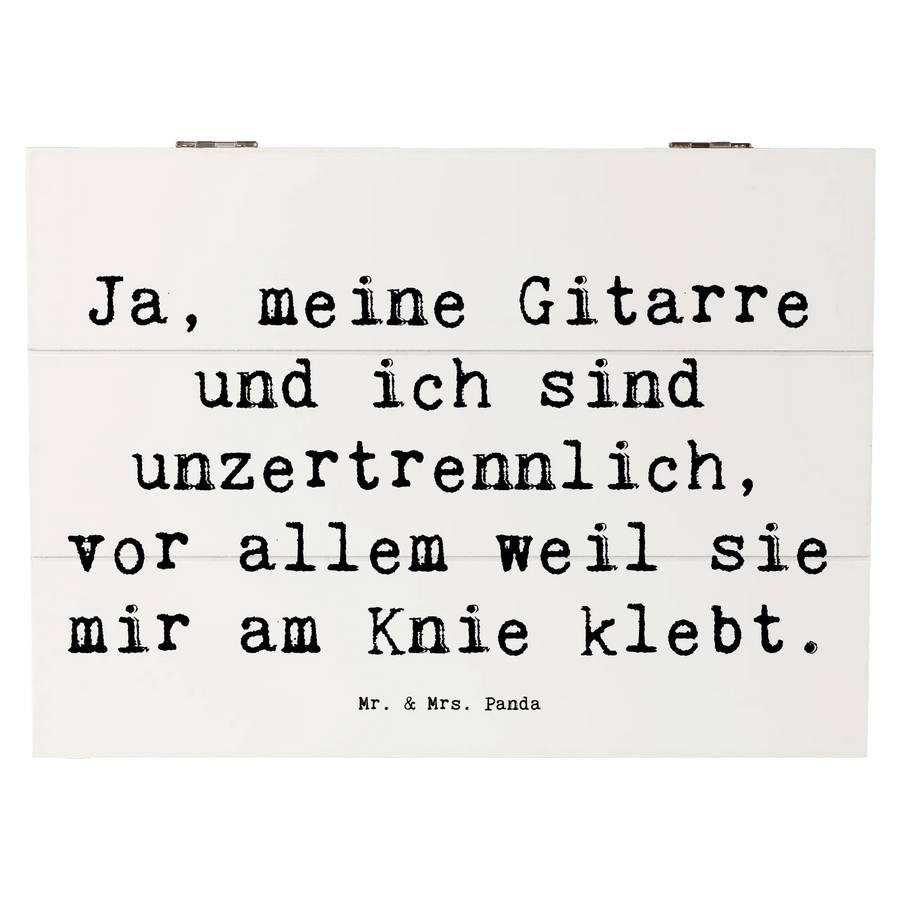 Mit dem lustigen Spruch "Ja, meine Gitarre und ich sind unzertrennlich, vor allem weil sie mir am Knie klebt." bringt diese Kiste nicht nur ein Lächeln auf die Lippen, sondern spiegelt auch die Beziehung zwischen einem Musiker und seinem Instrument wider. Sie ist ideal als nachhaltige und wiederverwendbare Geschenkbox, die Freude macht und dabei auch noch gut aussieht.