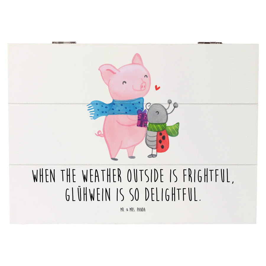 Die Holzkiste Glühschwein Smörle von Mr. & Mrs. Panda ist das perfekte Geschenk für all diejenigen, die die winterliche Atmosphäre lieben und die Magie der Weihnachtszeit in jedem Detail spüren möchten. In wunderschönem, handgezeichnetem Design erstrahlt diese Kiste in winterlichem Glanz mit unserem süßen Glühschwein, das mit einem blauen, gepunkteten Schal um den Hals und einem freudigen Lächeln die Herzen erwärmt. Neben ihm präsentiert sich Smörle, der stolze Marienkäfer, ebenfalls gut gelaunt und schmückt die Kiste mit seinem grünen gestreiften Schal. Die beiden bringen eine Botschaft der Freundschaft und des Teilens, perfekt kombiniert mit dem Slogan "When the weather outside is frightful, Glühwein is so delightful!".