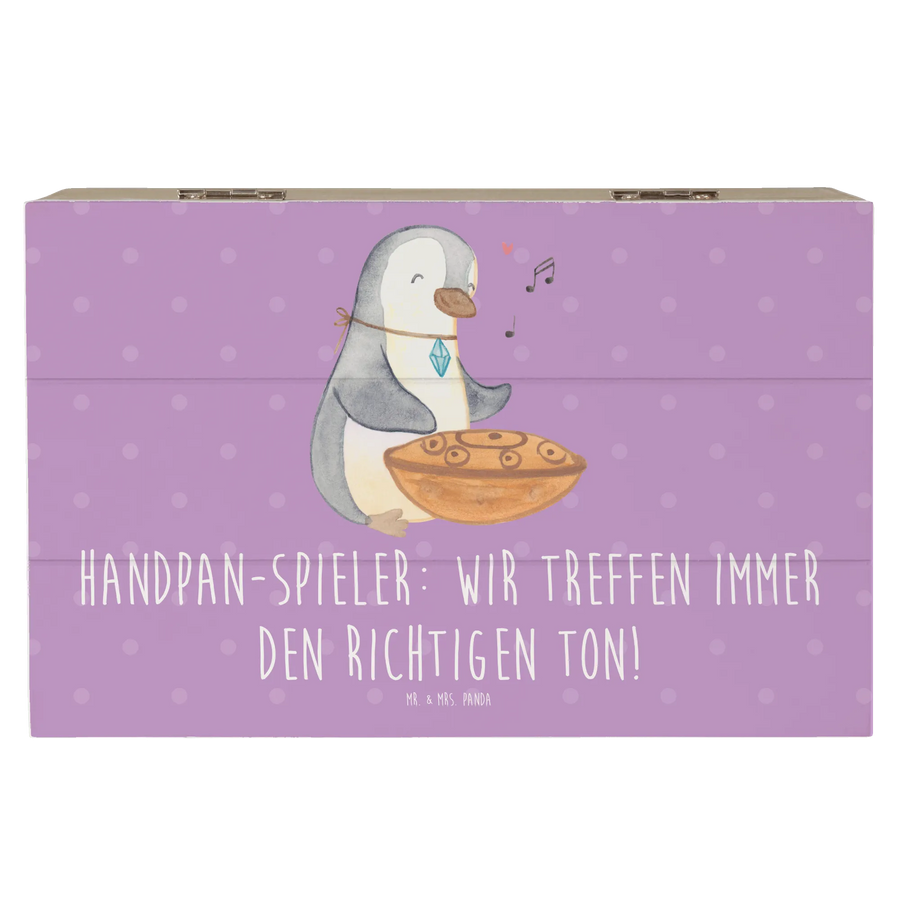 Die robuste Holzfaser sorgt dafür, dass diese Kiste besonders stabil und langlebig ist. Der besondere Clou? Die Kiste ist mit einem bezaubernden Handpan-Motiv verziert und wird von dem liebevollen Slogan 'Handpan-Spieler: Wir treffen immer den richtigen Ton!' begleitet.