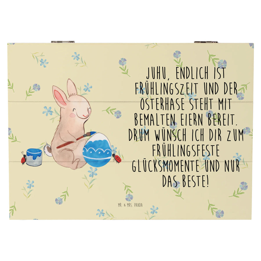 Das fröhliche Motiv des Osterhasen, der eifrig mit einem Pinsel Ostereier bemalt, während ihm kleine, niedliche Marienkäfer zur Seite stehen, bringt jedem ein Lächeln ins Gesicht. Die warmen Farben und die liebevollen Details machen diese Kiste zu einem echten Blickfang, der Jung und Alt gleichermaßen erfreut. Zudem ist die Kiste aus hochwertiger und robuster Holzfaser gefertigt, was sie besonders stabil und langlebig macht.