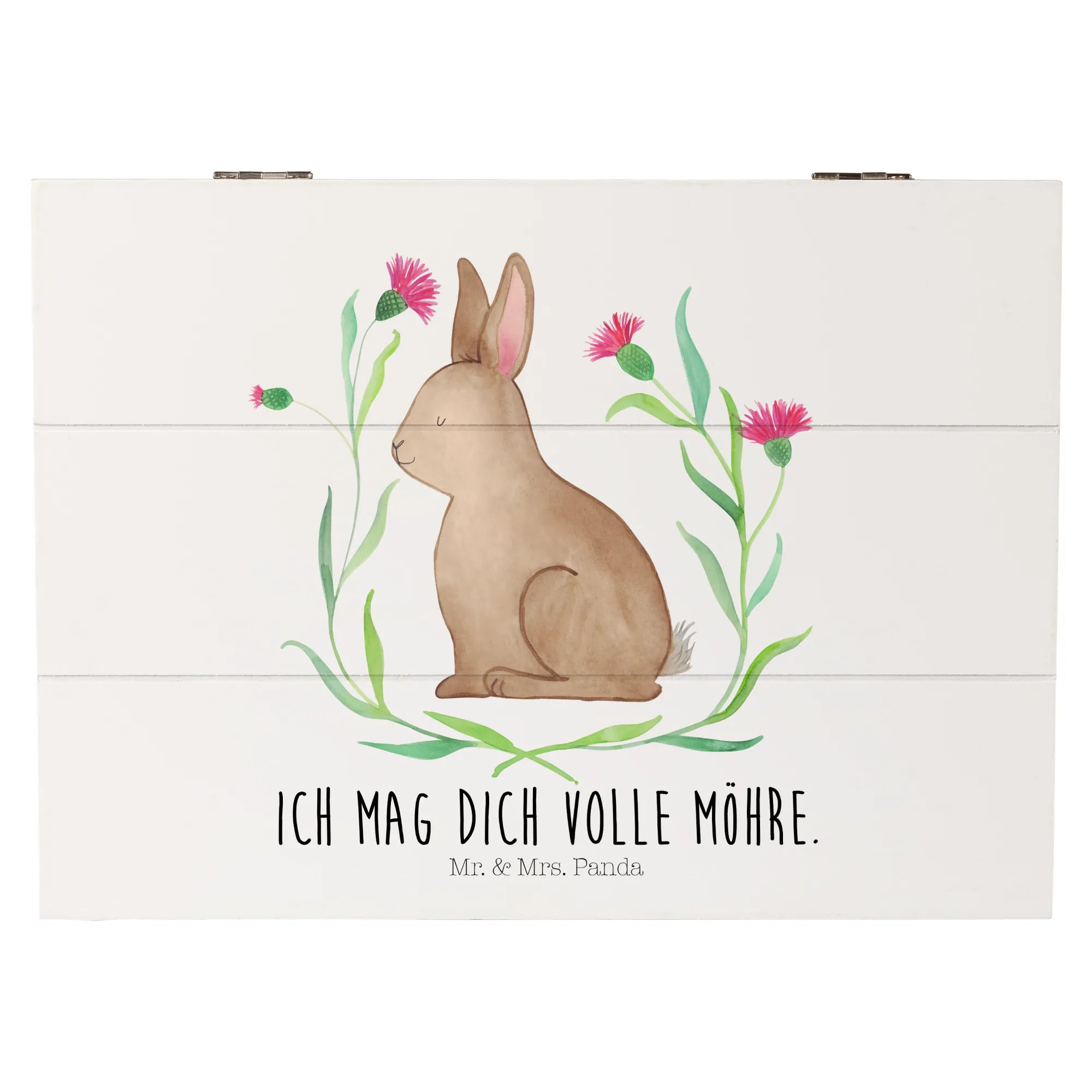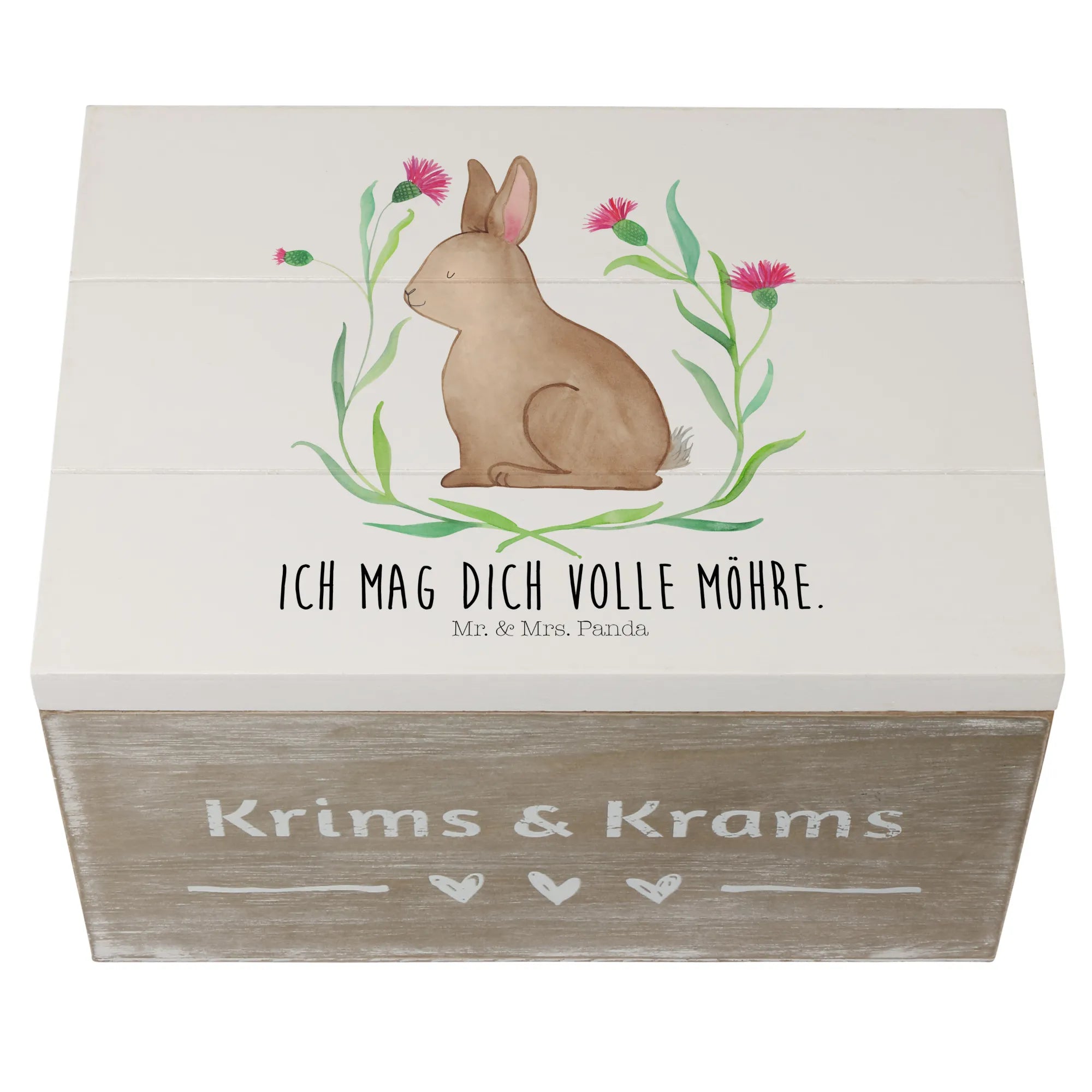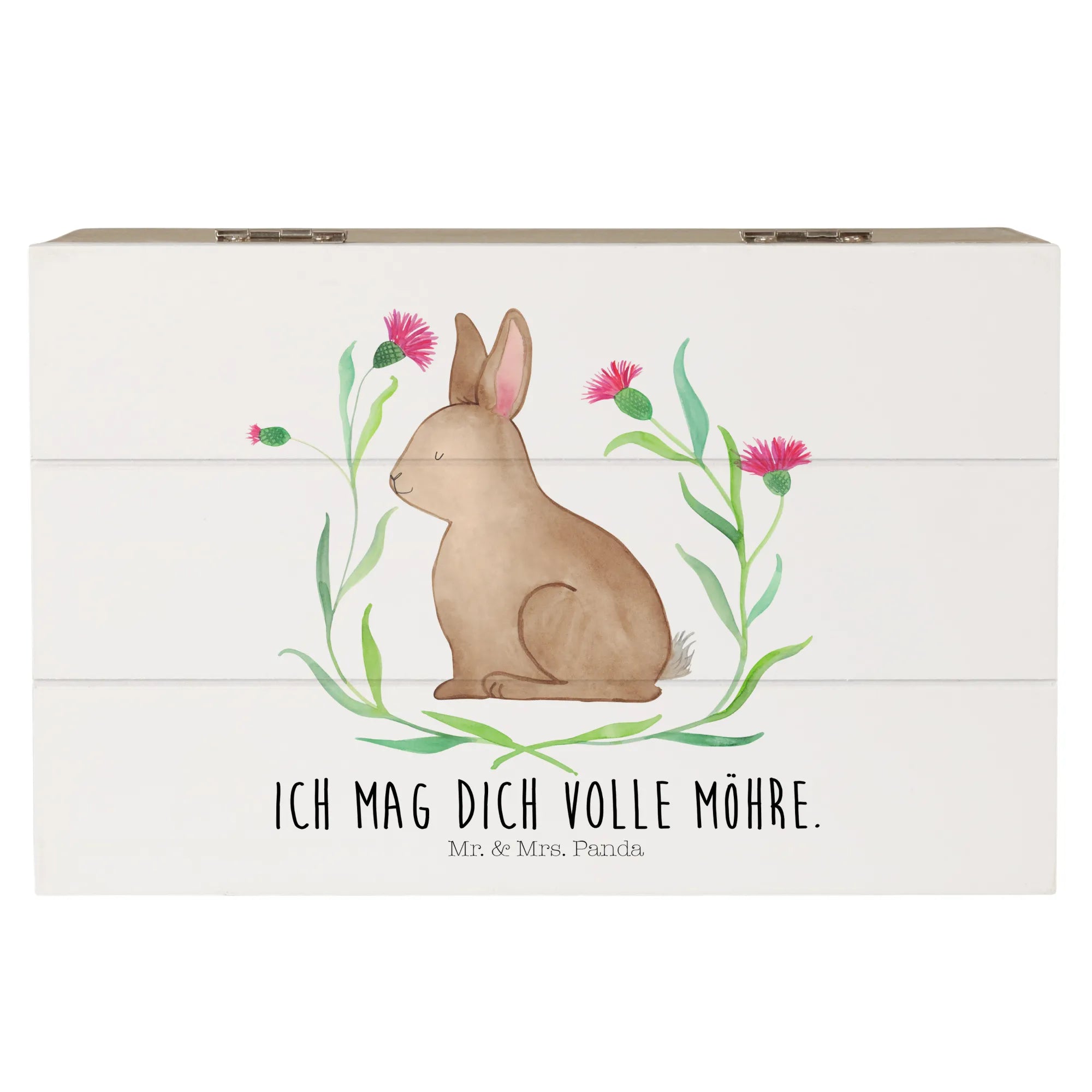 Die wunderschöne Holzkiste von Mr. & Mrs. Panda - dein perfekter Begleiter für das Osterfest! Mit dem entzückenden Design eines sitzenden Hasen, umgeben von bunten Blumen, bringt die Kiste nicht nur Freude ins Zuhause, sondern bietet auch einen ganz besonderen Ort für die interessantesten Schätze.