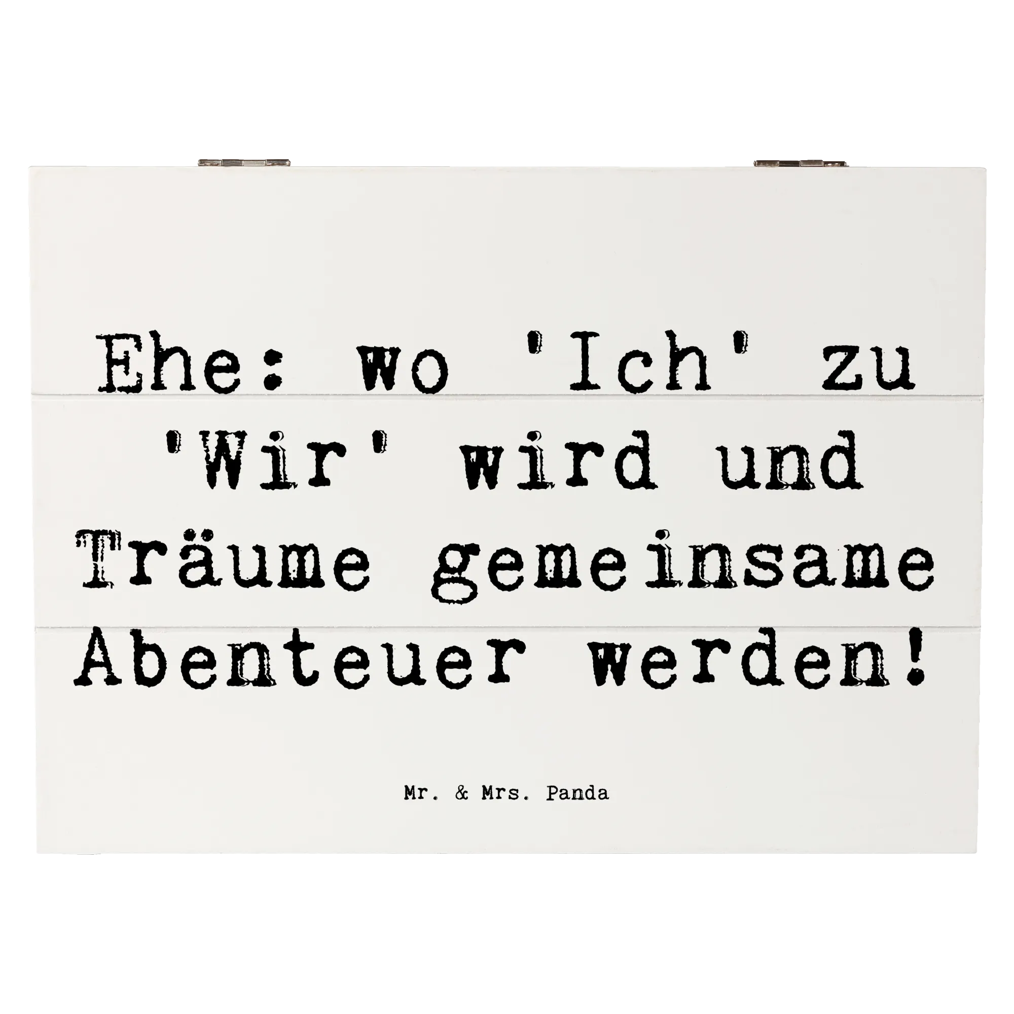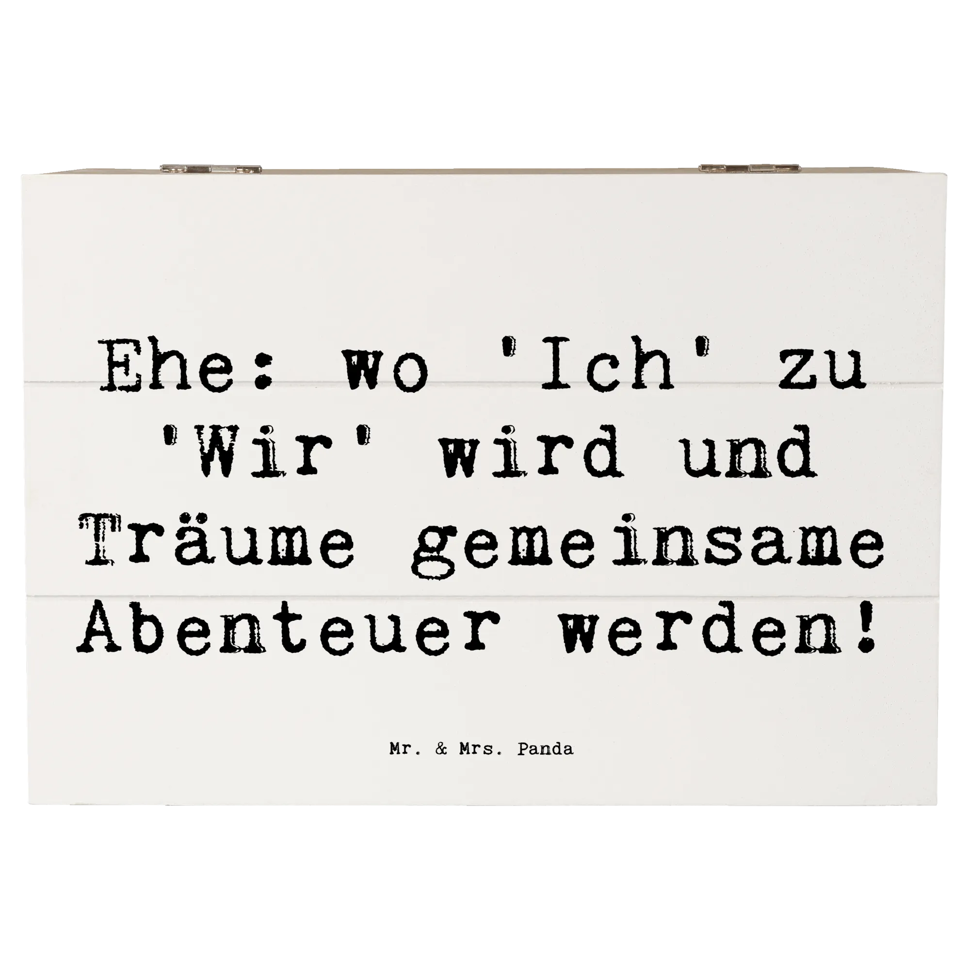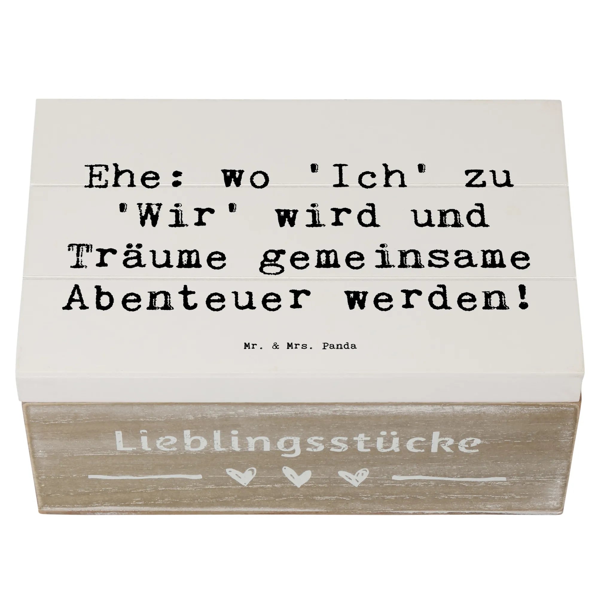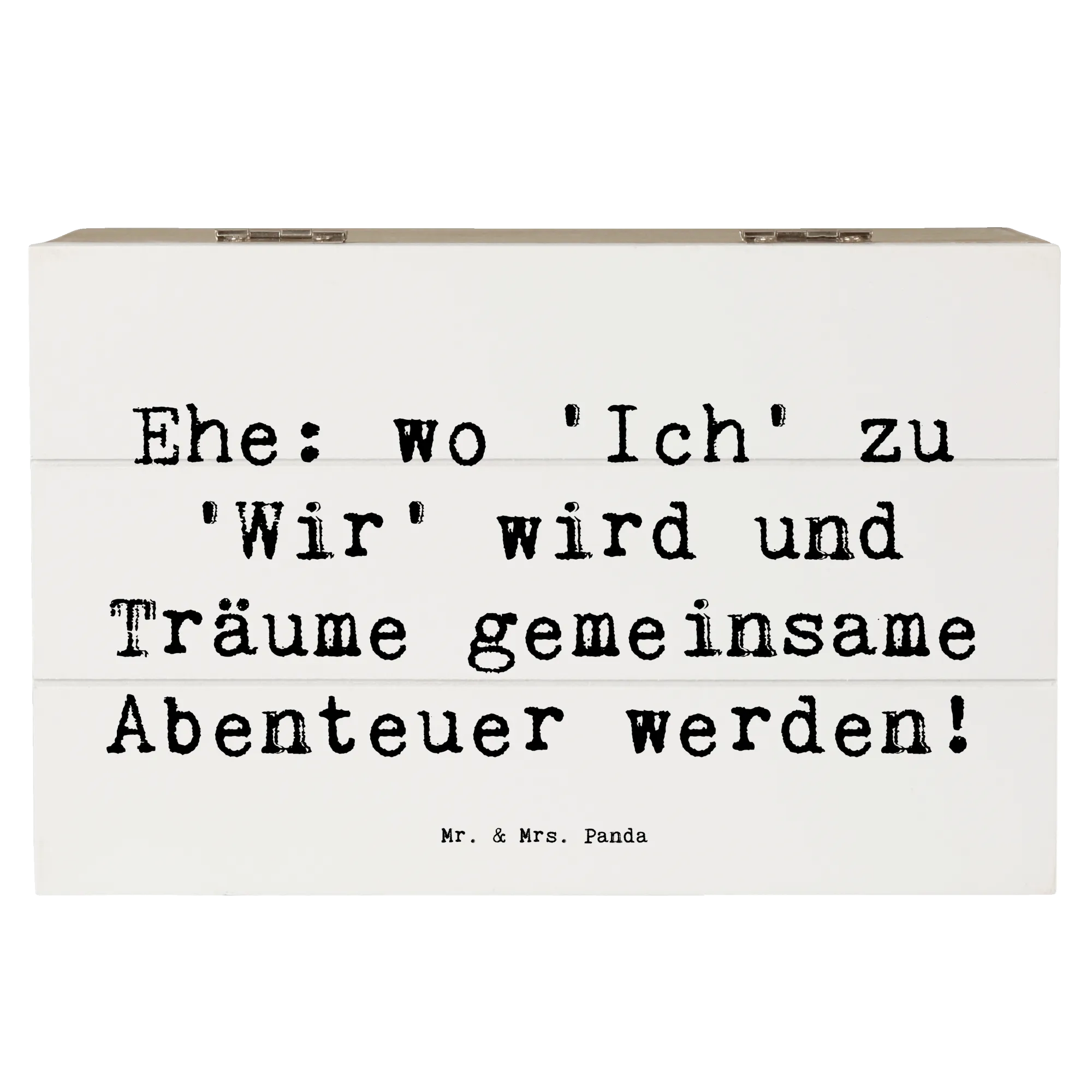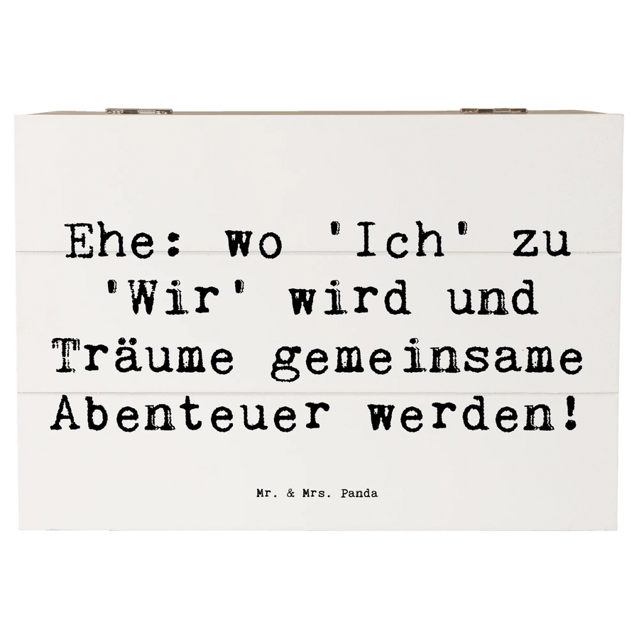 Diese wunderschöne Holzkiste von Mr. & Mrs. Panda ist das perfekte Geschenk zur Hochzeitsfeier! Sie hat einen besonderen Spruch mit dem Motto: "Ehe: wo 'Ich' zu 'Wir' wird und Träume gemeinsame Abenteuer werden!". Diese Erinnerungskiste ist ideal, um die wertvollsten Momente und Schätze des Paares aufzubewahren. Egal, ob die ersten gemeinsamen Fotos, Hochzeitseinladungen oder kleine Geschenke - alles findet in dieser stabilen und robusten Kiste einen wunderbaren Platz.