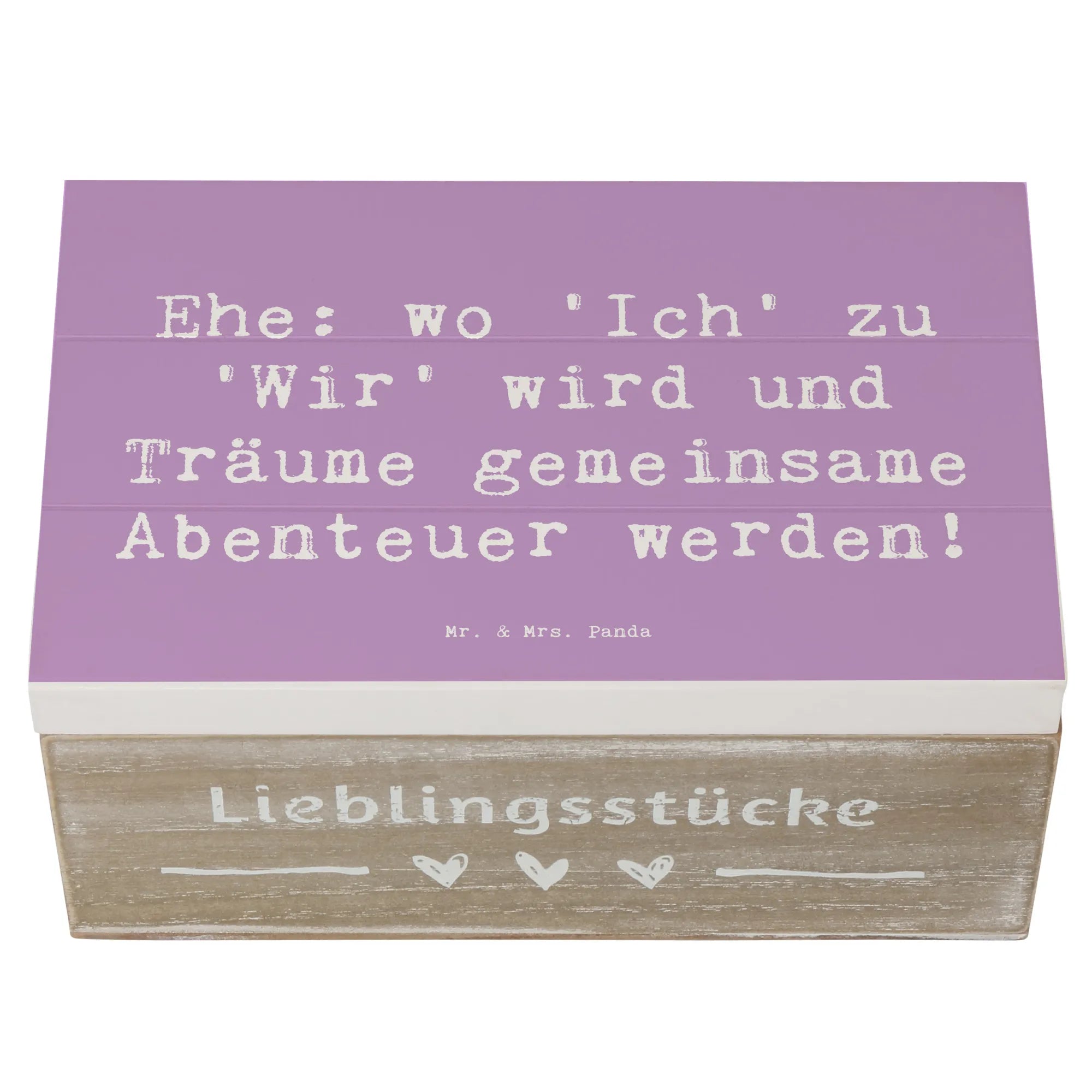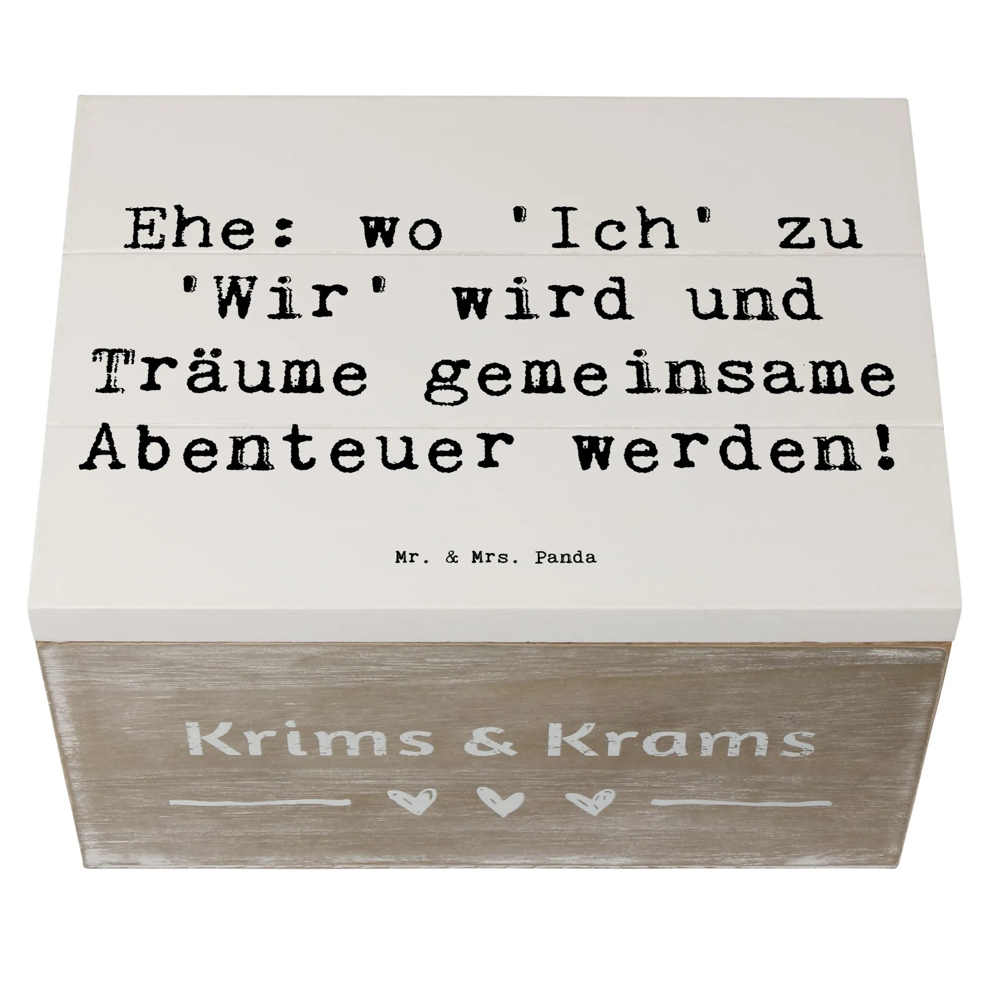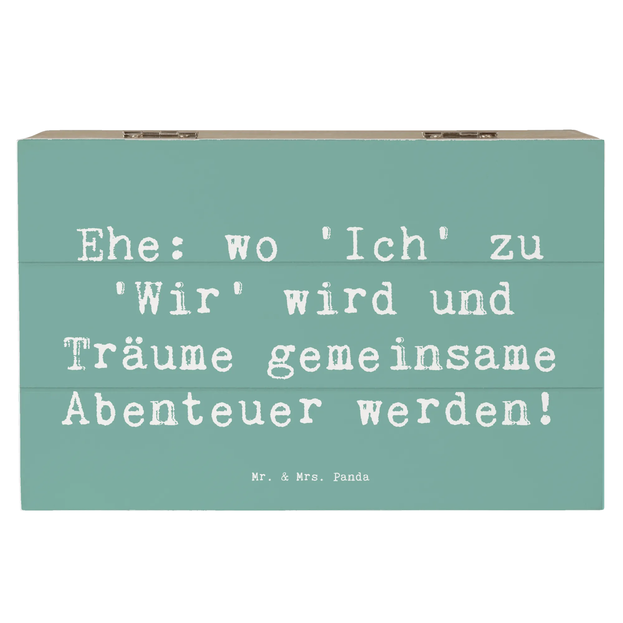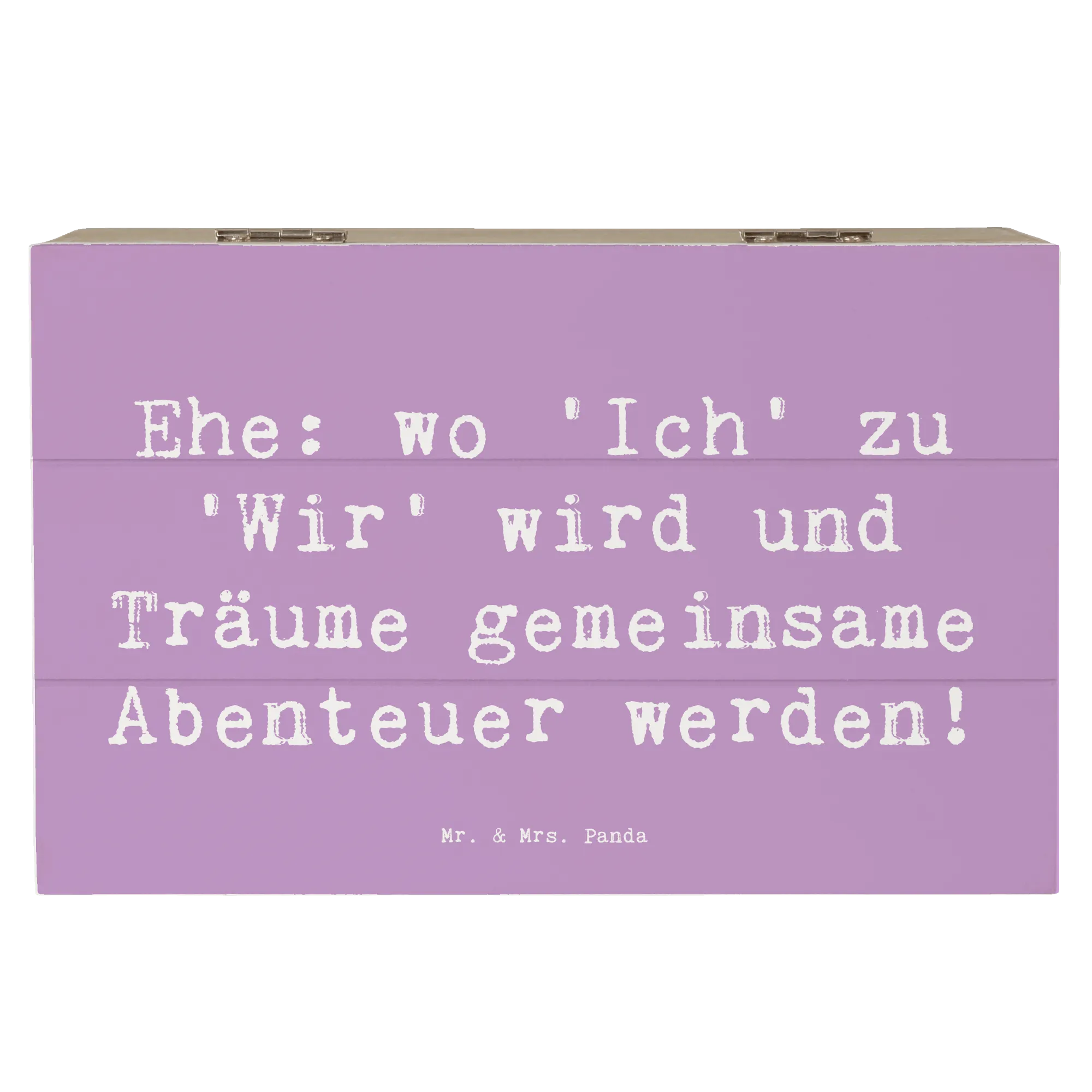 Diese wunderschöne Holzkiste von Mr. & Mrs. Panda ist das perfekte Geschenk zur Hochzeitsfeier! Sie hat einen besonderen Spruch mit dem Motto: "Ehe: wo 'Ich' zu 'Wir' wird und Träume gemeinsame Abenteuer werden!". Diese Erinnerungskiste ist ideal, um die wertvollsten Momente und Schätze des Paares aufzubewahren. Egal, ob die ersten gemeinsamen Fotos, Hochzeitseinladungen oder kleine Geschenke - alles findet in dieser stabilen und robusten Kiste einen wunderbaren Platz.