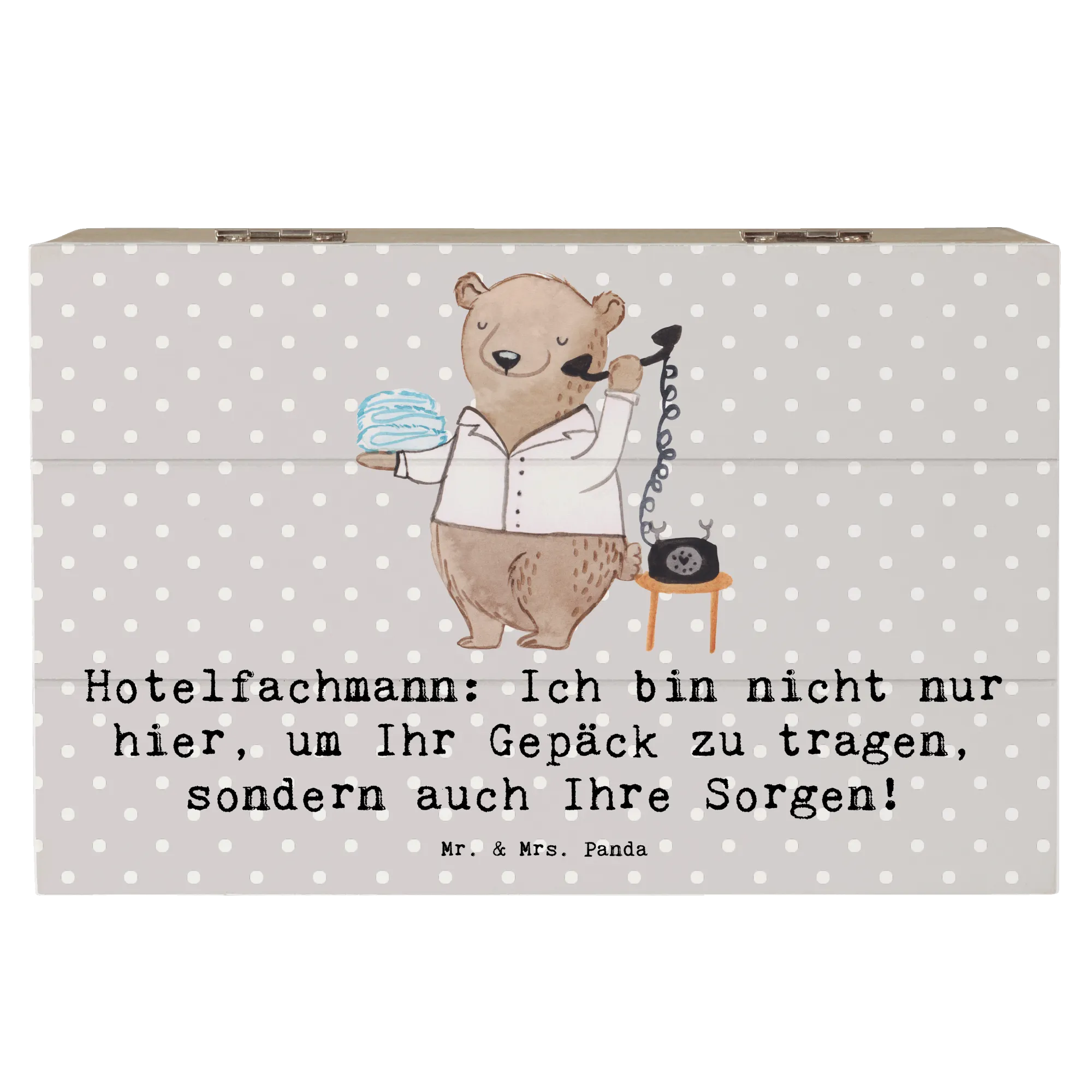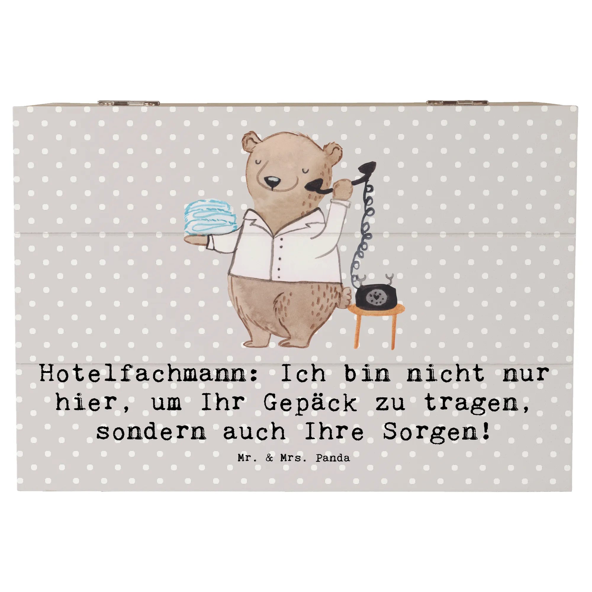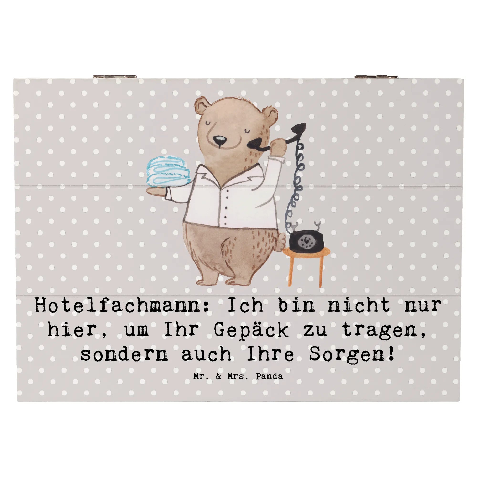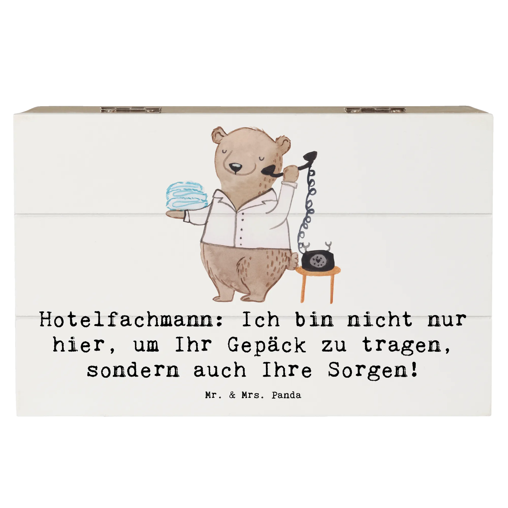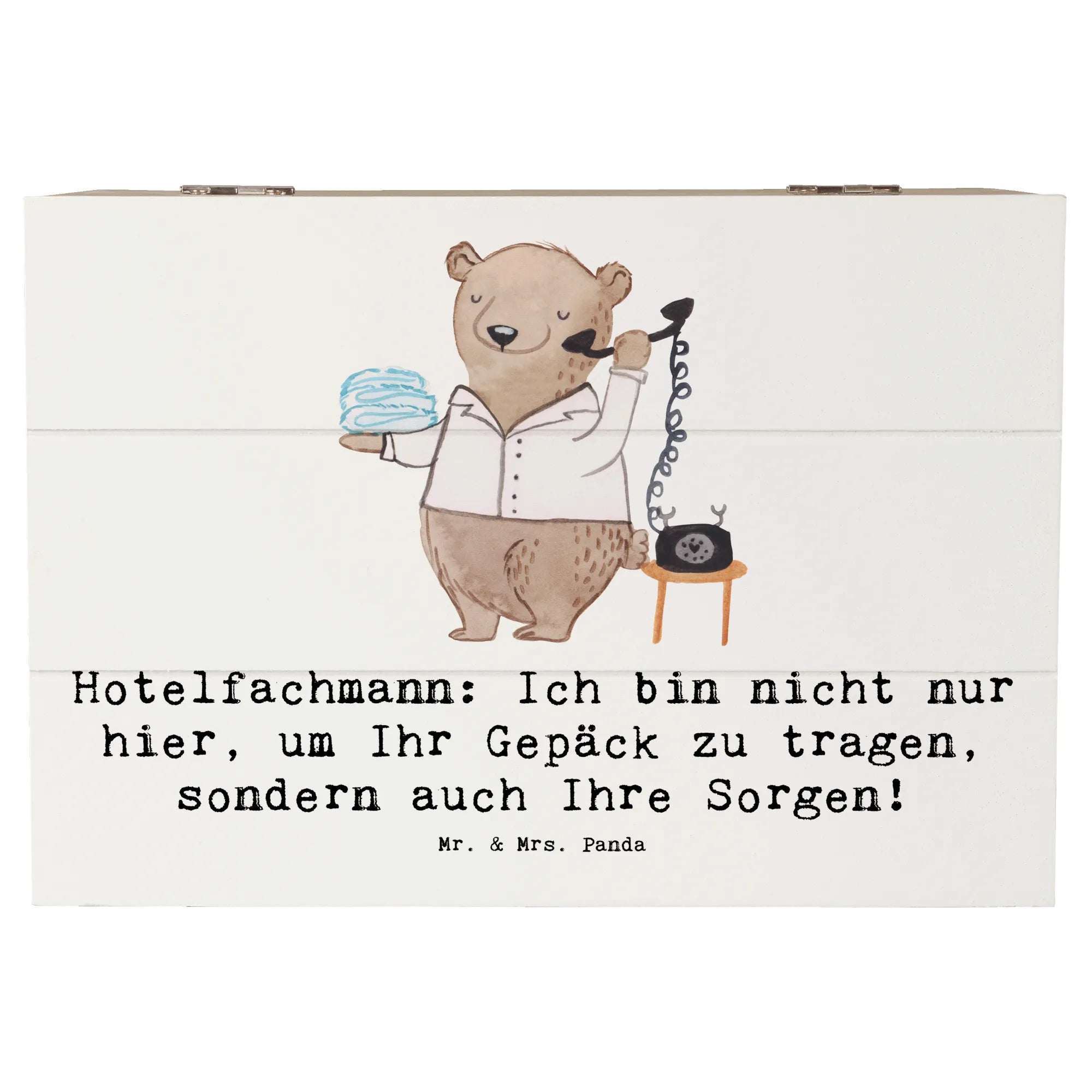 Entdecke die zauberhafte Holzkiste von Mr. & Mrs. Panda mit dem Motiv "Hotelfachmann"! Diese ausgesprochen charmante Kiste ist nicht nur ein Blickfang, sondern auch der ideale Aufbewahrungsort für all Deine wertvollen Schätze.