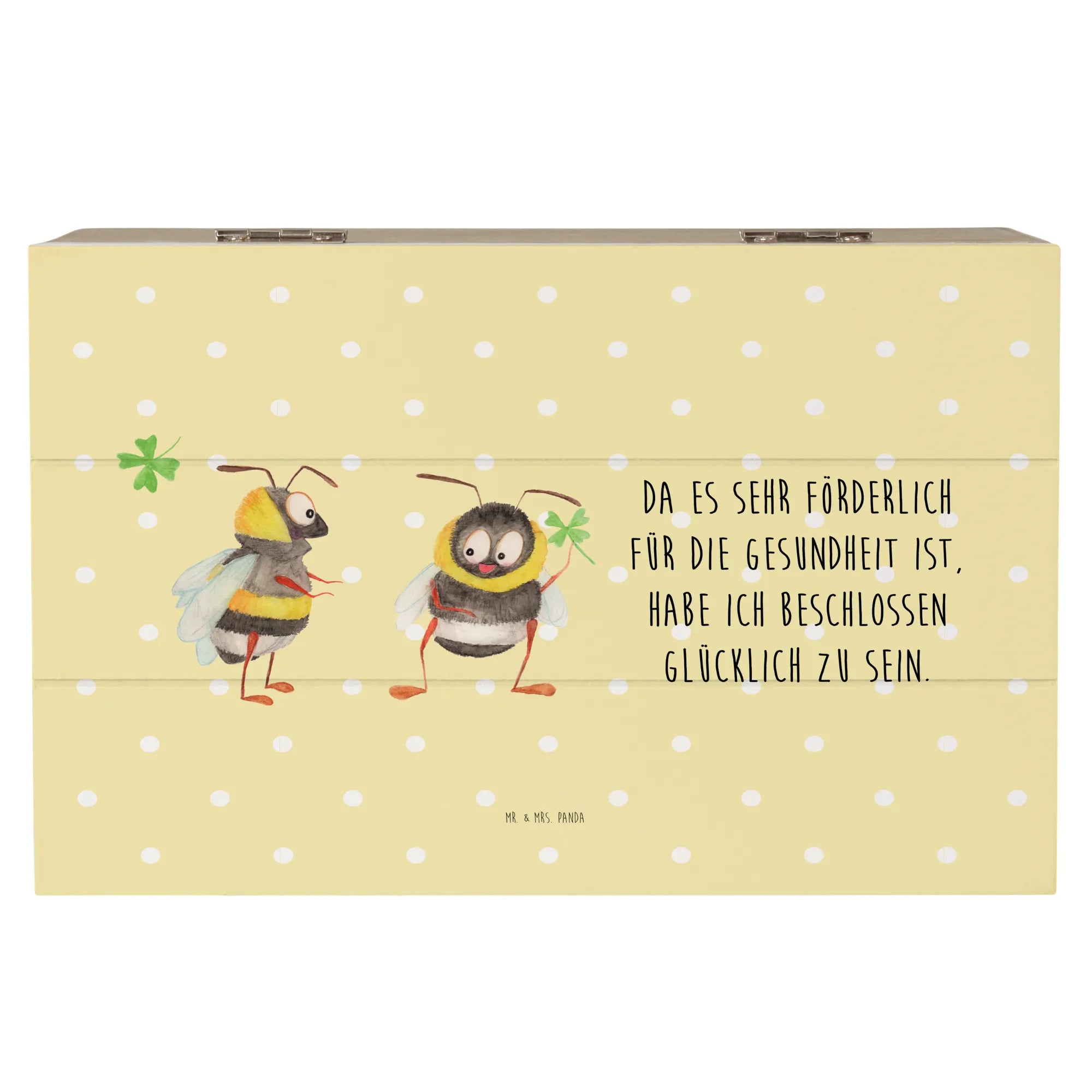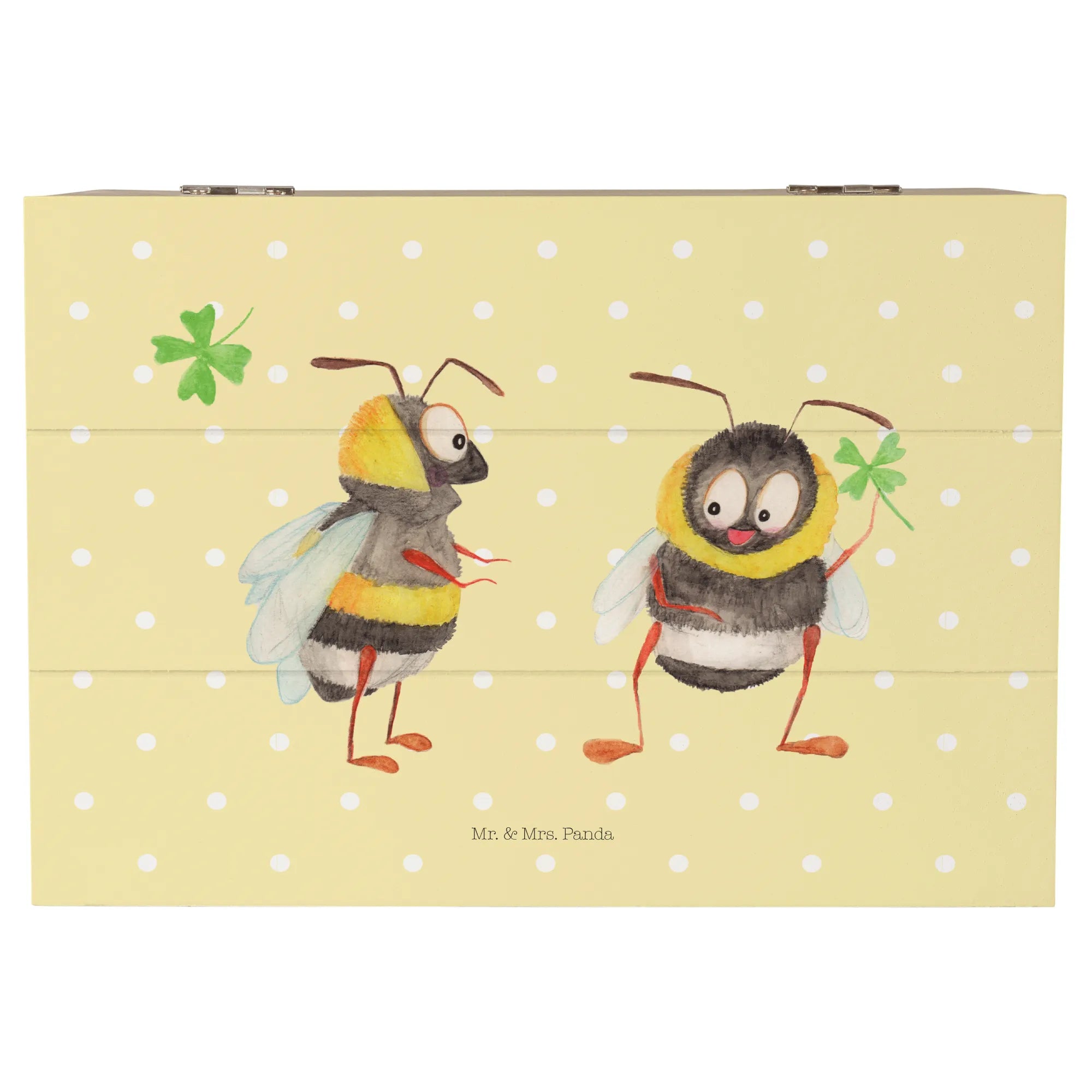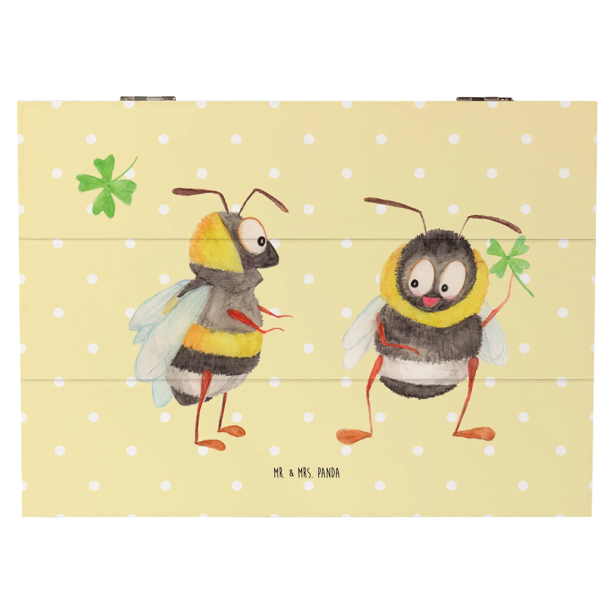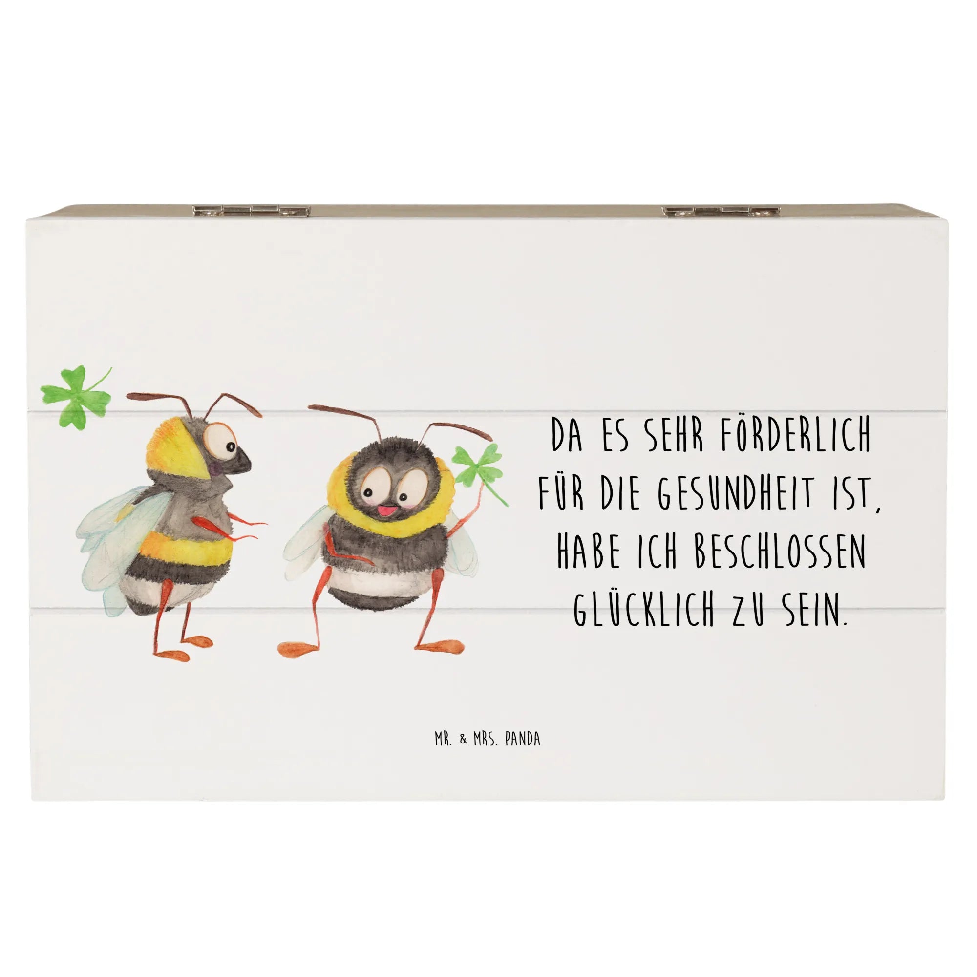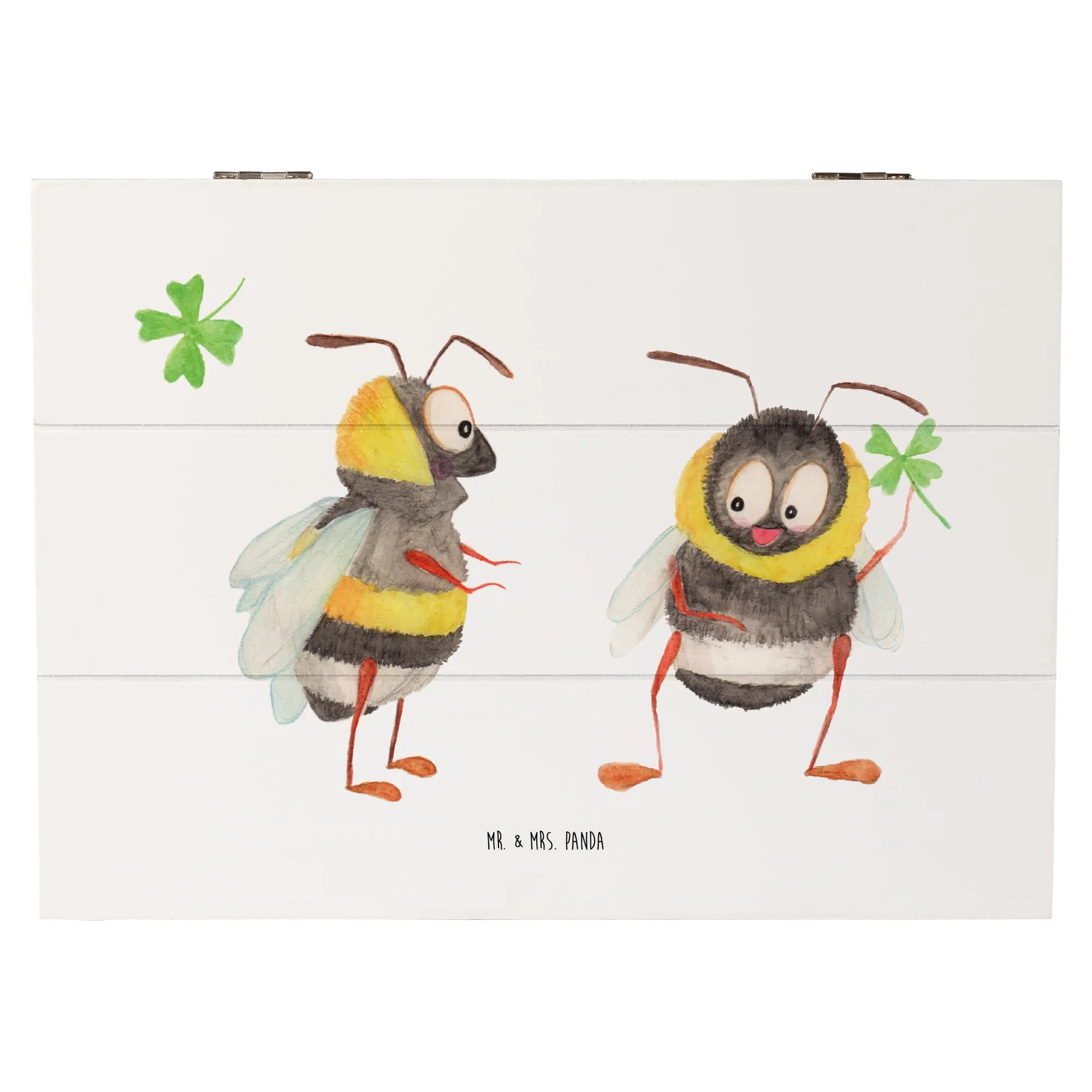 Entdecke die bezaubernde Holzkiste "Hummeln mit Kleeblatt" von Mr. & Mrs. Panda! Diese wunderschöne Kiste ist nicht nur ein Platz für all deine Schätze, sondern auch ein liebevolles Geschenk für viele besondere Anlässe.
