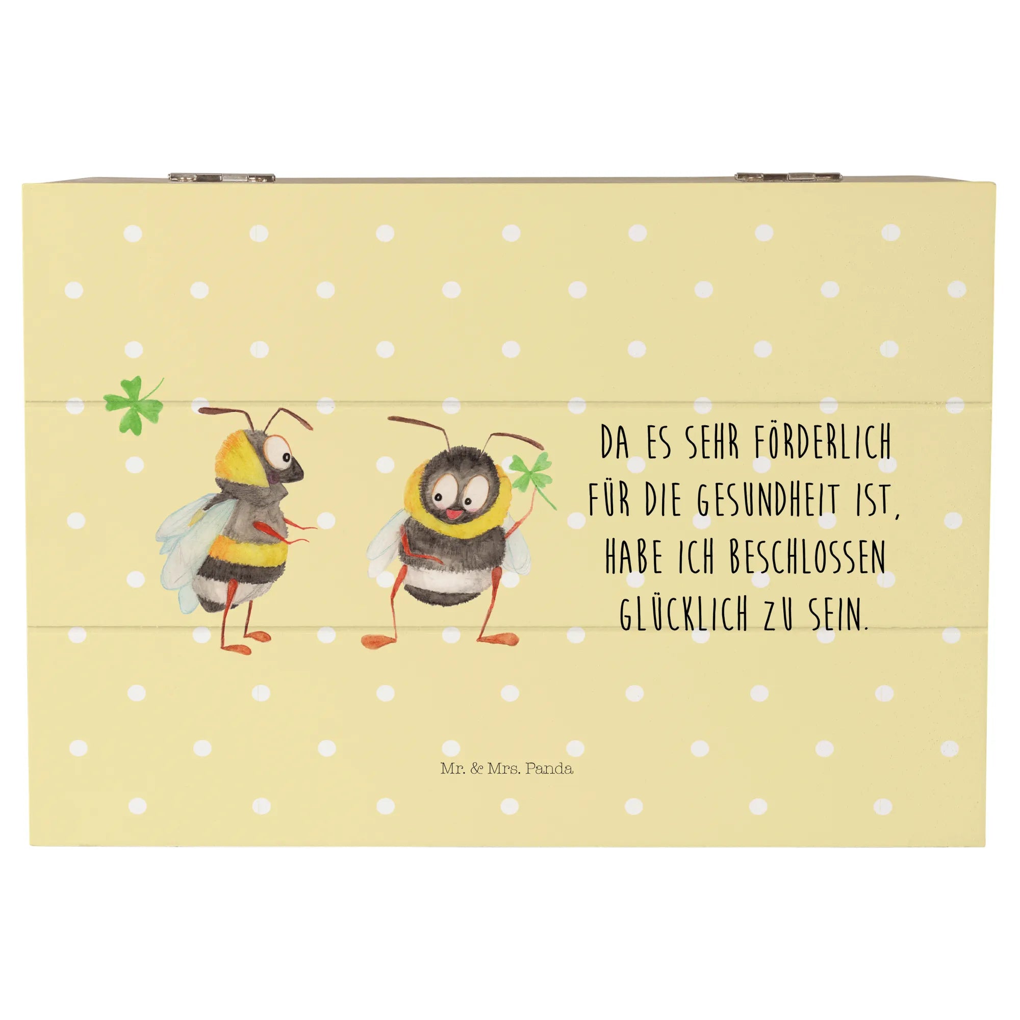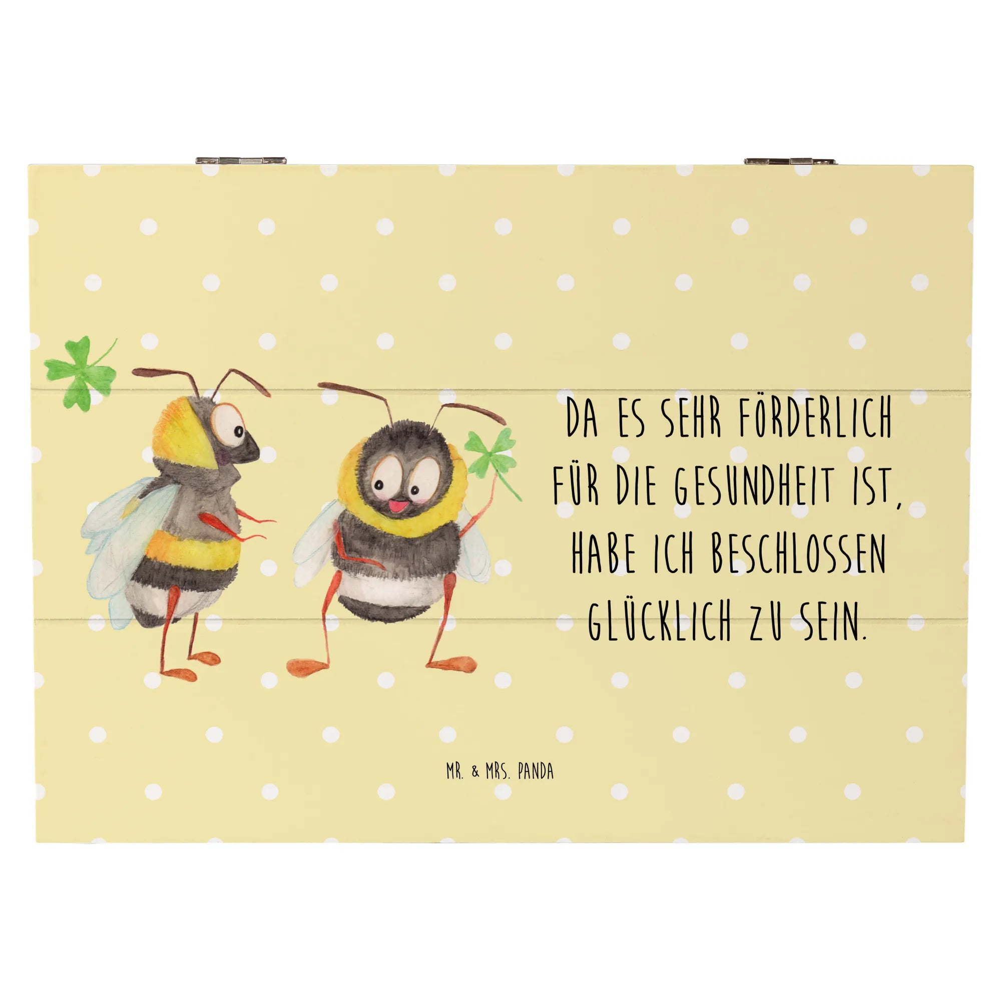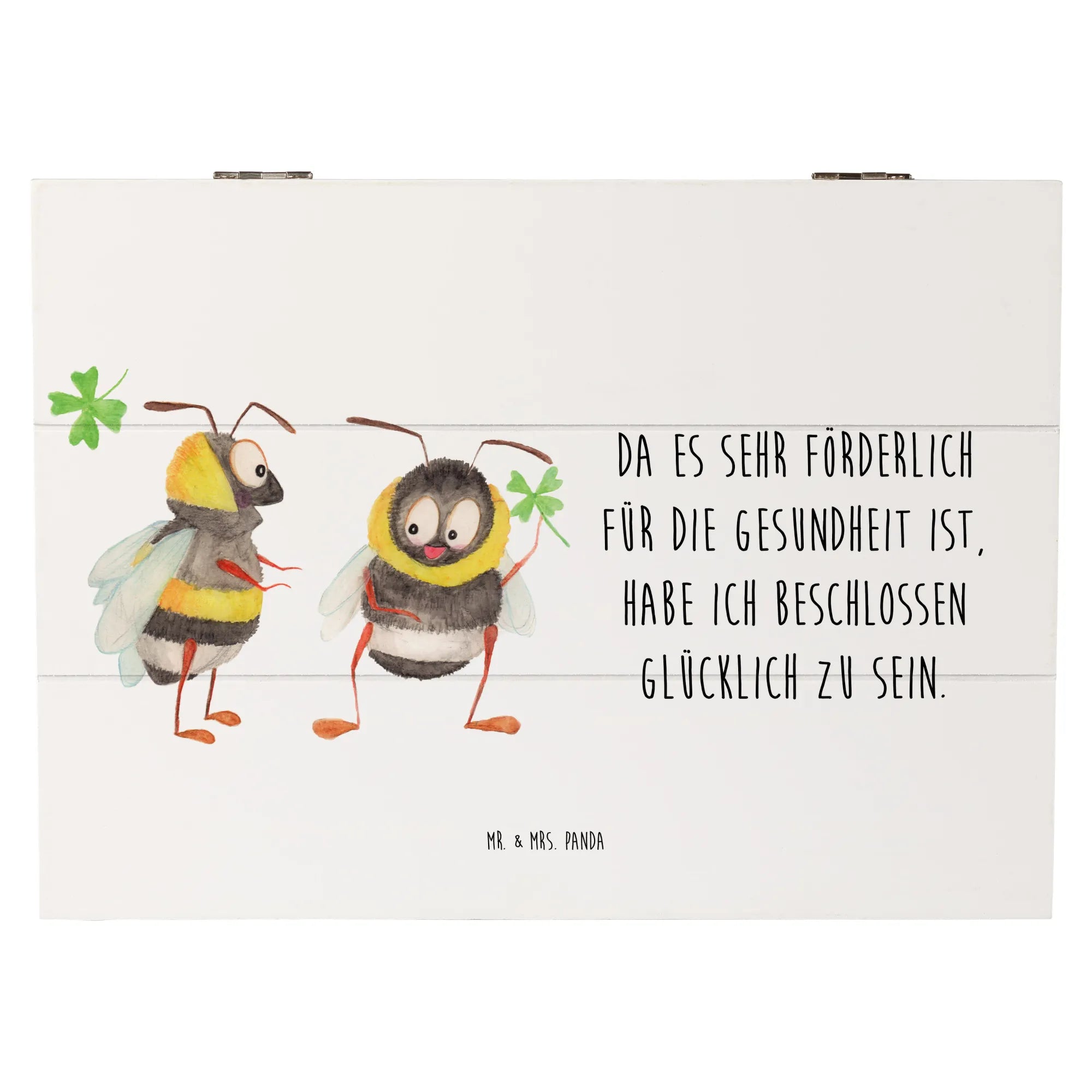 Diese zauberhafte Kiste von Mr. & Mrs. Panda ist nicht nur praktisch, sondern auch ein echter Blickfang. Die beiden süßen Hummeln, die das Kleeblatt präsentieren, verkörpern Glück, Einheit und Verbundenheit – perfekte Symbole für besondere Momente! Mit der inspirierenden Botschaft 'Da es sehr förderlich für die Gesundheit ist, habe ich beschlossen, glücklich zu sein.' auf der Schatulle, wird jeder, der sie sieht, ein Lächeln auf den Lippen haben.