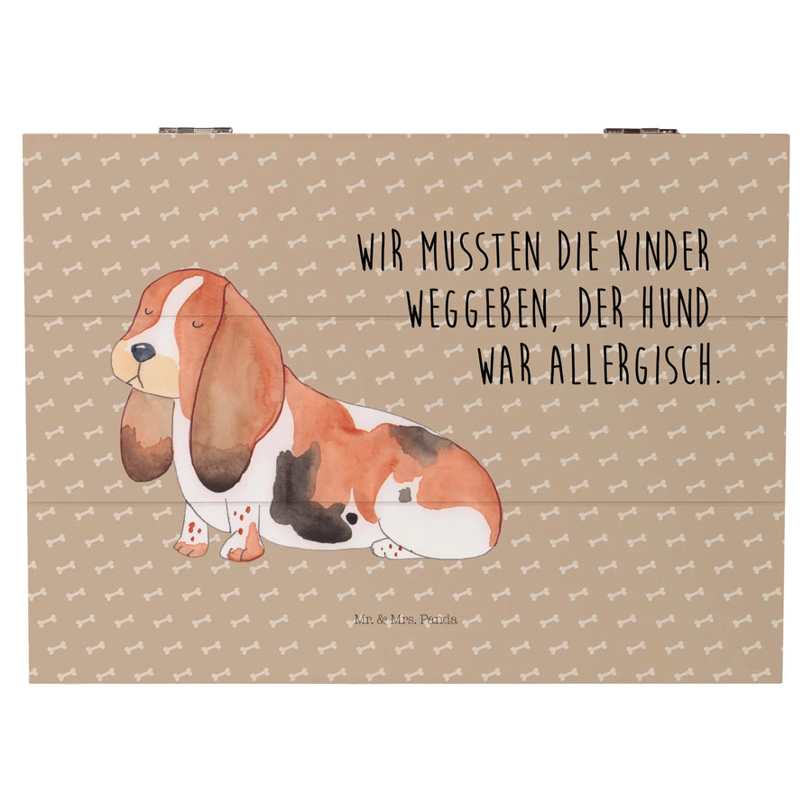 Hast du schon die perfekte Geschenkidee für einen Tierliebhaber in deinem Leben? 🎁 Diese bezaubernde Holzkiste mit dem süßen Basset Hound Motiv ist das ideale Präsent für Hundebesitzer und alle, die Hunde lieben! Bei Mr. & Mrs. Panda haben wir diese wunderschöne Holzbox nicht nur mit tierischen Motiven, sondern auch mit einem humorvollen Spruch kreiert: "Wir mussten die Kinder weggeben. Der Hund war allergisch." Diese Kiste ist perfekt, um besondere Erinnerungen und kleine Schätze aufzubewahren, sei es für die ersten Hundepfotabdrücke, Fotos von gemeinsamen Abenteuern oder auch für Hundespielzeug.