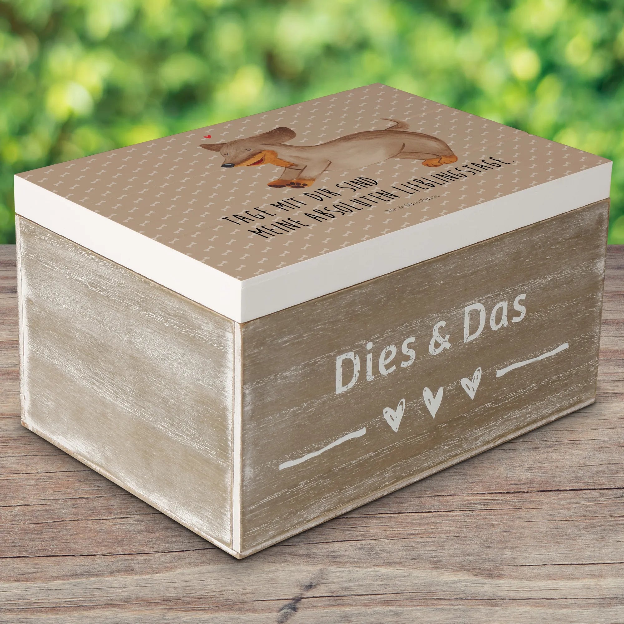 Entdecke die zauberhafte Holzkiste mit dem fröhlichen Dackel-Motiv von Mr. & Mrs. Panda! Diese wunderschöne Kiste ist mehr als nur ein Aufbewahrungsort; sie ist ein wahrer Schatz für jeden Hundeliebhaber. Der liebevolle Dackel auf der Kiste und der herzliche Slogan „Tage mit dir sind meine absoluten Lieblingstage“ machen sie zu einem perfekten Geschenk.