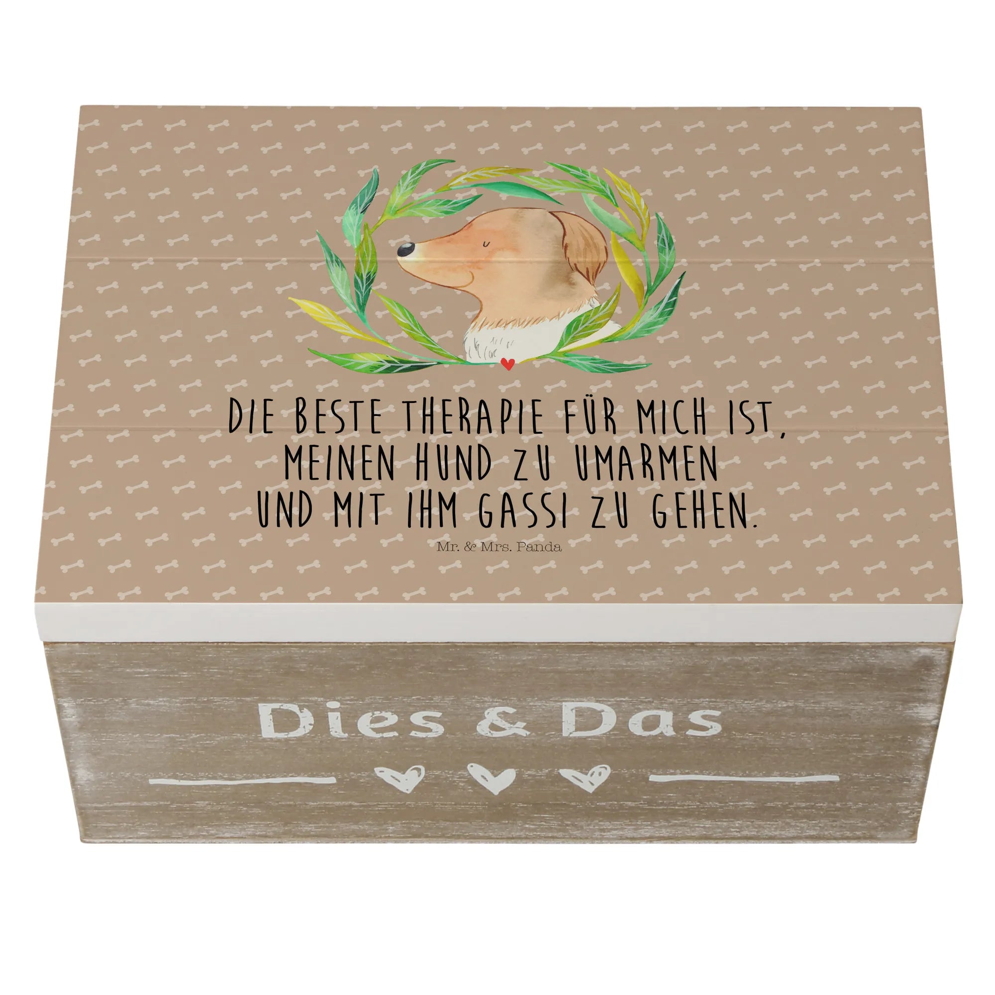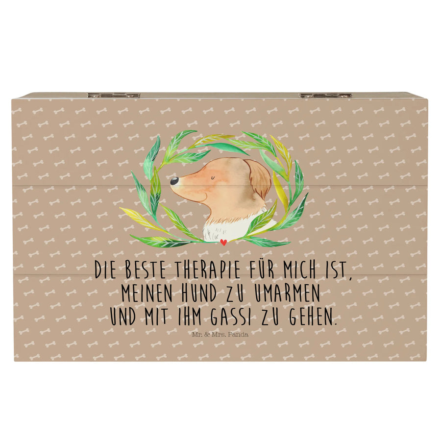 Die Holzkiste aus der Hunde Kollektion von Mr. & Mrs. Panda ist nicht nur ein echter Hingucker, sondern auch der ideale Ort, um Deine kostbaren Erinnerungen aufzubewahren. Mit einem liebevollen Motiv eines niedlichen Hundes mit einer Blume in der Hand und dem inspirierenden Spruch: 'Die beste Therapie für mich ist, meinen Hund zu umarmen und mit ihm Gassi zu gehen.' zaubert diese Kiste Dir stets ein Lächeln ins Gesicht.
