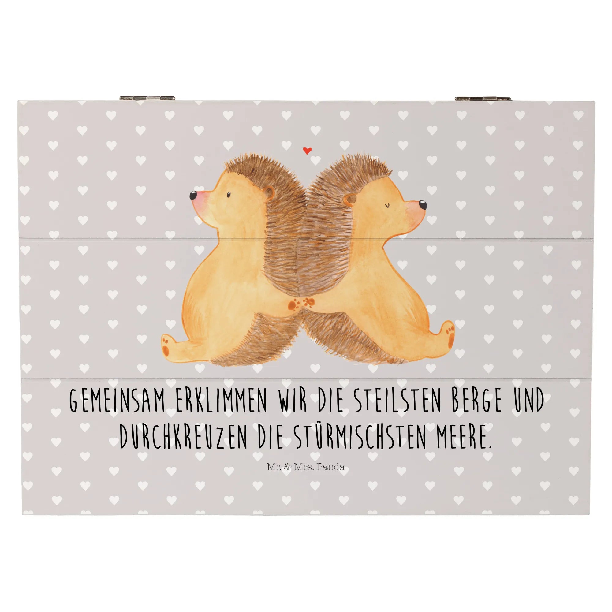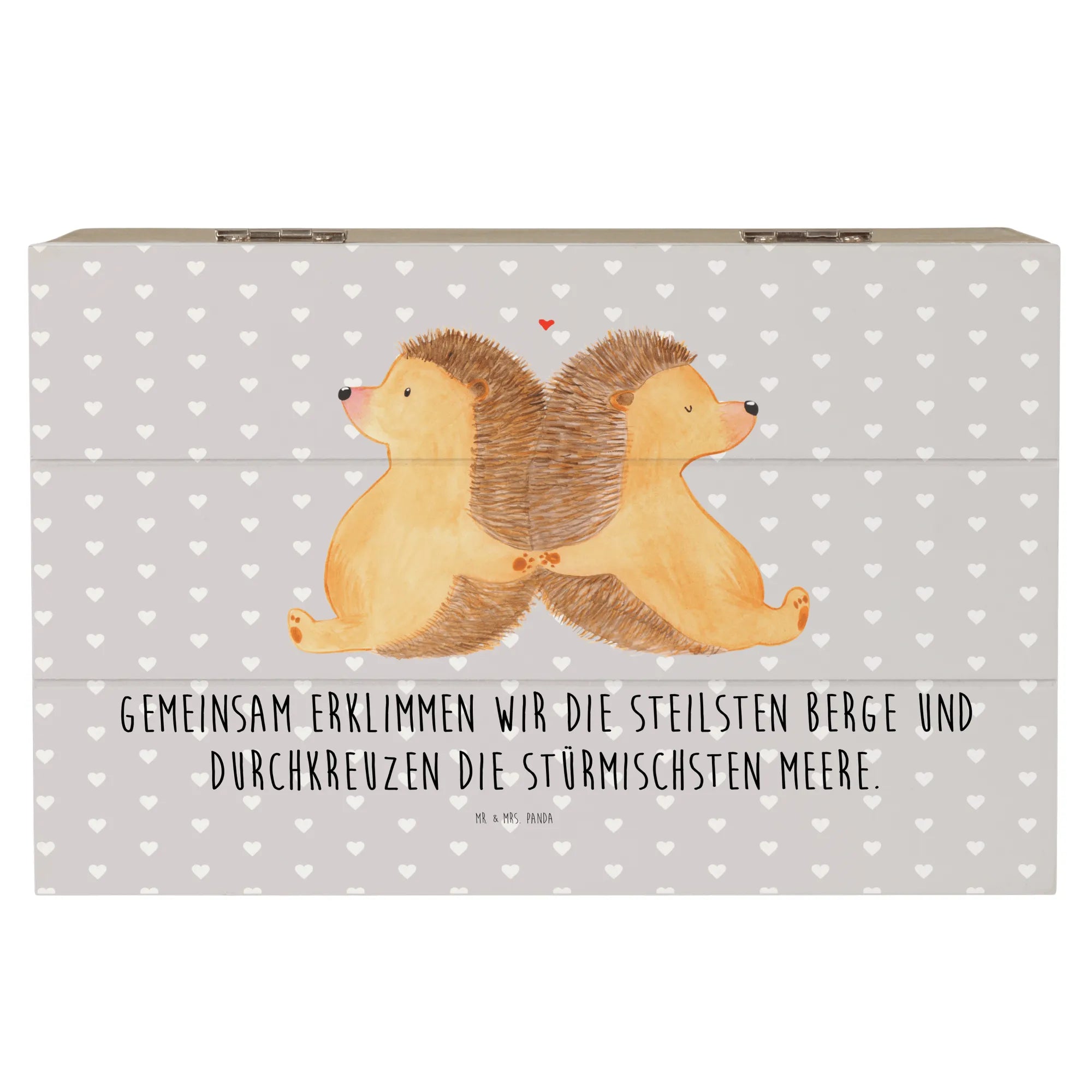 Entdecke die zauberhafte Holzkiste mit dem Motiv "Igel händchenhaltend" von Mr. & Mrs. Panda! Diese wunderschöne Kiste ist das perfekte Geschenk für Paare und Verliebte, um gemeinsame Erinnerungen aufzubewahren.