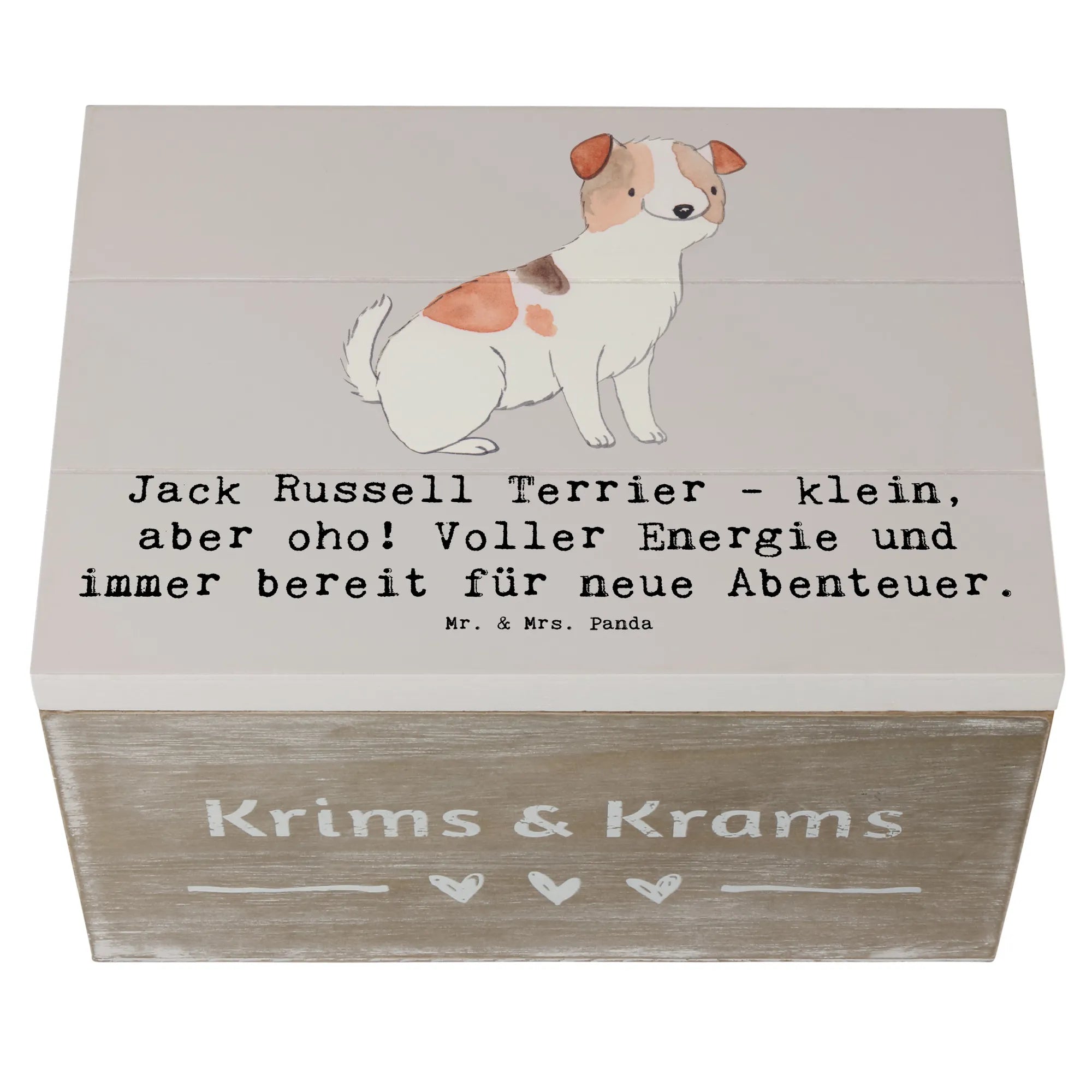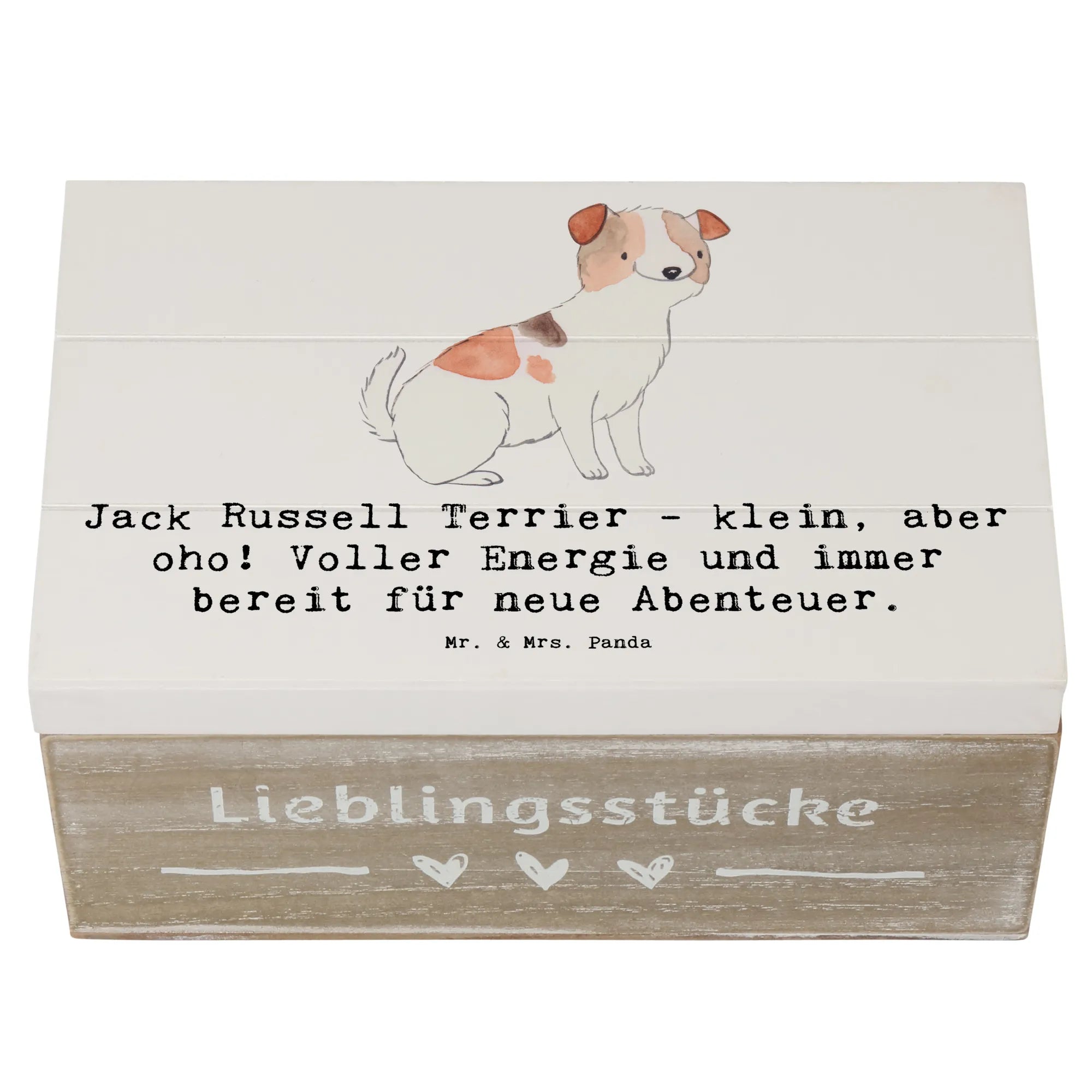 Die Hunderassen Kollektion von Mr. & Mrs. Panda bringt die süßesten Hunde aller gängigen Rassen auf wundervolle Art und Weise zusammen und überzeugt mit ihren niedlichen Sprüchen. Lass die Jack Russell Terrier Holzkiste Deinen Raum verschönern und gleichsam zu einem Sammelort für unvergessliche Momente werden. Diese künstlerisch gestaltete Erinnerungskiste ist perfekt für alle, die ihre Schätze stilvoll aufbewahren möchten.