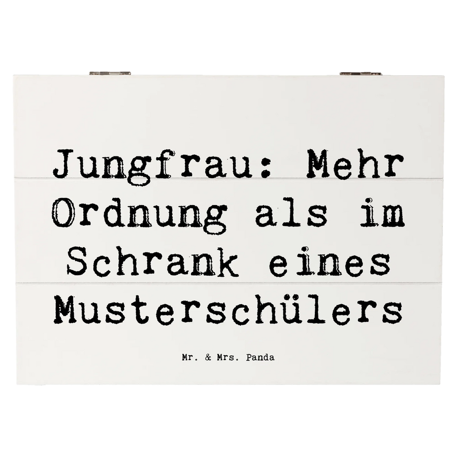 Die Holzkiste "Jungfrau" von Mr. & Mrs. Panda ist der perfekte Begleiter für all jene, die Liebe zur Ordnung und zum Detail schätzen. Mit einem liebevoll gestalteten Motiv und dem charmanten Spruch "Jungfrau: Mehr Ordnung als im Schrank eines Musterschülers" bringt diese Kiste nicht nur einen Hauch von Persönlichkeit in dein Zuhause, sondern bietet auch einen praktischen Platz für all deine Schätze und Erinnerungen.