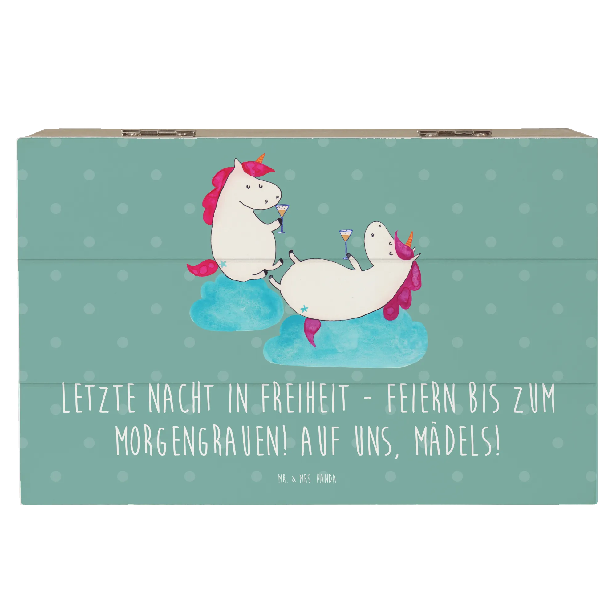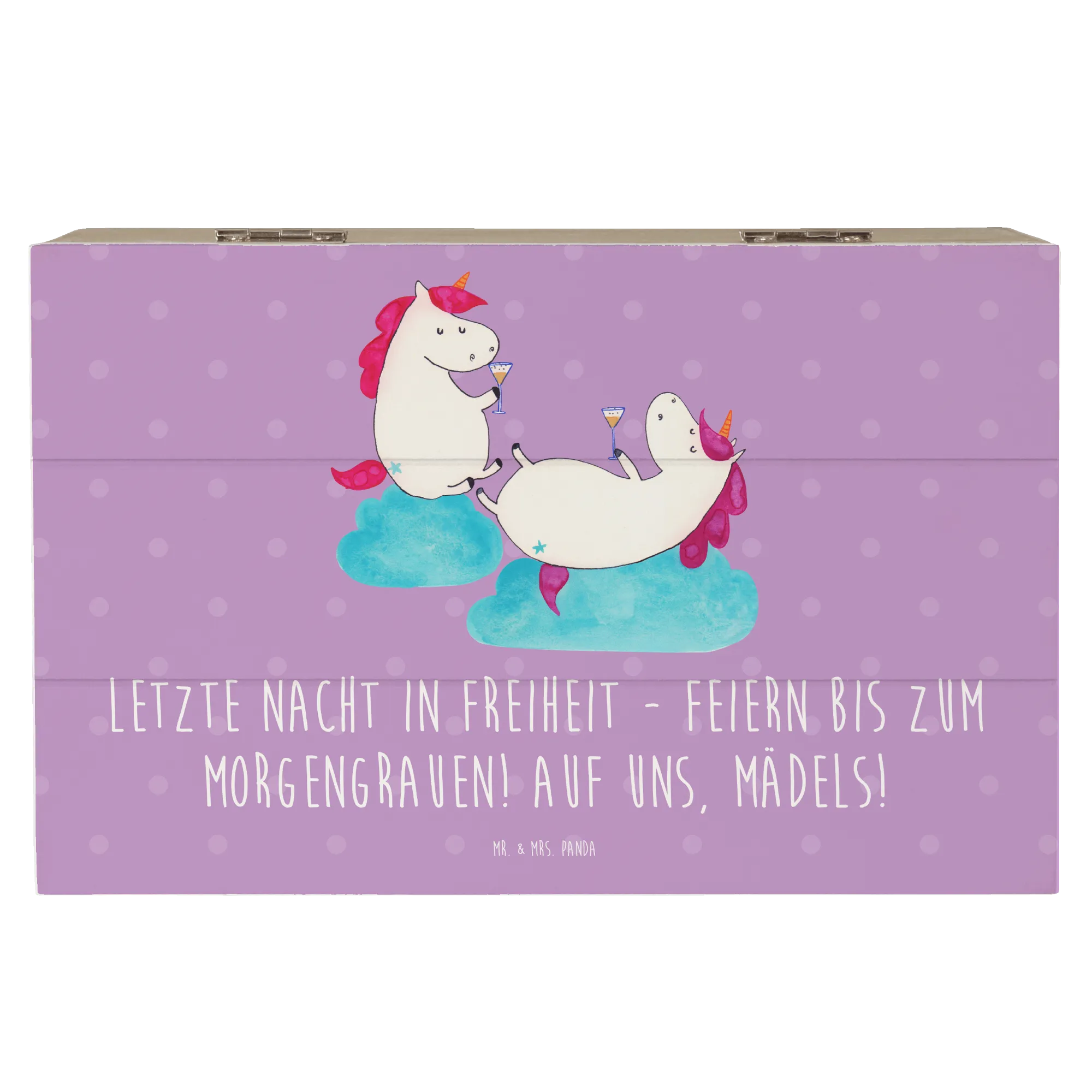 Entdecke die wundervolle Holzkiste für den Junggesellinnenabschied aus der zauberhaften Hochzeitskollektion von Mr. & Mrs. Panda! Diese liebevoll gestaltete Kiste ist nicht nur ein praktischer Aufbewahrungsort für fantastische Schätze, sondern auch ein unvergessliches Andenken an den besonderen Tag. Mit dem charmanten Motiv "Letzte Nacht in Freiheit - Feiern bis zum Morgengrauen! Auf uns, Mädels!" zieht sie die Blicke auf sich und sorgt für beste Stimmung.